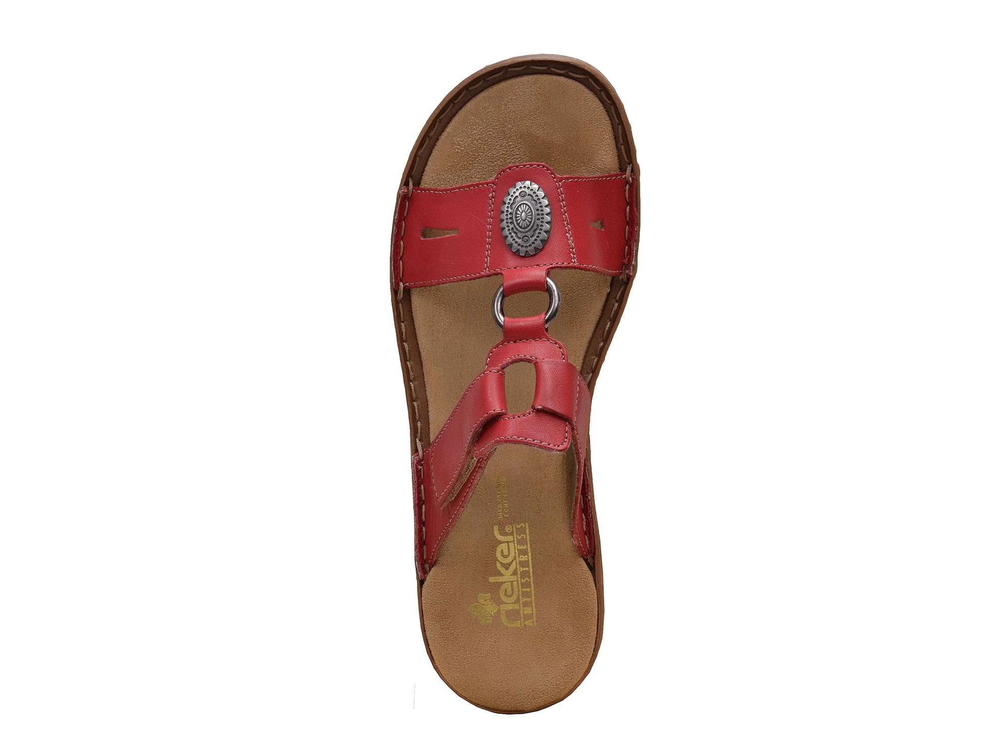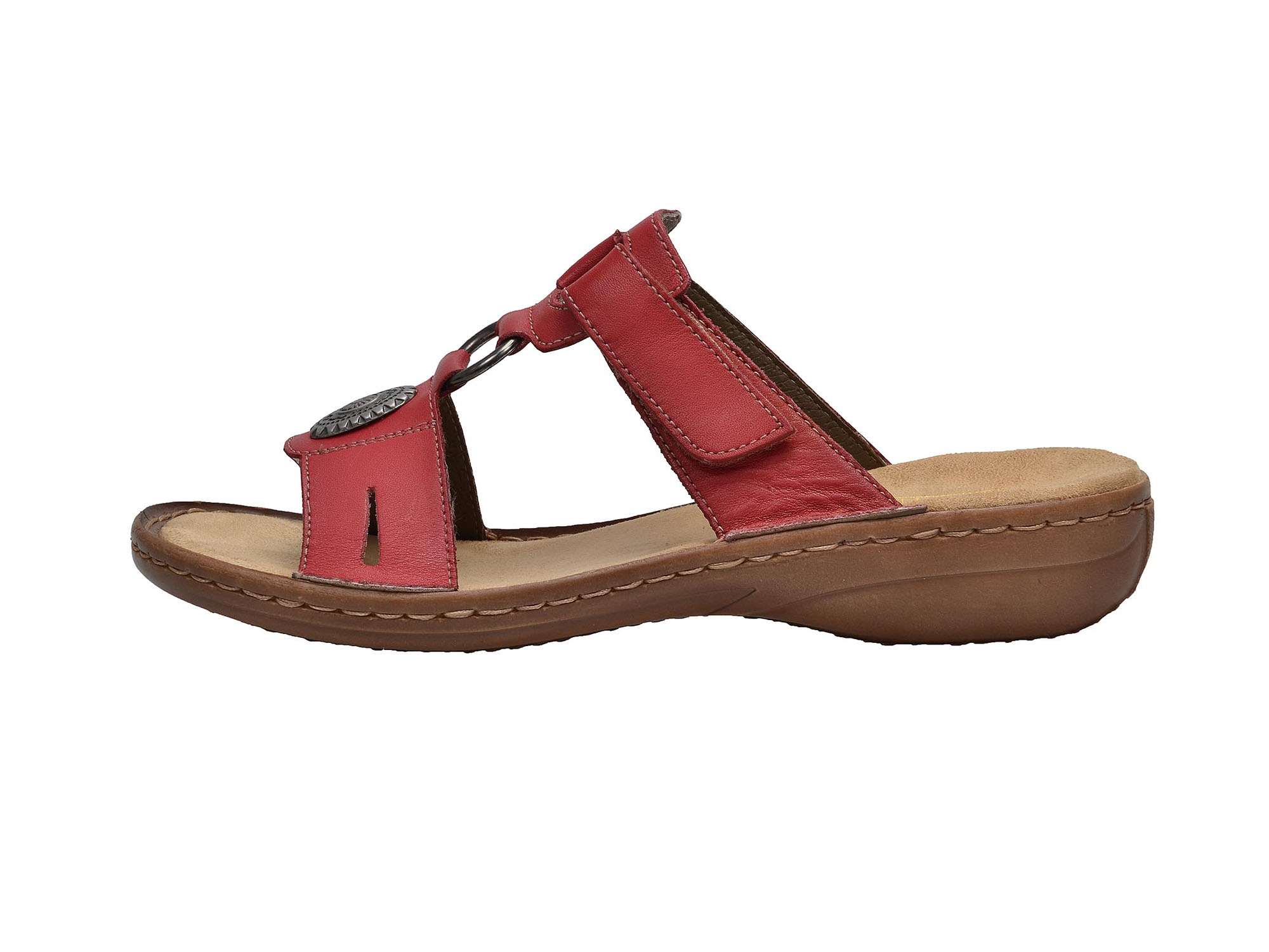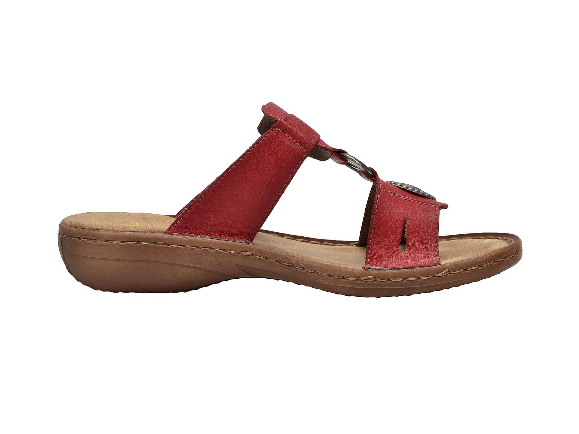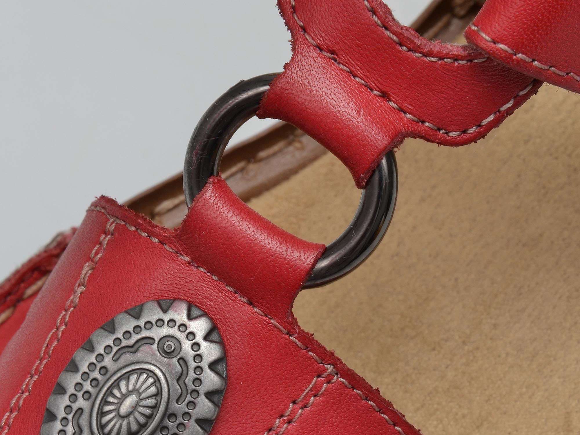Dámské nazouváky v červené barvě s páskem přes nárt zdobeným kovovou aplikací, která jim dodá elegantní a zajímavý vzhled. Obuv se skvěle hodí do všedních dní jak k džínům, tak k šatům.