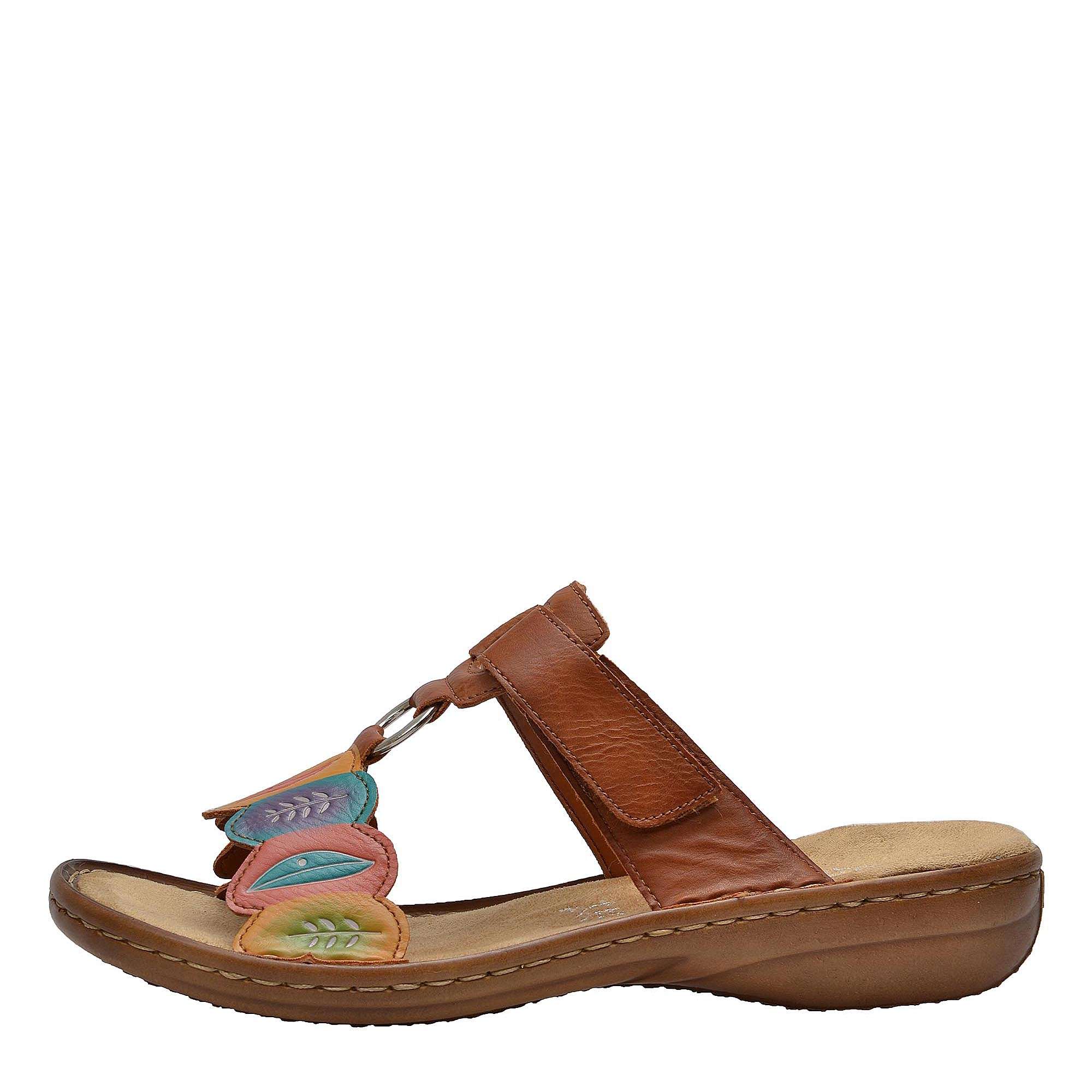 Dámské pantofle na nízkém podpatku/klínku s nastavitelným páskem a zdobením [slovnik=4]šíře G[/] značky Rieker.