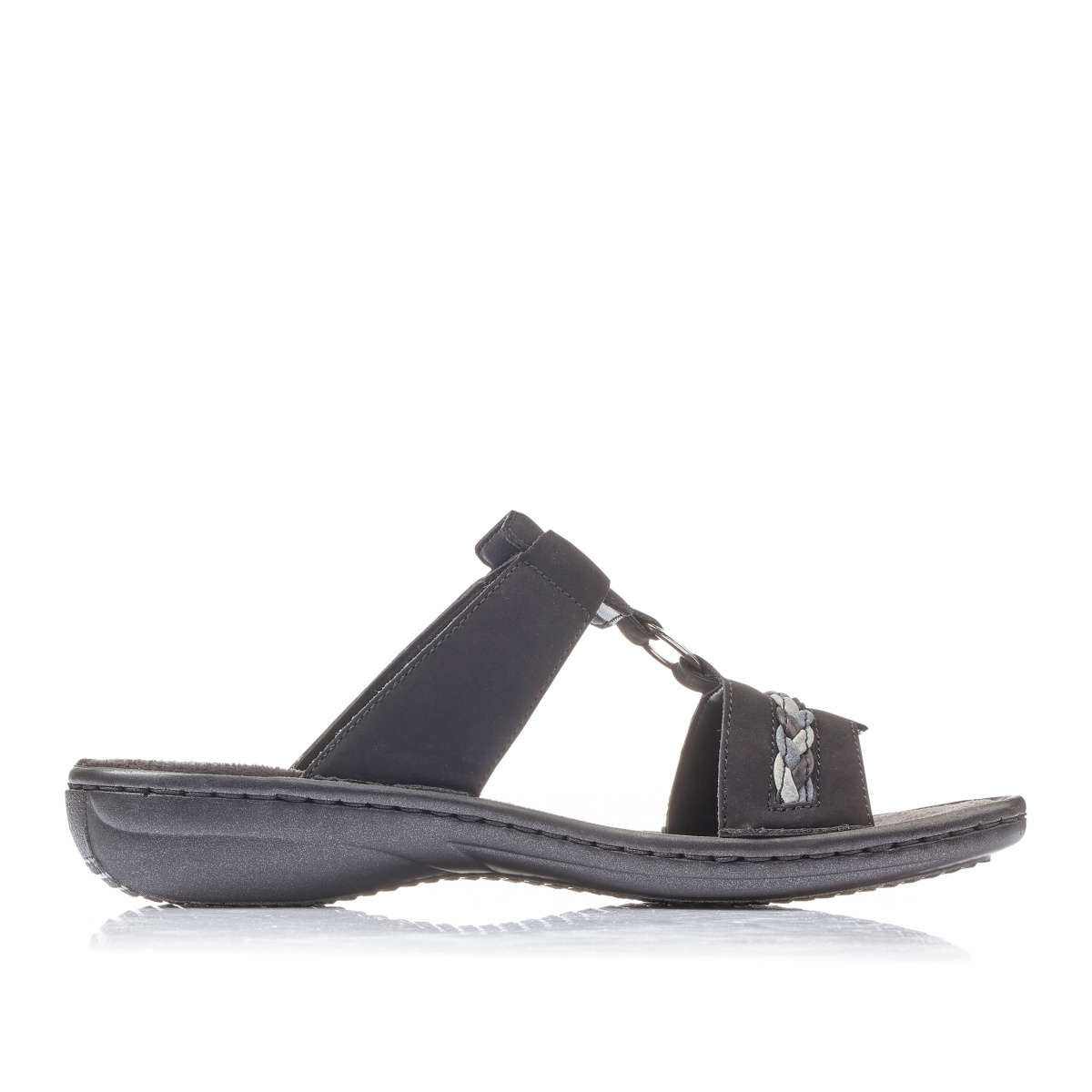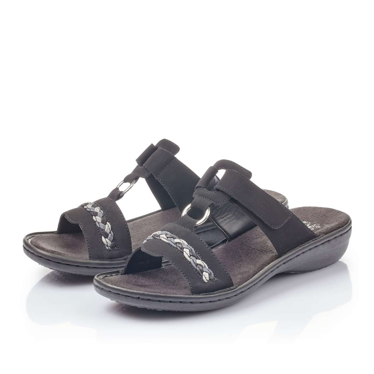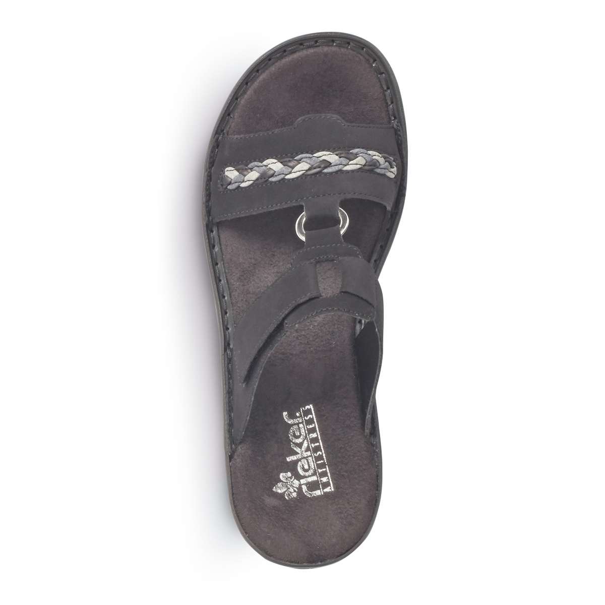 Dámské nazouváky Rieker s páskem ve přední části a kovovým spojovacím kroužkem v modré barvě. Díky suchému zipu v horní části si botu můžete utáhnout přesně podle Vašich představ. Tento model můžete využít na procházky parkem s přáteli.