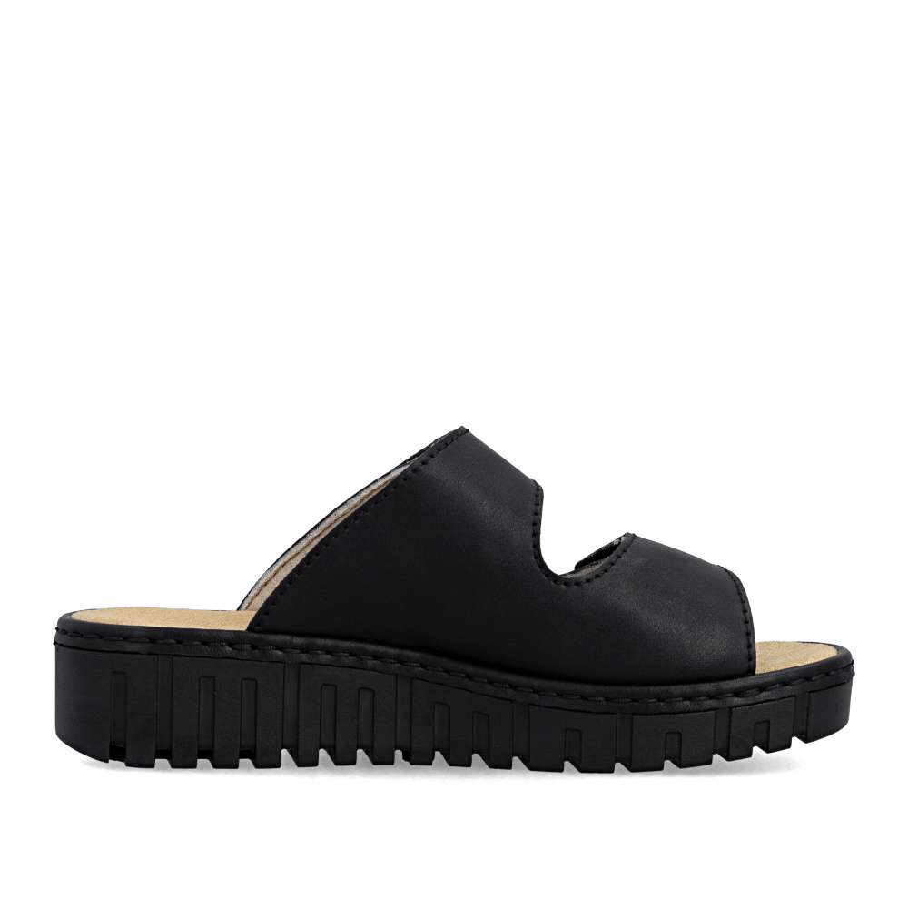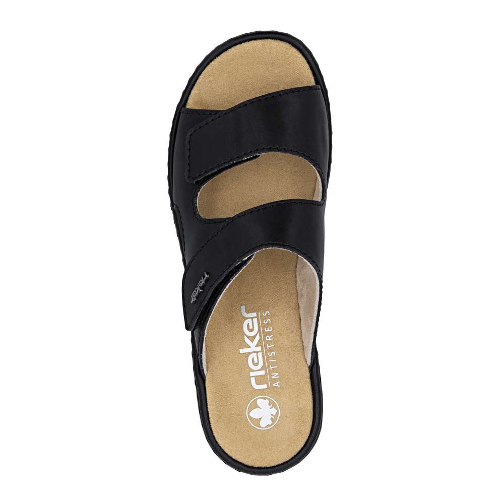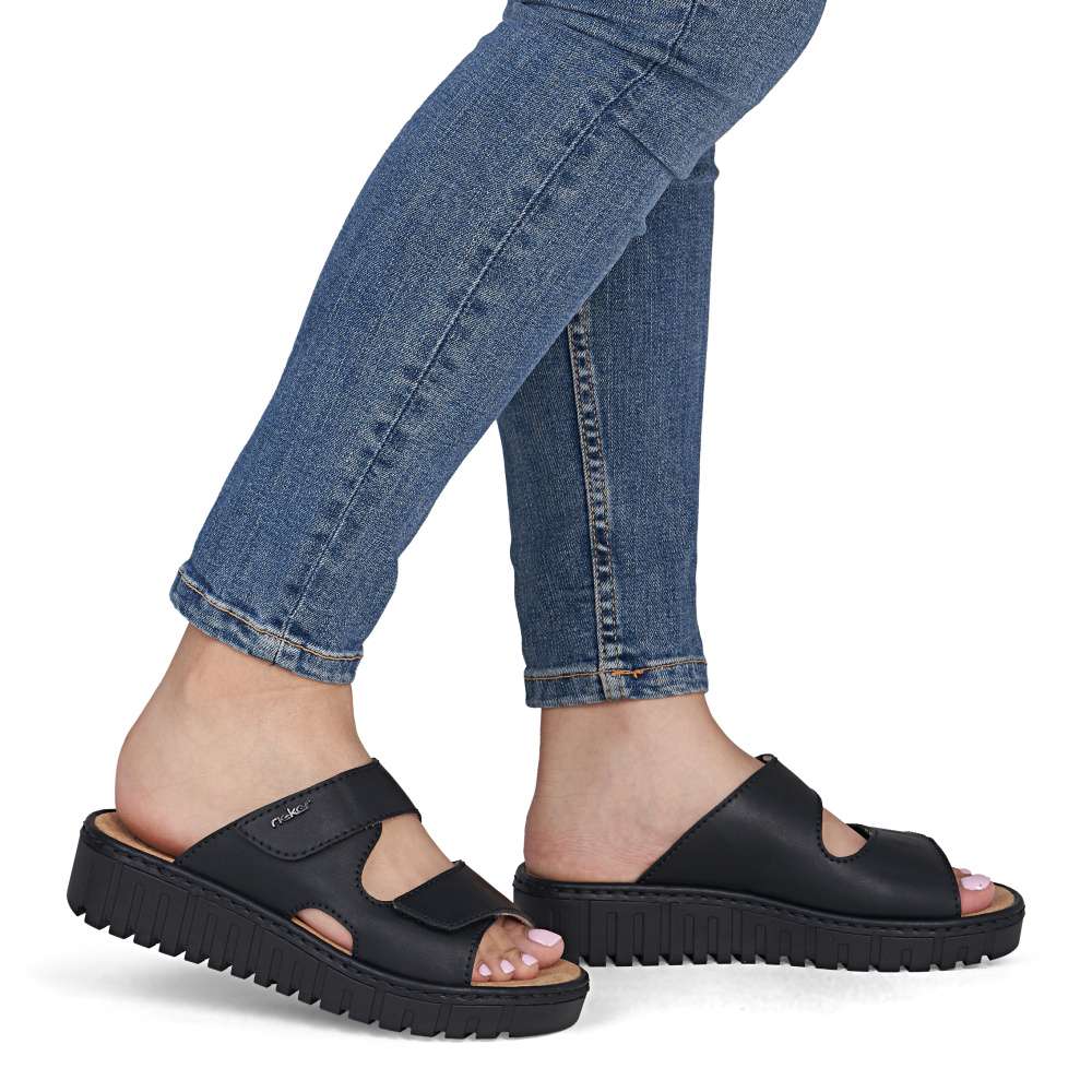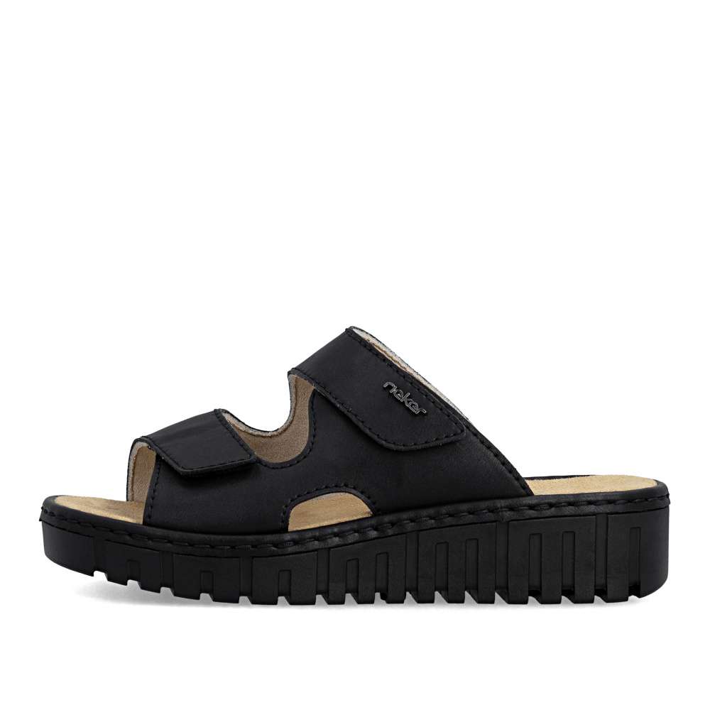 Černý svršek pantoflí RIEKER s decentním logem značky působí nadčasově a snadno se kombinuje s každým outfitem. Tento model je ideální volbou jak pracovní, tak domácí obuv. Dva nastavitelné pásky se suchým zipem zajistí dokonalé přizpůsobení noze a maximální pohodlí již od prvního kroku. Měkká textilní stélka poskytuje příjemný pocit i během celodenního nošení, zatímco vyšší komfortní podešev efektivně tlumí nárazy při chůzi. Tento model pantoflí bude ideální volba pro ženy, které nechtějí dělat kompromisy mezi stylem a komfortem.