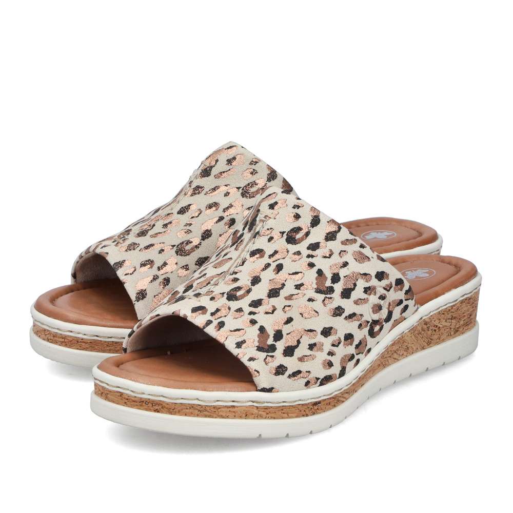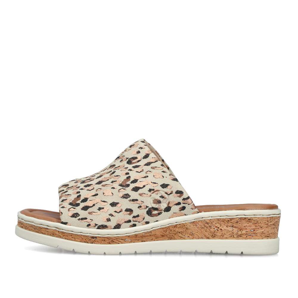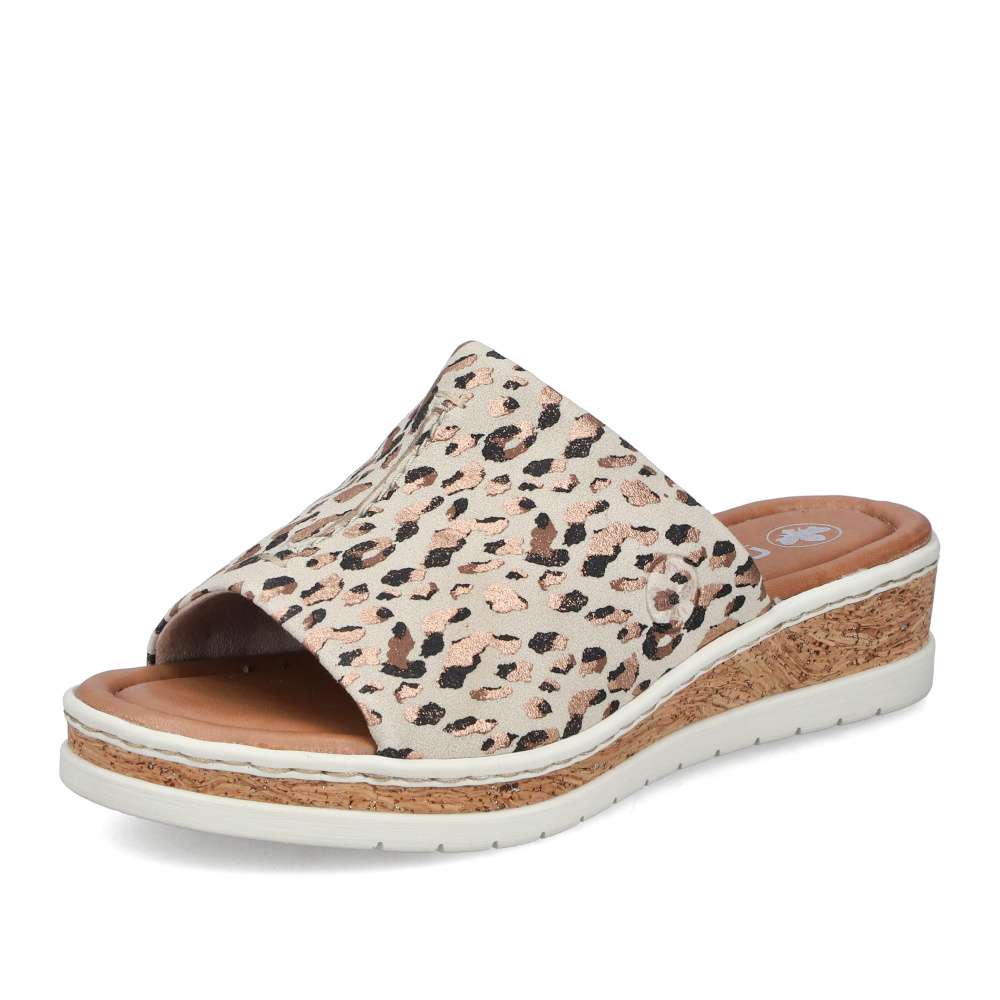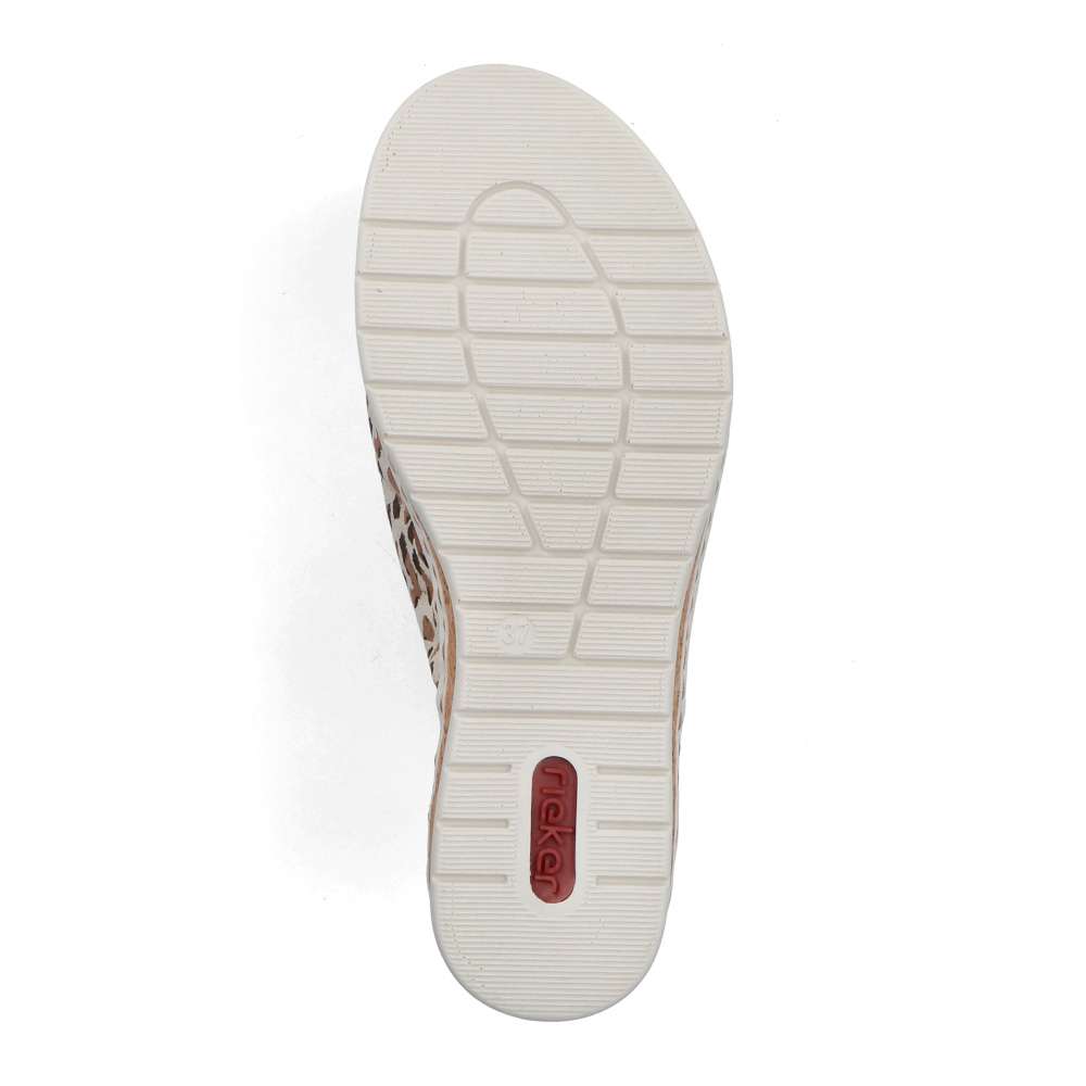 Dopřejte si styl a pohodlí v jednom s těmito nazouváky RIEKER v působivém provedení. Na první pohled zaujmou širokým nártovým páskem, který je dekorován výrazným potiskem a jemnými odlesky. Tento detail dodává obuvi jedinečný charakter a činí z ní atraktivní doplněk každého letního outfitu. Vnitřní komfortní stélka je navržena tak, aby poskytovala chodidlu příjemnou oporu a vyšší podešev účinně tlumí nárazy při chůzi, čímž přispívá k ještě většímu komfortu při každém kroku. Zároveň opticky zvýrazňuje moderní vzhled těchto sandálů a dodává jim stylový nádech. Tyto nazouváky RIEKER skvěle doplní letní šaty, sukně i ležérní kalhoty a stanou se oblíbeným kouskem během teplých dnů.