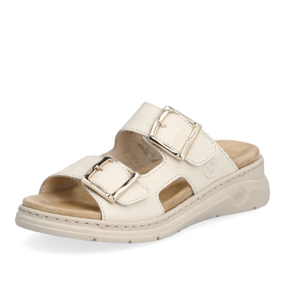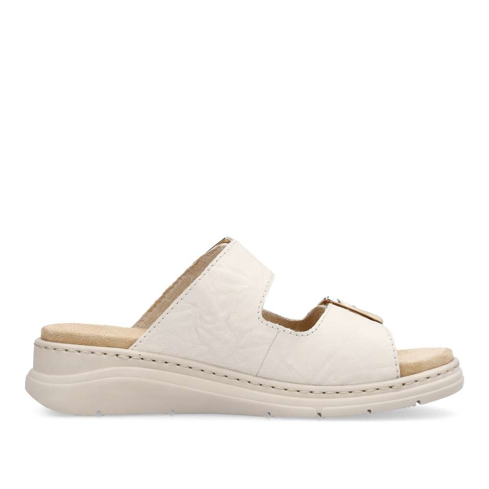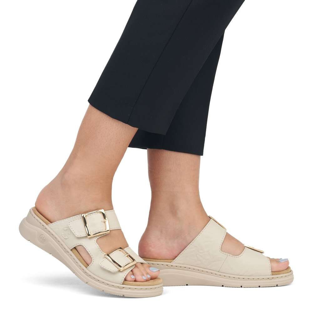 Design těchto kožených pantoflí značky RIEKER Vás upoutá na první pohled. Svršek béžové barvy je na páscích ozdoben sponami, pod kterými se ukrývá zapínání suchým zipem pro snadné přizpůsobení dle požadavků každé z Vás. Měkká stélka je vyrobena z kvalitního materiálu a flexibilní podešev se postará o pohodlí každým krokem. Tyto pantofle oceníte na Vašich letních procházkách městem či na posezení s přáteli. Technologie: Antistress - podešev je díky této technologii lehká, flexibilní, absorbuje nárazy při došlapu a snadno se přizpůsobí každé noze. Tato bota je vybavena vyjímatelnou stélkou.