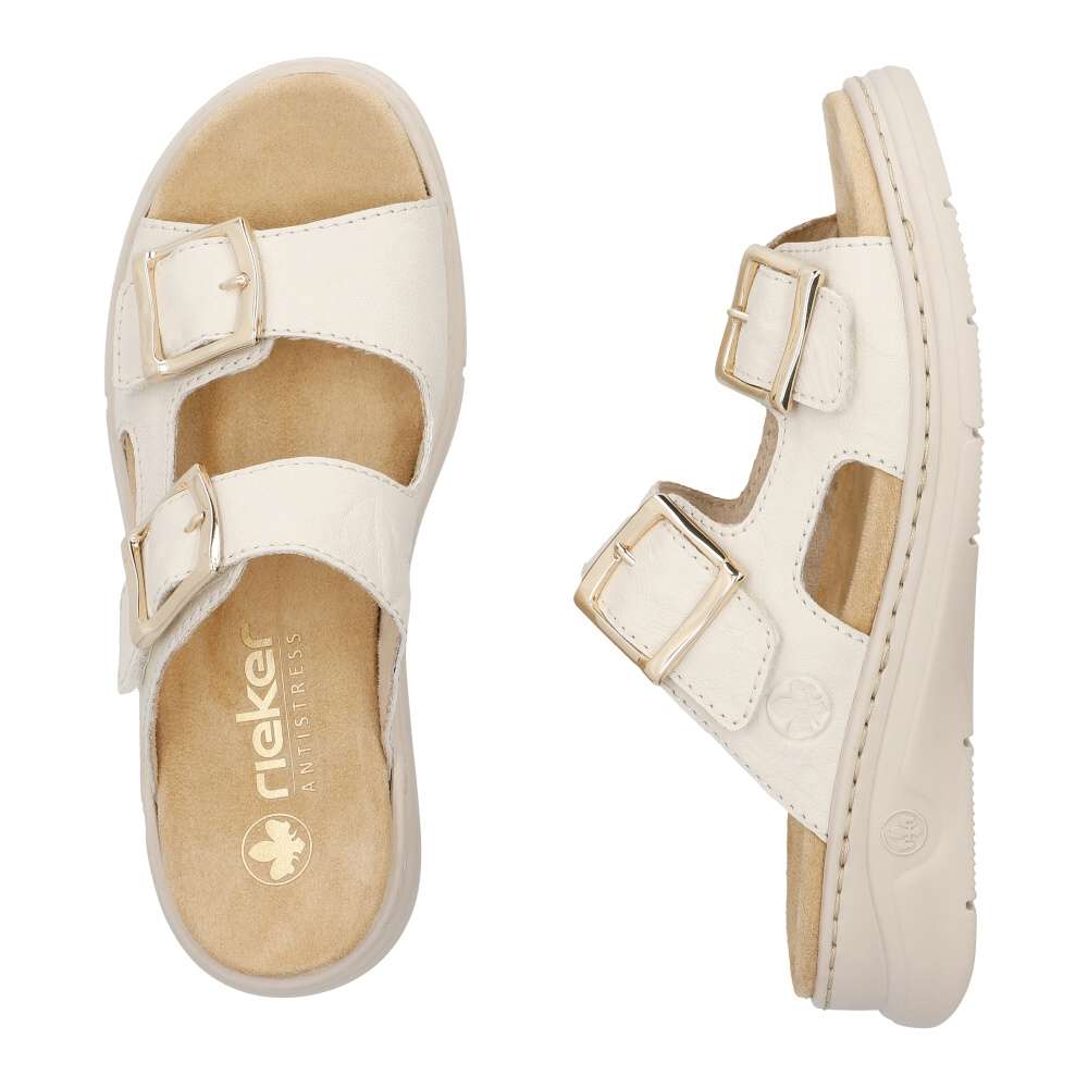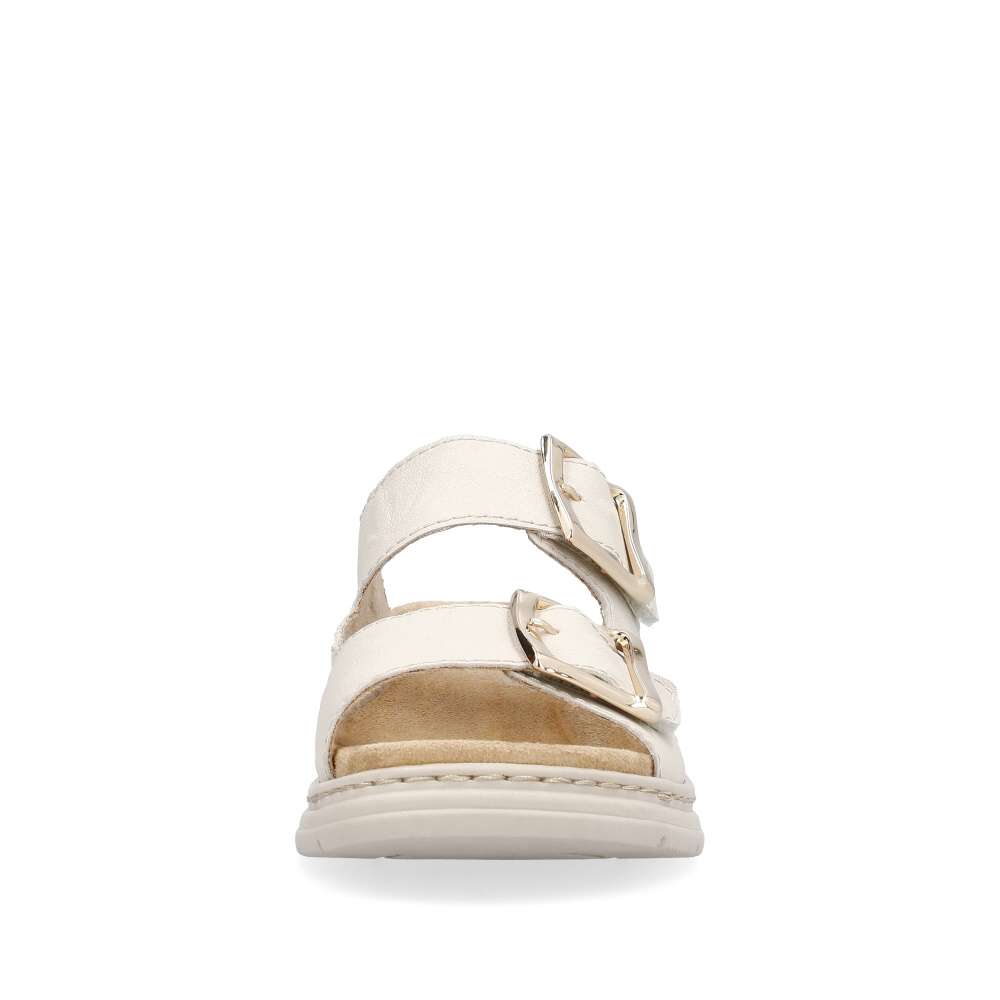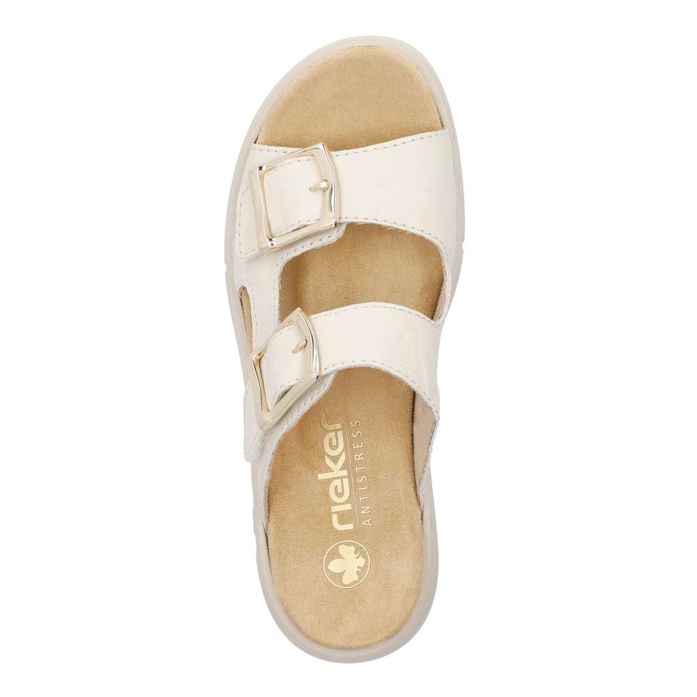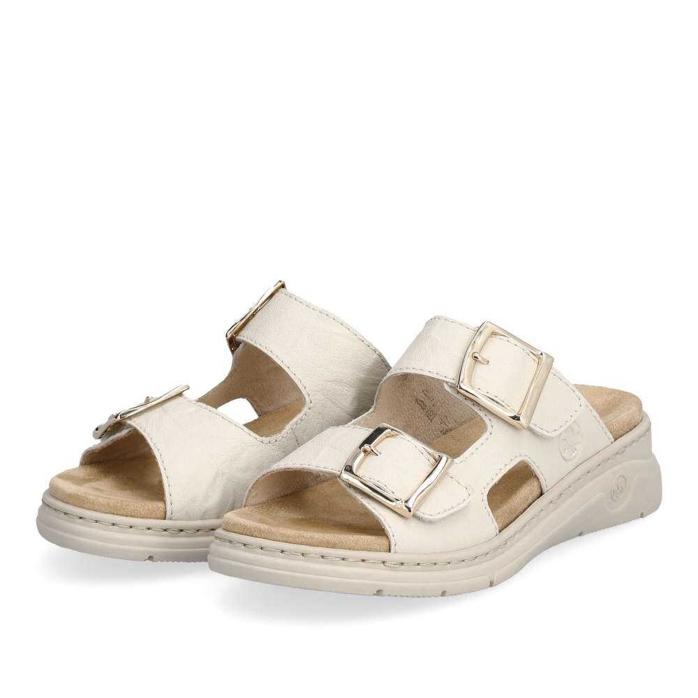 Design těchto kožených pantoflí značky RIEKER Vás upoutá na první pohled. Svršek béžové barvy je na páscích ozdoben sponami, pod kterými se ukrývá zapínání suchým zipem pro snadné přizpůsobení dle požadavků každé z Vás. Měkká stélka je vyrobena z kvalitního materiálu a flexibilní podešev se postará o pohodlí každým krokem. Tyto pantofle oceníte na Vašich letních procházkách městem či na posezení s přáteli. Technologie: Antistress - podešev je díky této technologii lehká, flexibilní, absorbuje nárazy při došlapu a snadno se přizpůsobí každé noze. Tato bota je vybavena vyjímatelnou stélkou.