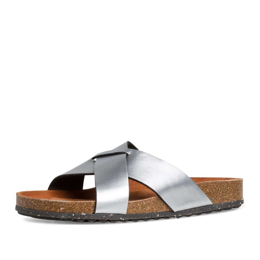 Stylové nazouváky od značky TAMARIS ve stříbrné barvě zaujmou především provlečenými, kříženými pásky. Na vnitřní straně je umístěna malá pružná gumička, která napomůže nazouvání.