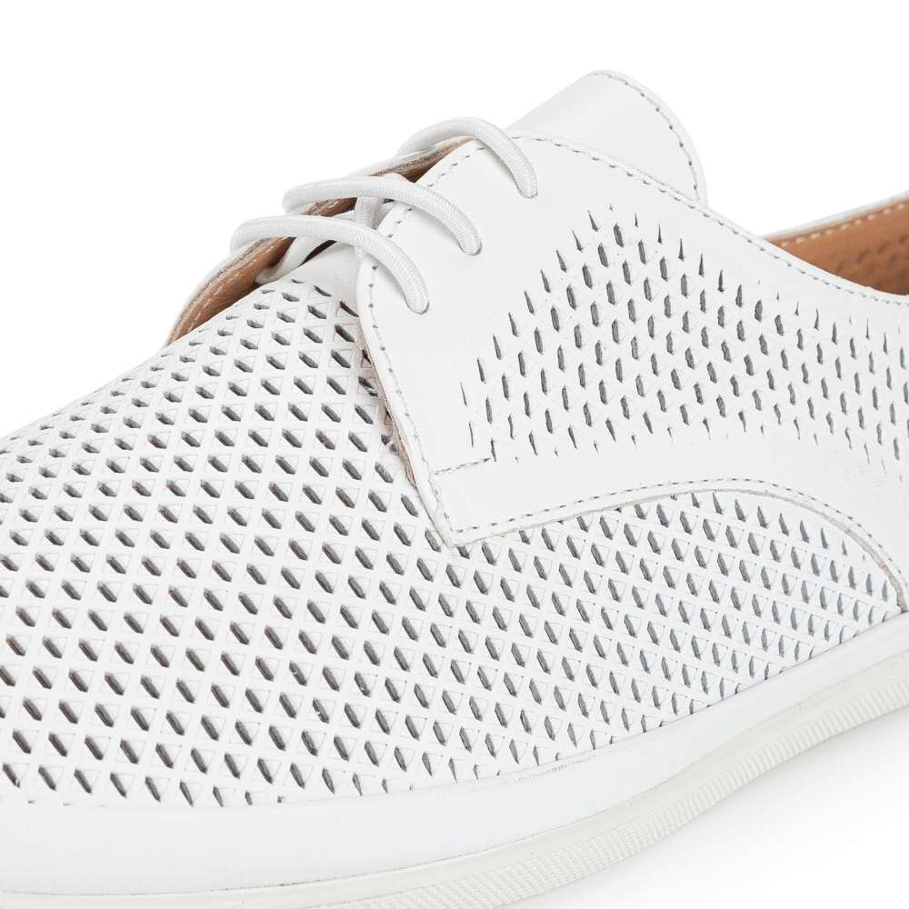 Detailní informace Mokasíny IBERIUS jsou šikovným spojením elegance a pohodlí. Kožený bílý svršek s designovou perforací nabízí moderní a stylový vzhled. Perforace nejenže dodává obuvi unikátní vzhled, ale zároveň také zajišťuje prodyšnost a pohodlí pro vaše nohy. Šněrování umožňuje snadné nastavení, aby se mokasíny perfektně přizpůsobily vašim nohám. Měkká kožená stélka dodává obuvi luxusní pocit a zvyšuje komfort během celého dne. Tyto mokasíny jsou skvělou volbou pro každodenní nošení, ať už jdete do práce, na procházku nebo se vydáváte na společenskou událost. Jsou elegantní, pohodlné a stylové, což je kombinace, kterou oceníte.