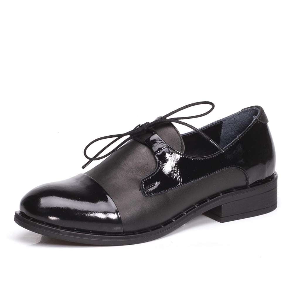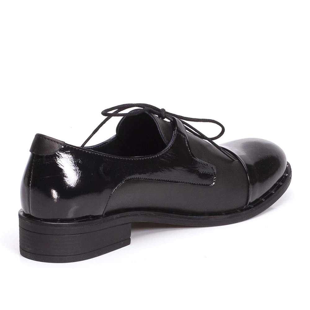 Elegantní polobotky šité z pravé kůže černé barvy si zamilujete. Kombinace lakované a matné části s kovovými druky kolem obvodu podešve dodává modelu osobitý vzhled. Unosíte je k pracovním i volnočasovým outfitům.