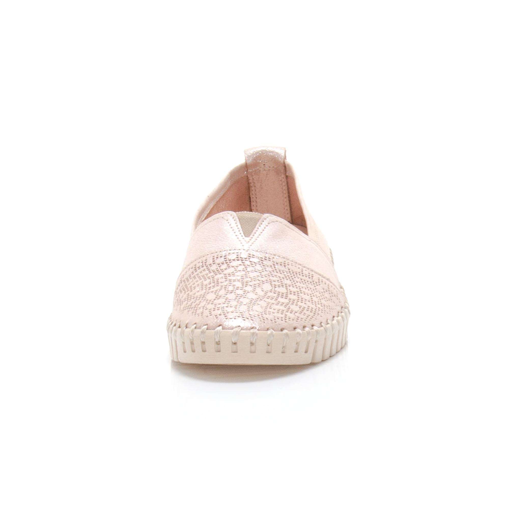 Dámské polobotky ušité z pravé kůže v růžové barvě jsou zdobené metalickými odlesky a výrazným šitím podešve. Mají hladký povrch, kulatou špičku a na středu nártu vsazenou gumičku pro snadné obutí. Tento elegantní model unosíte jak do práce k sukni, tak na procházky městem.