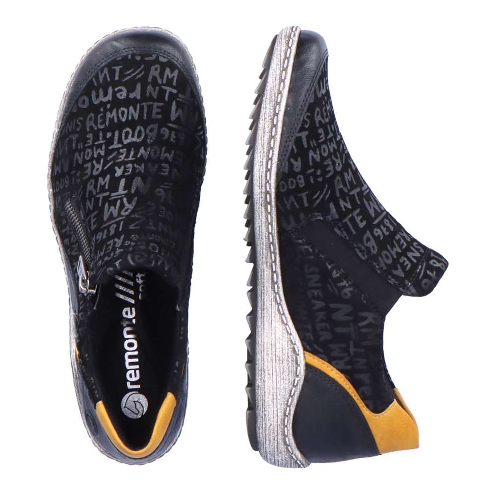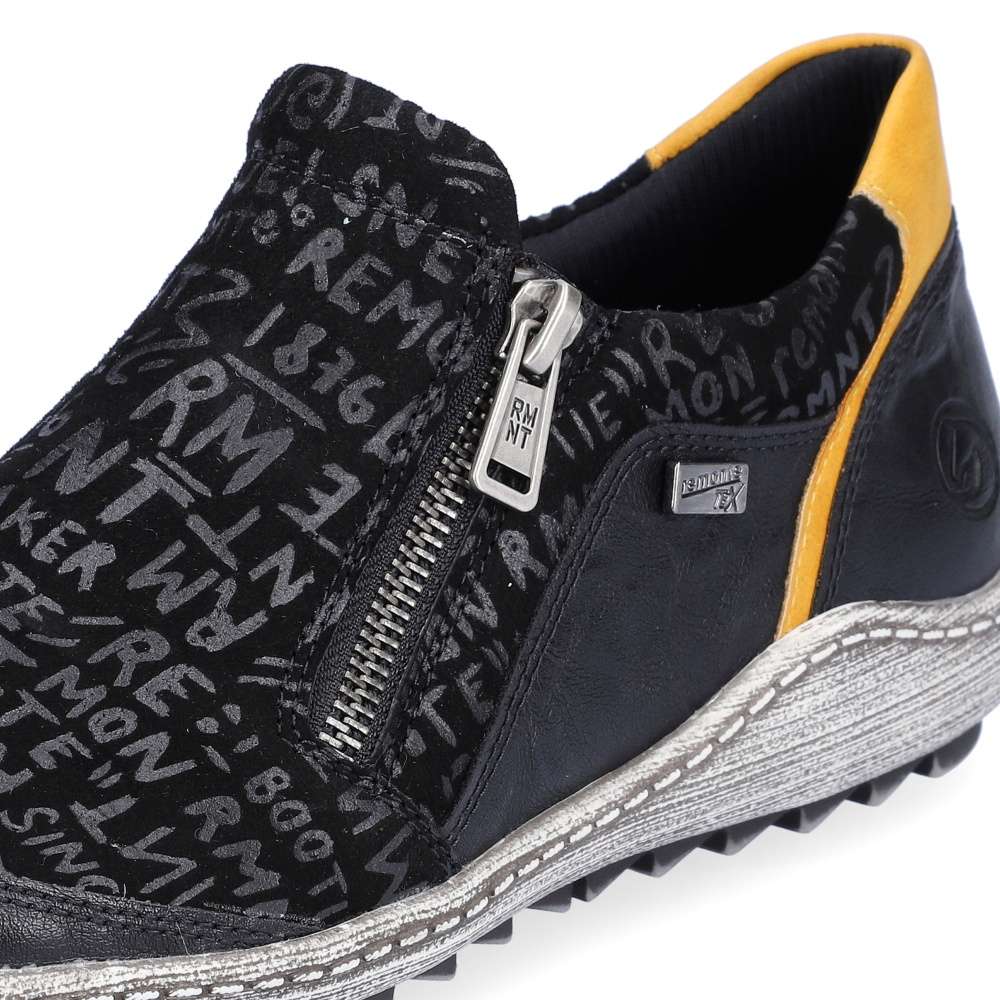 Tyto dámské celoroční polobotky Remonte z vyšší řady značky Rieker si díky své jedinečnosti zamilujete na první pohled. Svršek vyrobený z pravé kůže je zdoben logy a doplněn jednobarevnými díly v šedé a žluté barvě, které dokreslují společně se zipem celkový design této obuvi. Díky speciální membráně TEX je navíc vhodná i do nepříznivého počasí. Kvalitní podešev je z vnitřní strany doplněna o vyjímatelnou stélku, která zaručí, že se budete cítit pohodlně při každodenní cestě do práce či pochůzkách městem. Tento model snadno sladíte jak se sukní, tak kalhoty. Boty z řady Remonte Vám zajistí maximální komfort a pohodlí při celodenním nošení. Technologie: RemonteSoft – unikátní stélka z paměťové pěny, která změkčuje došlap, ale také se maximálně přizpůsobí tvaru Vašeho chodidla. Remonte TEX – funkční vrstva, díky které je bota nepromokavá a přesto prodyšná. Tato bota je vybavena vyjímatelnou stélkou.