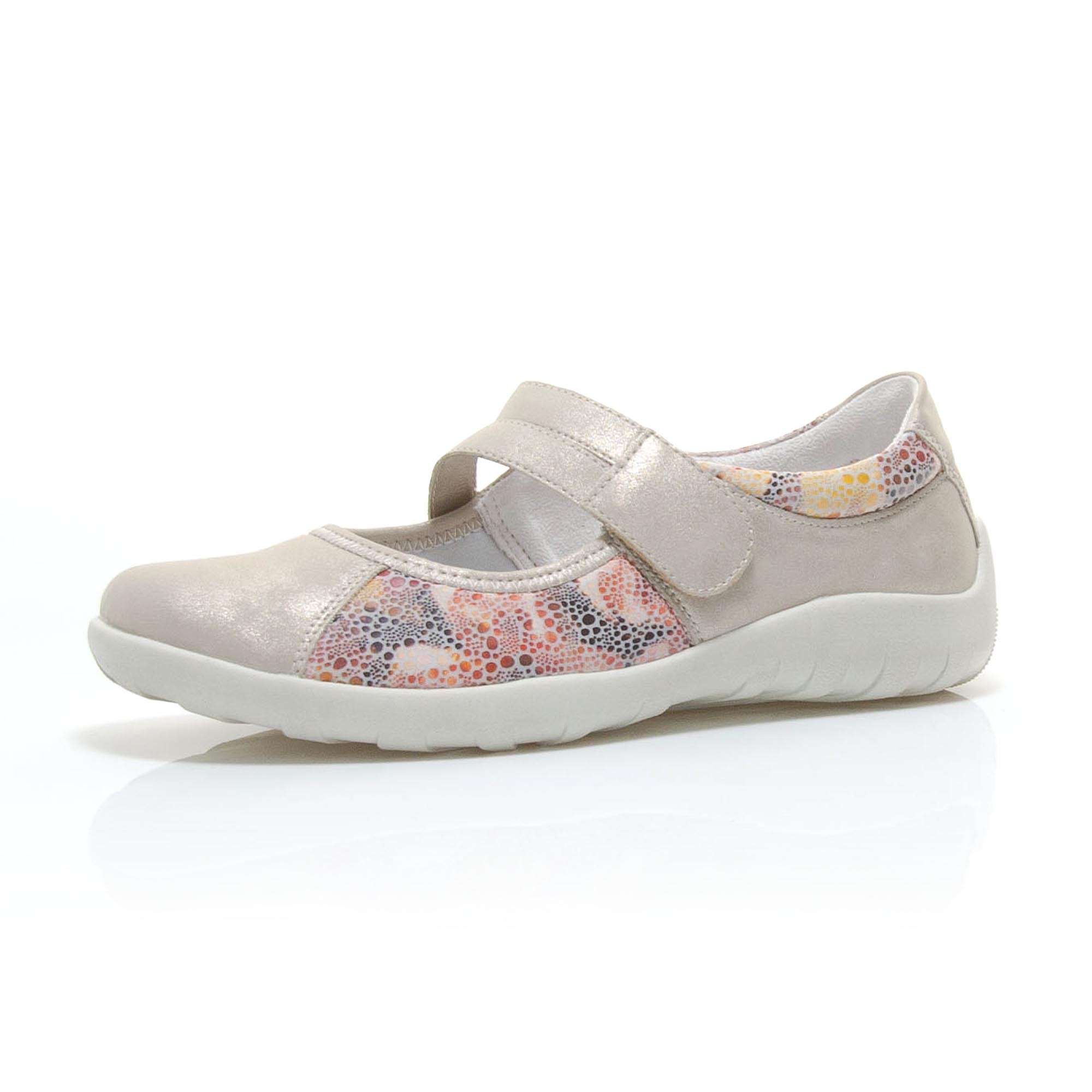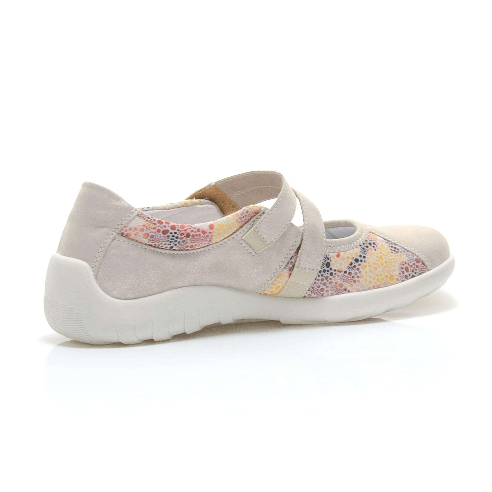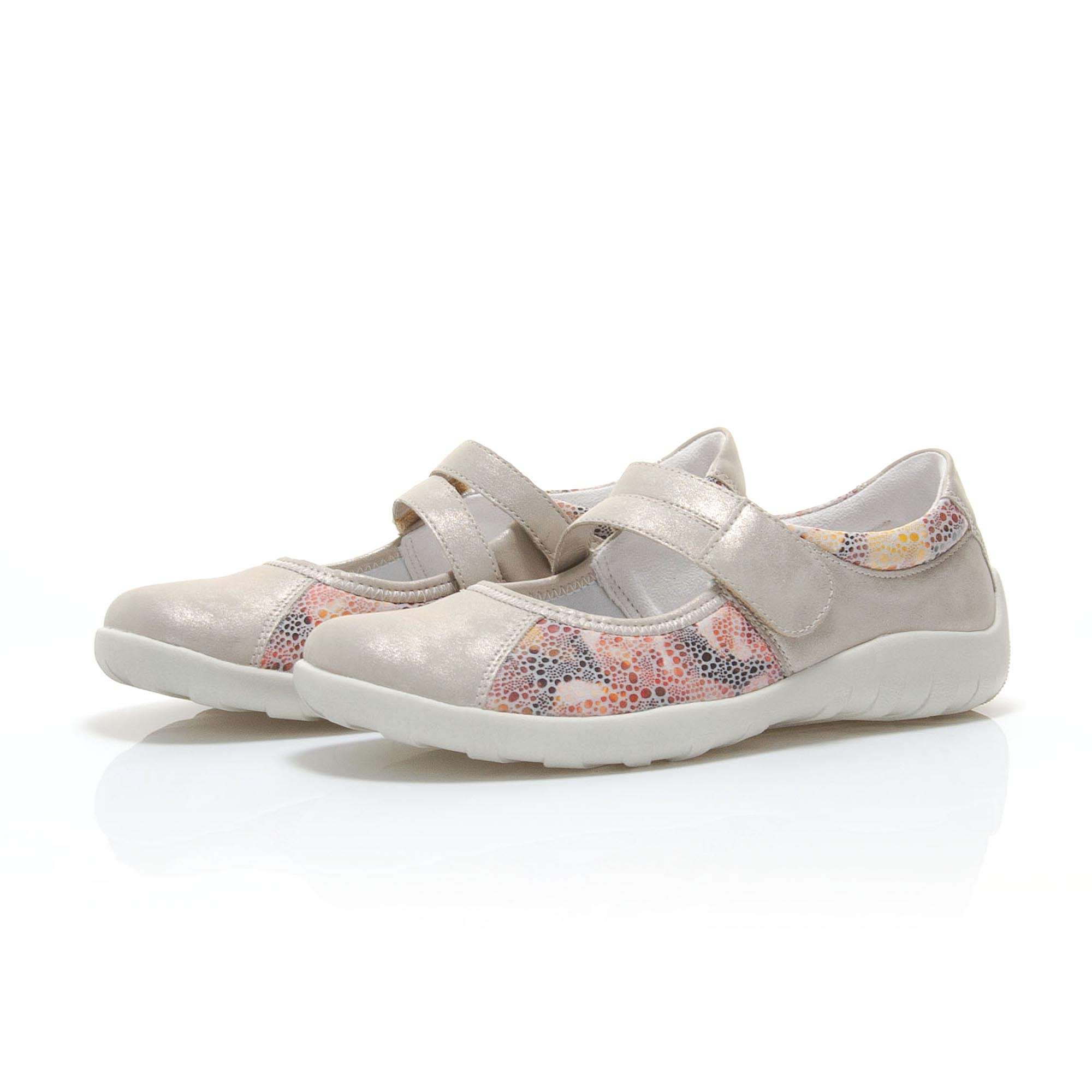 Dámská polobotka šedé barvy je zdobena zlatými odlesky a barevným puntíkovaným potiskem po stranách a pod kotníkem. Pro Vaše pohodlí je pásek přes nárt na jedné straně upevněn pružnými gumičkami a na druhé má zapínání na suchý zip, což Vám umožní nastavit si botu dle svých potřeb. Tuto obuv oceníte jak na procházce městem, tak i na procházce přírodou.