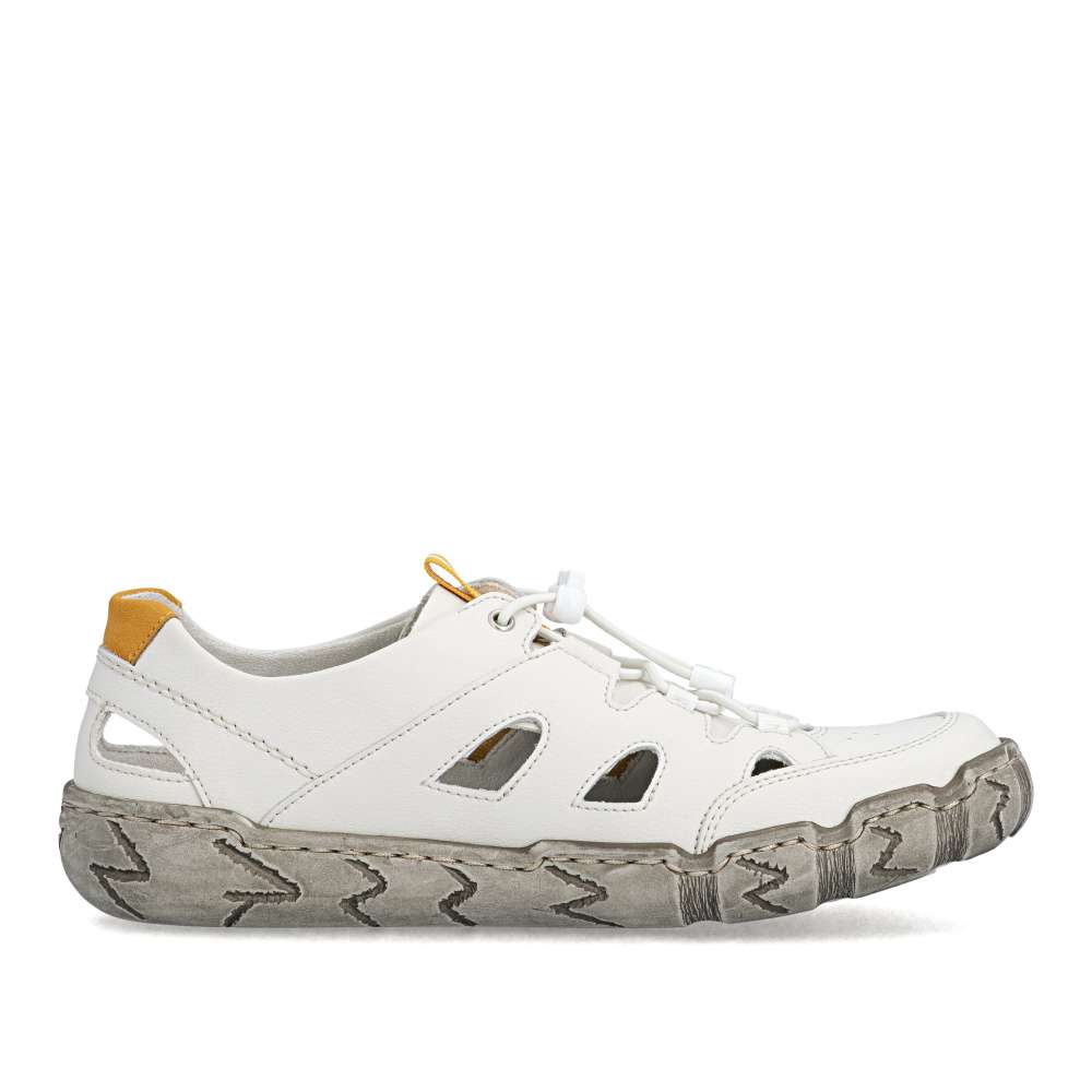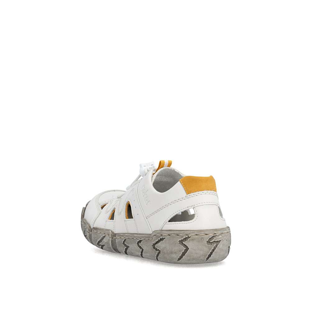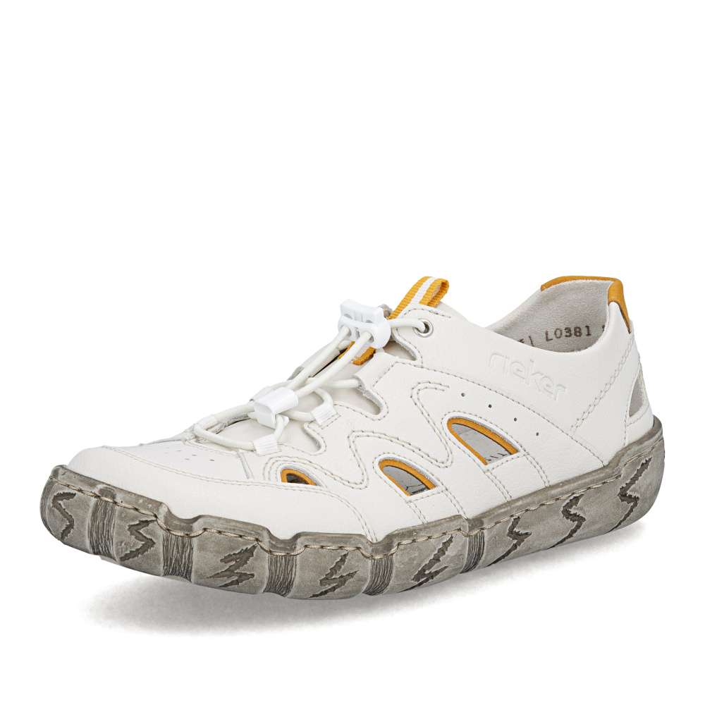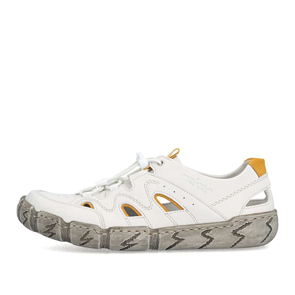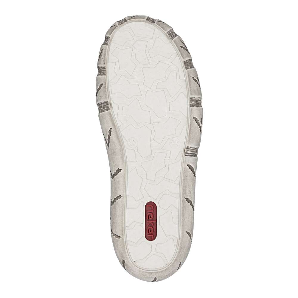 Tyto boty RIEKER jsou ztělesněním stylu, komfortu a prémiového designu. Jejich bílý svršek je ozvláštněn výrazným perforovaným vzorem a barevně kontrastními aplikacemi, které dodávají modelu nepřehlédnutelný charakter. Praktická gumička se stahujícím prvkem na nártu umožňuje snadné nazutí a zároveň zajišťuje dokonalé přizpůsobení tvaru chodidla. Kožená stélka poskytuje pocit měkkosti a optimální oporu, zatímco flexibilní podešev přirozeně kopíruje pohyb nohy a tlumí nárazy, čímž zaručuje komfort po celý den. Ať už kráčíte městem, cestujete nebo trávíte čas ve volnočasových aktivitách, každý krok v těchto botách působí stylově.