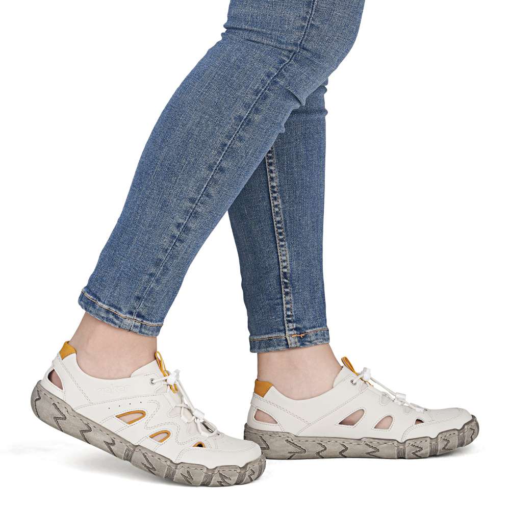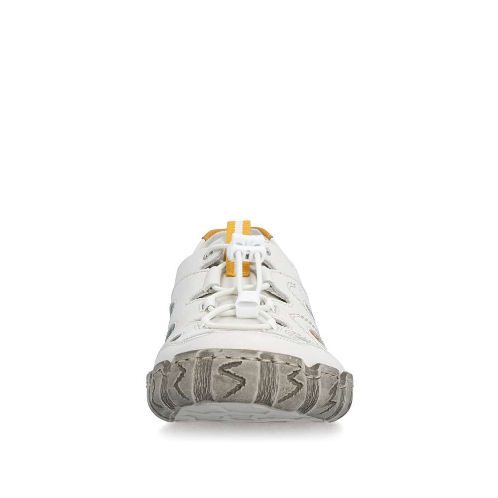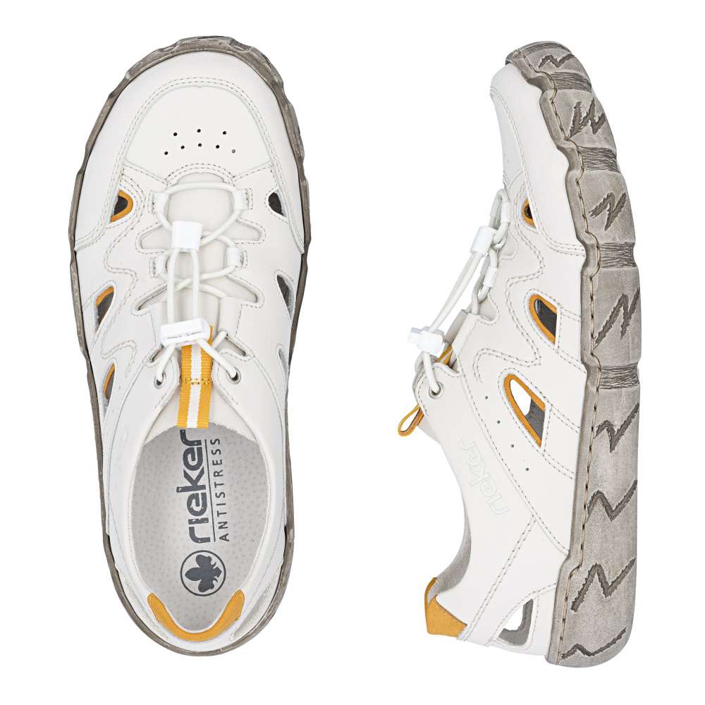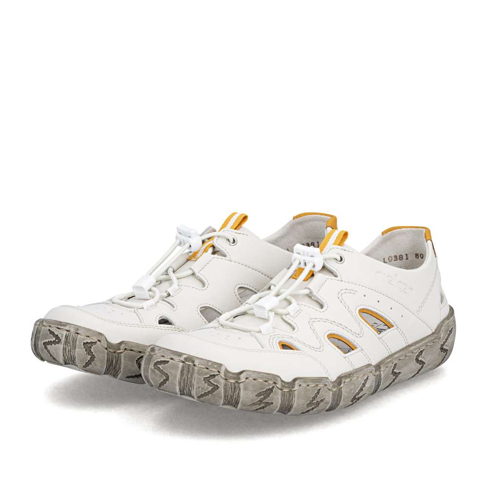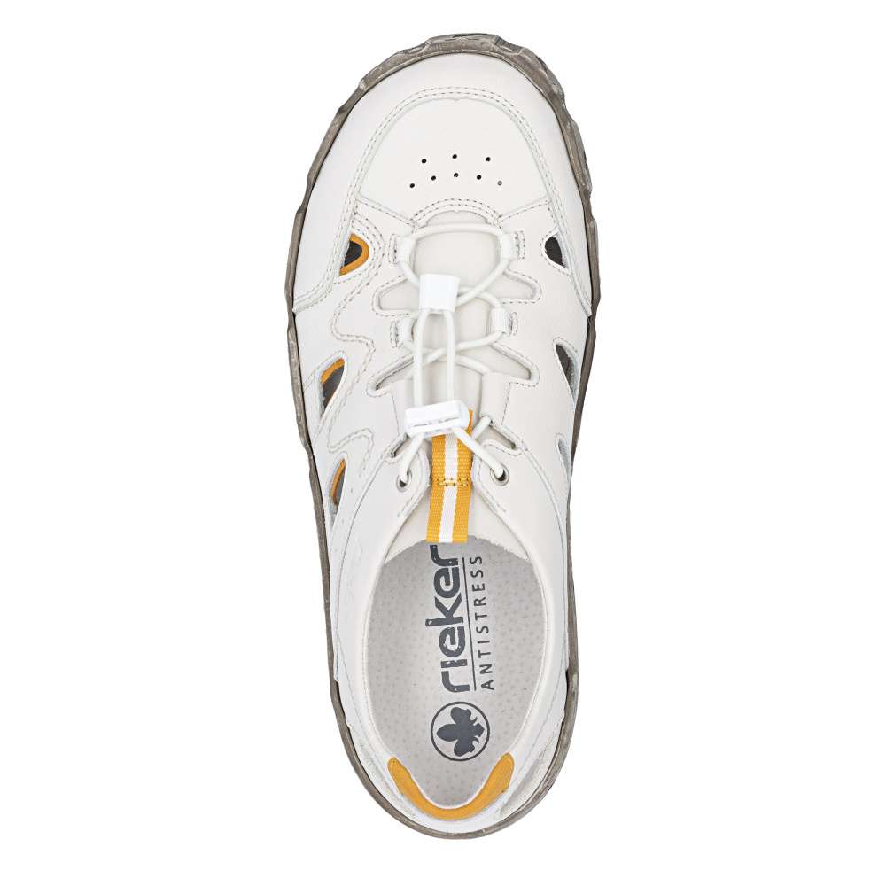 Tyto boty RIEKER jsou ztělesněním stylu, komfortu a prémiového designu. Jejich bílý svršek je ozvláštněn výrazným perforovaným vzorem a barevně kontrastními aplikacemi, které dodávají modelu nepřehlédnutelný charakter. Praktická gumička se stahujícím prvkem na nártu umožňuje snadné nazutí a zároveň zajišťuje dokonalé přizpůsobení tvaru chodidla. Kožená stélka poskytuje pocit měkkosti a optimální oporu, zatímco flexibilní podešev přirozeně kopíruje pohyb nohy a tlumí nárazy, čímž zaručuje komfort po celý den. Ať už kráčíte městem, cestujete nebo trávíte čas ve volnočasových aktivitách, každý krok v těchto botách působí stylově.
