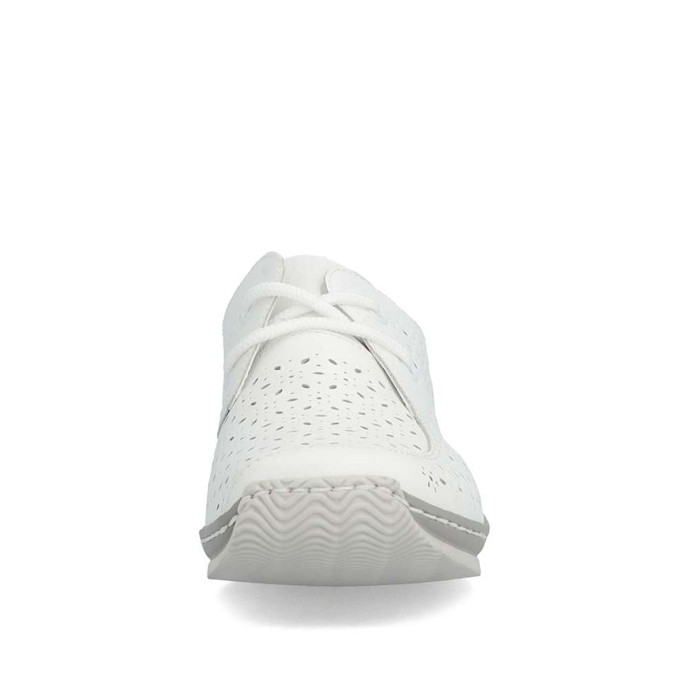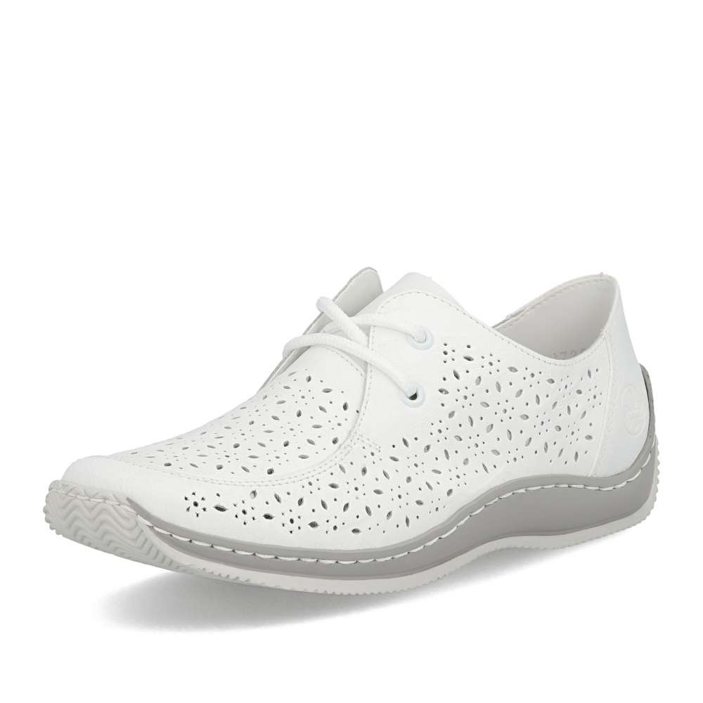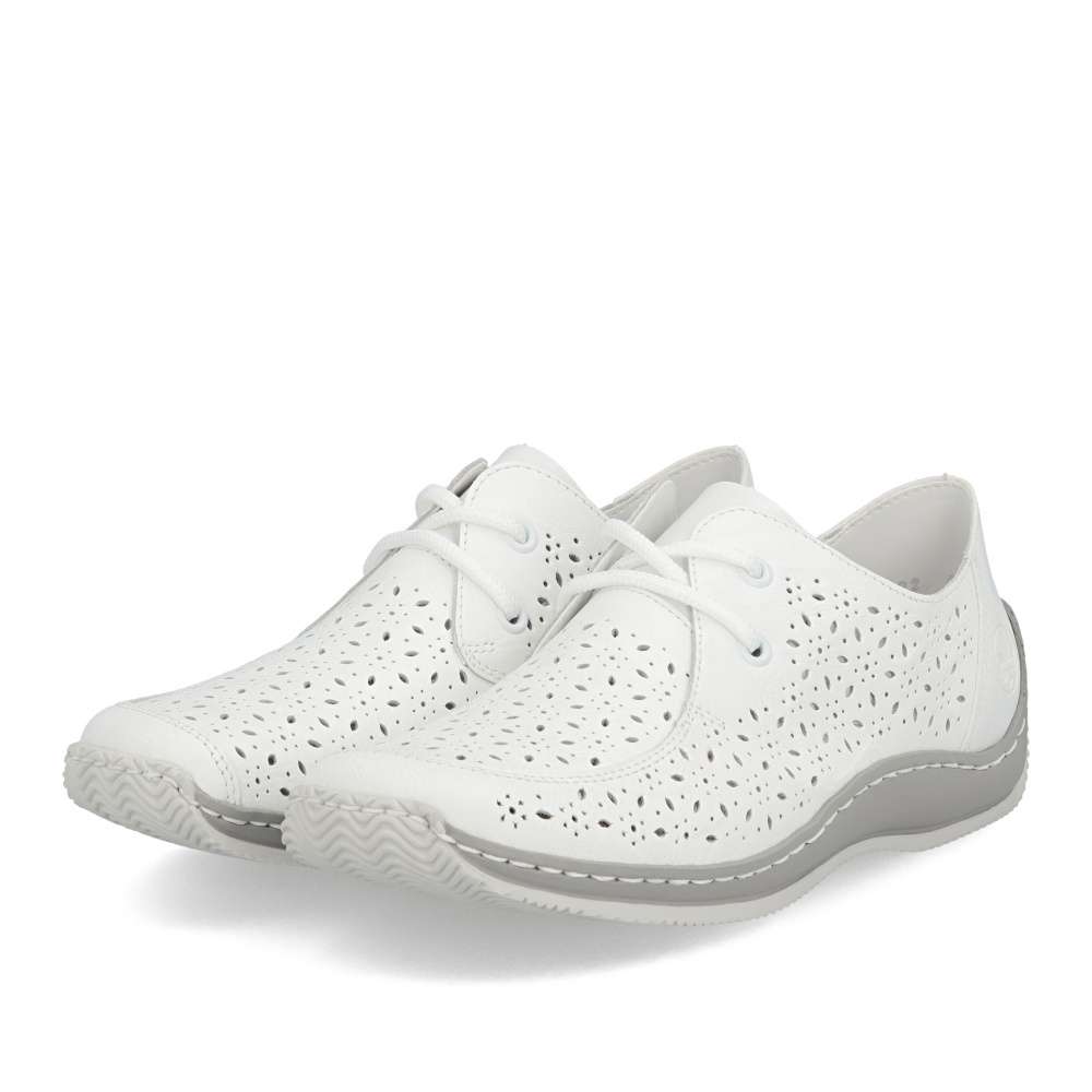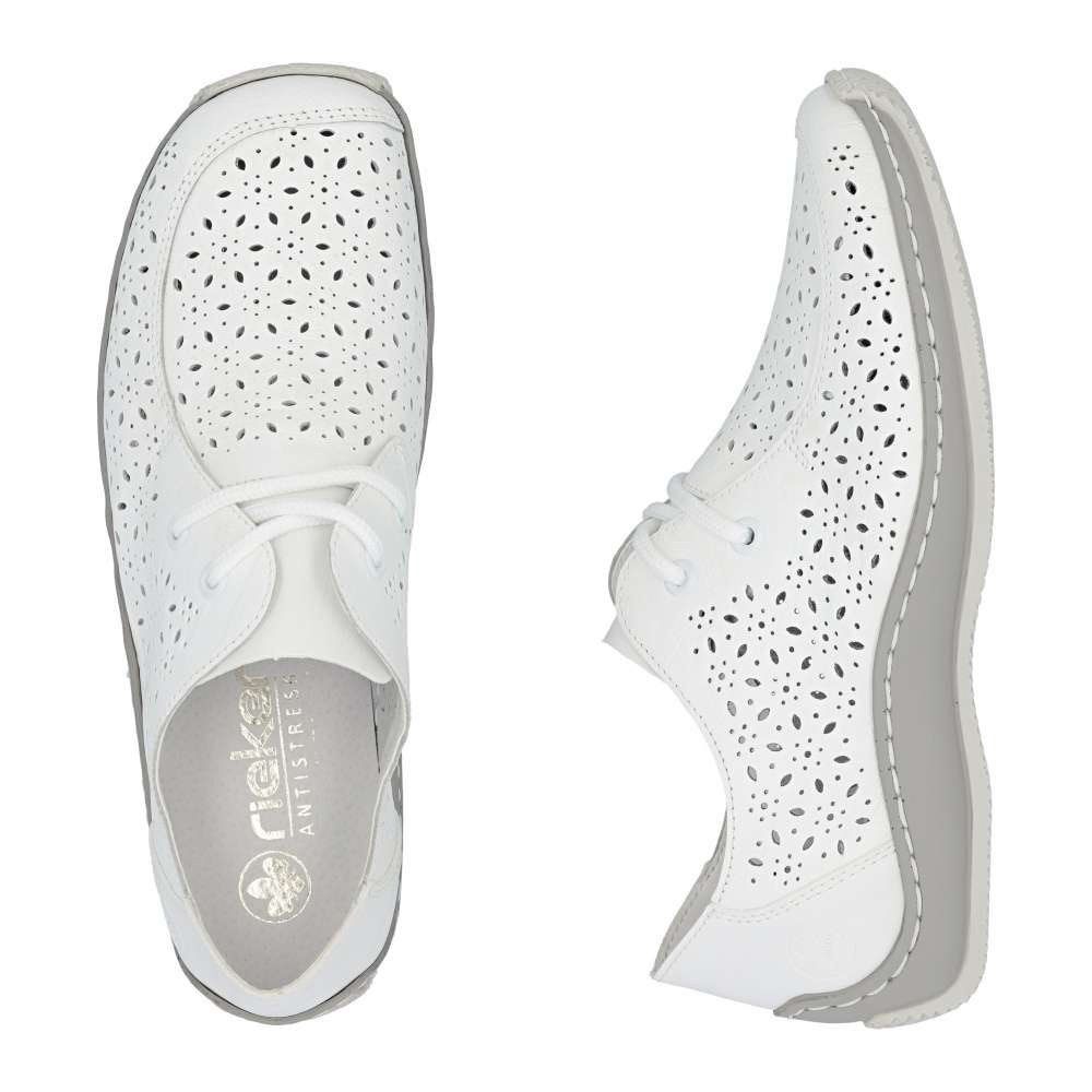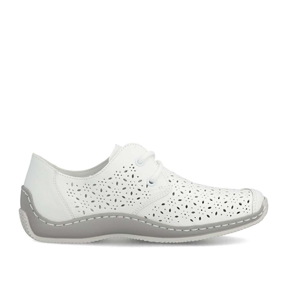 Tyto bílé boty RIEKER jsou ztělesněním moderního stylu a maximálního komfortu. Svršek je zdoben nádherným perforovaným vzorem, který přidává vizuální hloubku a zároveň zajišťuje optimální prodyšnost. Klasické šněrování umožňuje precizní přizpůsobení tvaru chodidla, zatímco kožená stélka poskytuje luxusní pocit měkkosti. Flexibilní podešev kopíruje pohyb chodidla a tlumí nárazy, čímž zajišťuje komfort při celodenním nošení a dodává krokům lehkost a jistotu. Ať už se vydáte do města, na procházku nebo na volnočasové aktivity, každý krok v těchto botách působí sebevědomě.