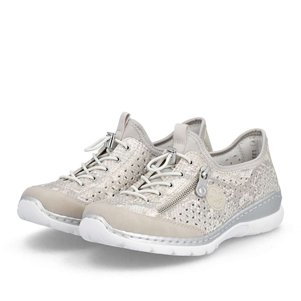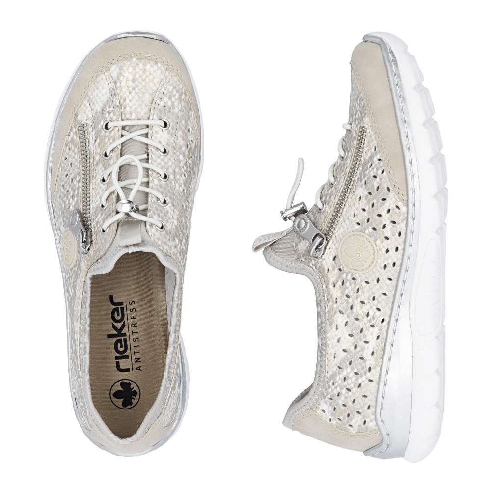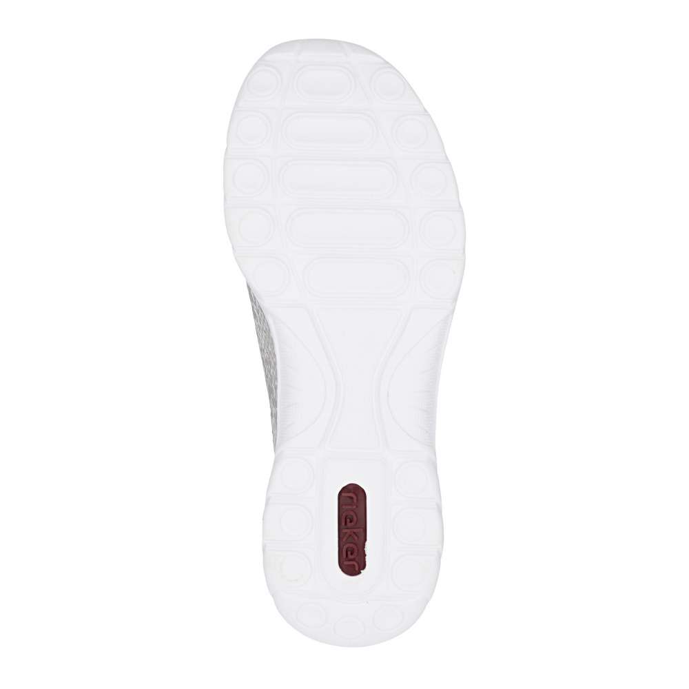 Tenisky RIEKER zaujmou na první pohled podmanivým vzorem s odlesky a jemnou perforací, která zajišťuje optimální prodyšnost a komfort i během teplejších dní. Celkový design doplňuje logo značky spolu s dekorativním zipem, který podtrhuje moderní a originální charakter modelu. Pružný lem horního okraje se příjemně přizpůsobí tvaru chodidla, zatímco šněrování gumičkou se stahovacím prvkem slouží jako stylový detail, který dotváří jedinečný vzhled obuvi. Měkká stélka poskytuje příjemný došlap a v kombinaci s flexibilní podešví tlumí nárazy při chůzi, čímž zaručuje maximální pohodlí během celého dne. Tyto tenisky jsou ideální volbou pro ženy, které hledají spojení moderního designu a pohodlí - ať už na aktivní dny ve městě, delší procházky nebo volnočasové aktivity. RIEKER přináší jistotu kroku, styl a komfort v jednom.