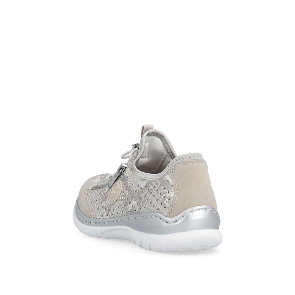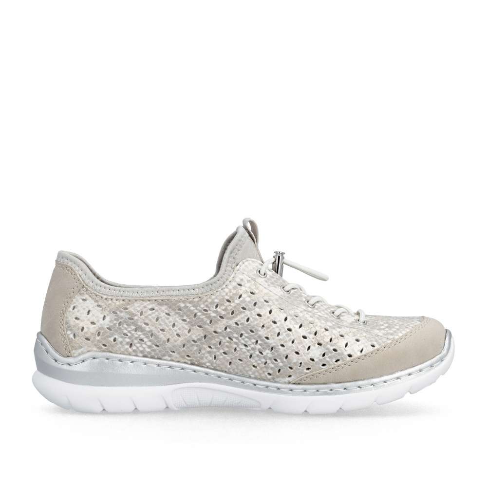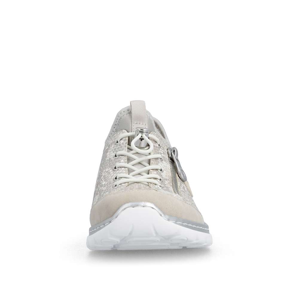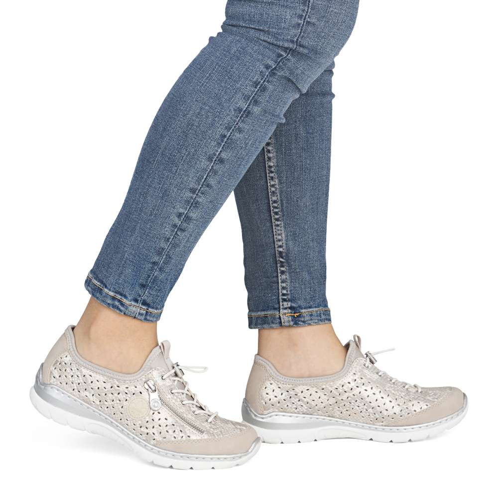Tenisky RIEKER zaujmou na první pohled podmanivým vzorem s odlesky a jemnou perforací, která zajišťuje optimální prodyšnost a komfort i během teplejších dní. Celkový design doplňuje logo značky spolu s dekorativním zipem, který podtrhuje moderní a originální charakter modelu. Pružný lem horního okraje se příjemně přizpůsobí tvaru chodidla, zatímco šněrování gumičkou se stahovacím prvkem slouží jako stylový detail, který dotváří jedinečný vzhled obuvi. Měkká stélka poskytuje příjemný došlap a v kombinaci s flexibilní podešví tlumí nárazy při chůzi, čímž zaručuje maximální pohodlí během celého dne. Tyto tenisky jsou ideální volbou pro ženy, které hledají spojení moderního designu a pohodlí - ať už na aktivní dny ve městě, delší procházky nebo volnočasové aktivity. RIEKER přináší jistotu kroku, styl a komfort v jednom.