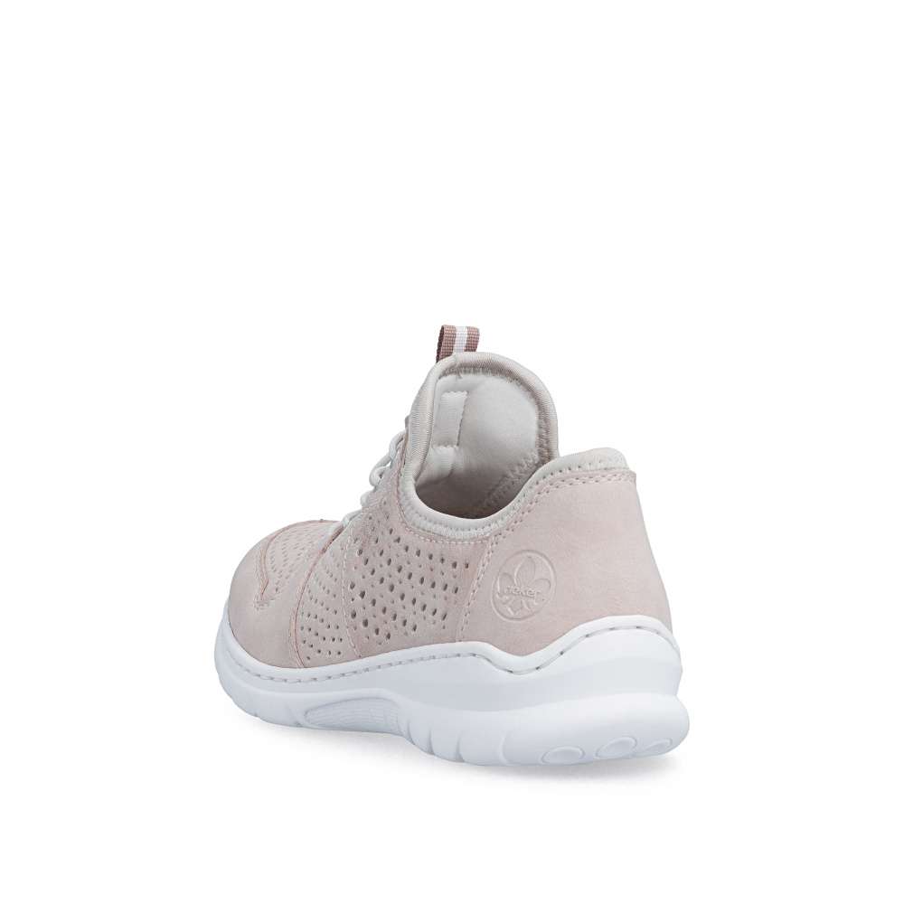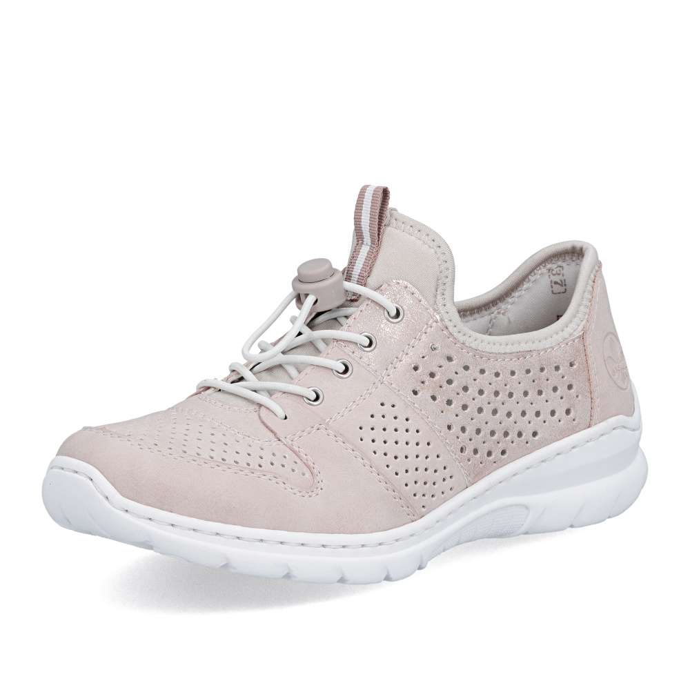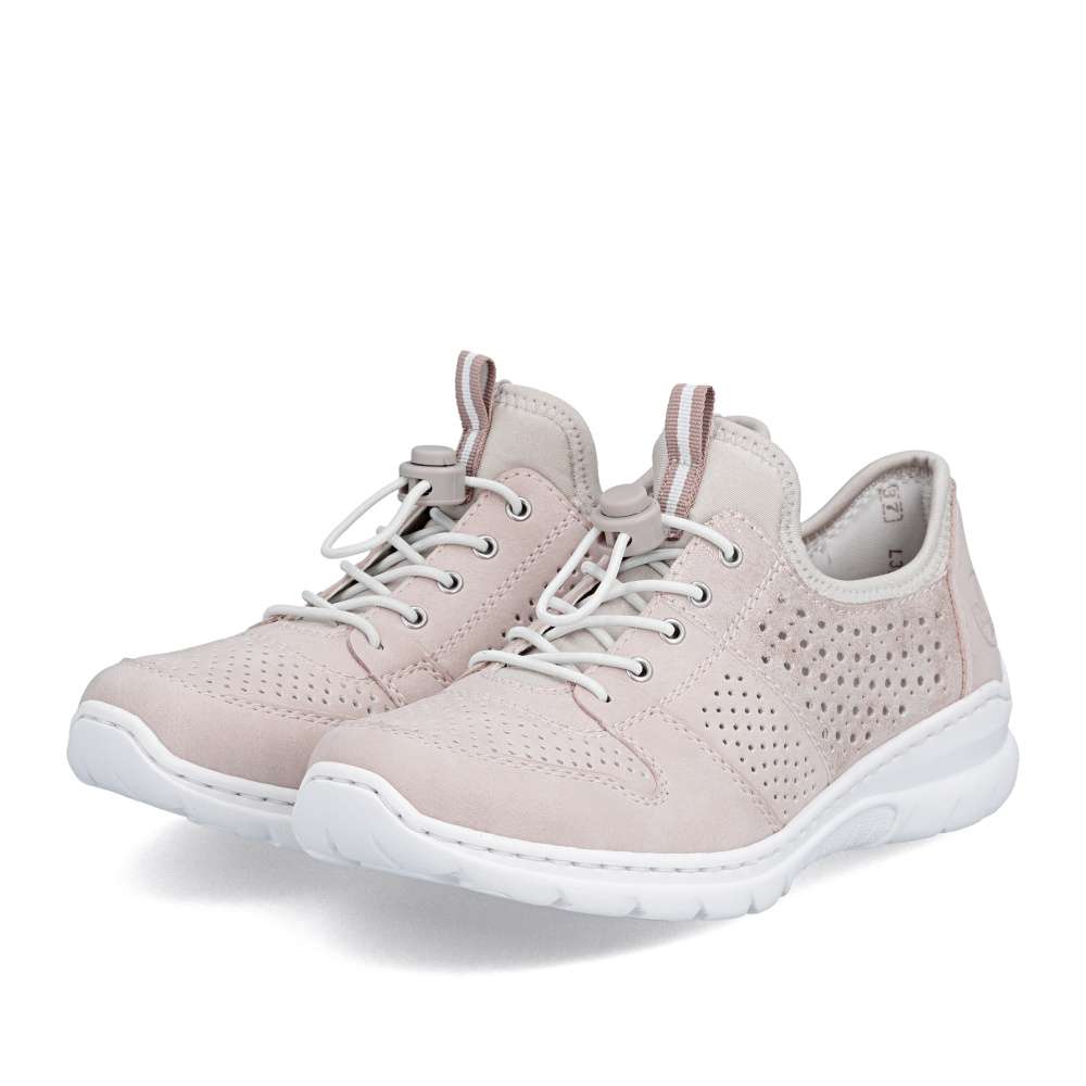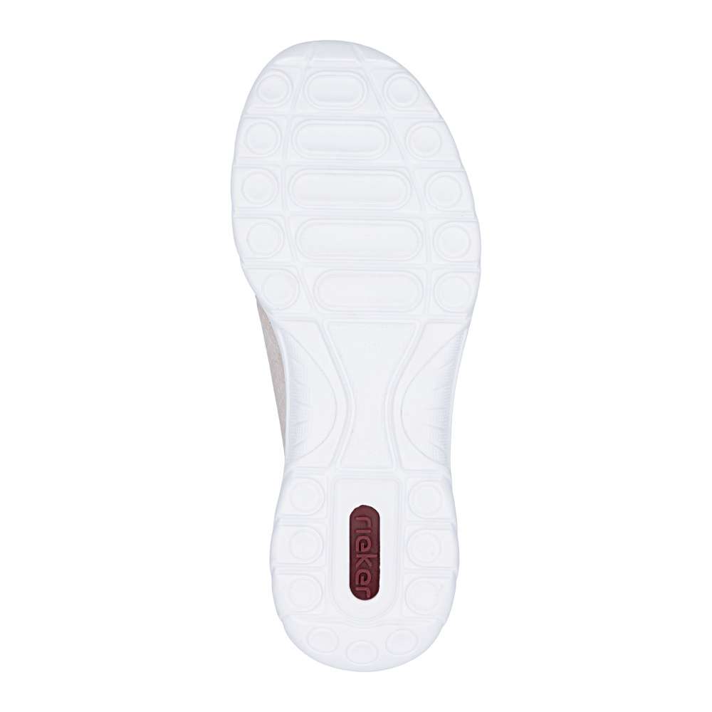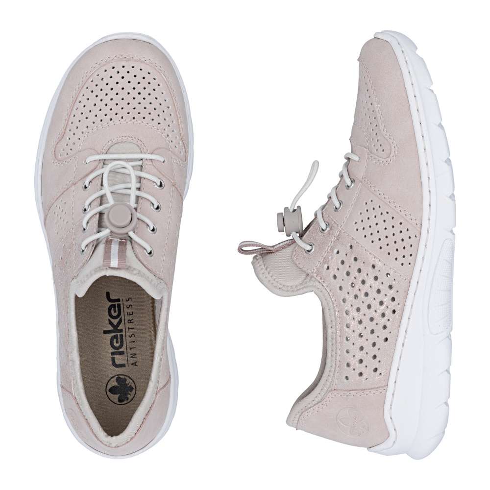 Tenisky RIEKER představují harmonické spojení moderního designu a vysokého komfortu při nošení. Jemná kombinace pastelově růžových odstínů je doplněna perforovaným vzorem, odlesky materiálu boční části a decentním logem značky, což dodává obuvi svěží vzhled. Pružný lem horního okraje usnadní nazutí, šněrováním pomocí gumičky je u tohoto modelu pouze dekorací. O maximální pohodlí během celého dne se postará měkká stélka z paměťové pěny spolu s flexibilní podešví, která podporuje přirozený pohyb chodidla. Tyto tenisky jsou ideální volbou pro ženy, které hledají stylovou, lehkou a pohodlnou obuv pro každodenní nošení i volnočasové aktivity.