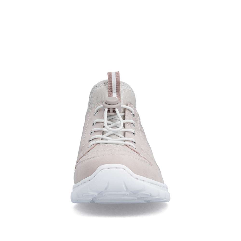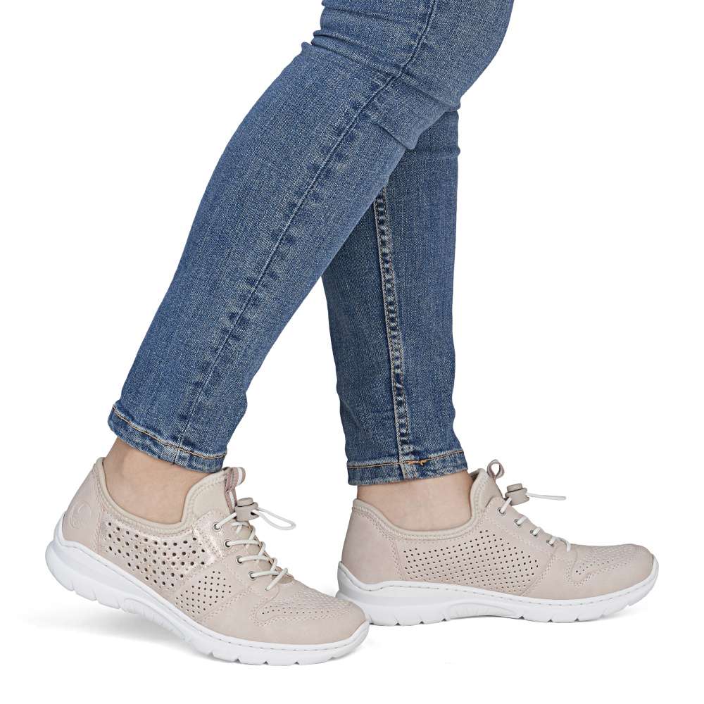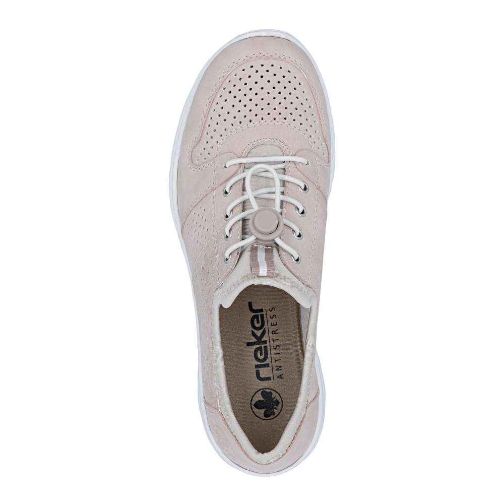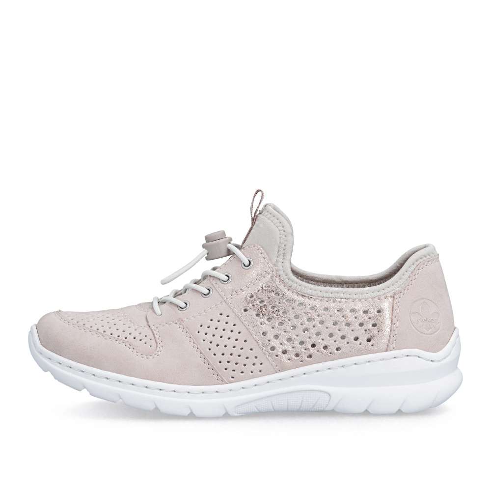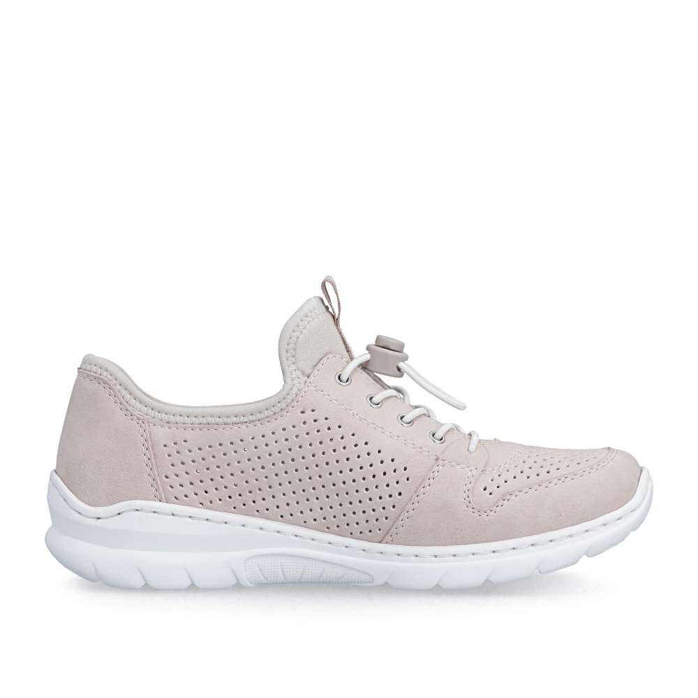 Tenisky RIEKER představují harmonické spojení moderního designu a vysokého komfortu při nošení. Jemná kombinace pastelově růžových odstínů je doplněna perforovaným vzorem, odlesky materiálu boční části a decentním logem značky, což dodává obuvi svěží vzhled. Pružný lem horního okraje usnadní nazutí, šněrováním pomocí gumičky je u tohoto modelu pouze dekorací. O maximální pohodlí během celého dne se postará měkká stélka z paměťové pěny spolu s flexibilní podešví, která podporuje přirozený pohyb chodidla. Tyto tenisky jsou ideální volbou pro ženy, které hledají stylovou, lehkou a pohodlnou obuv pro každodenní nošení i volnočasové aktivity.