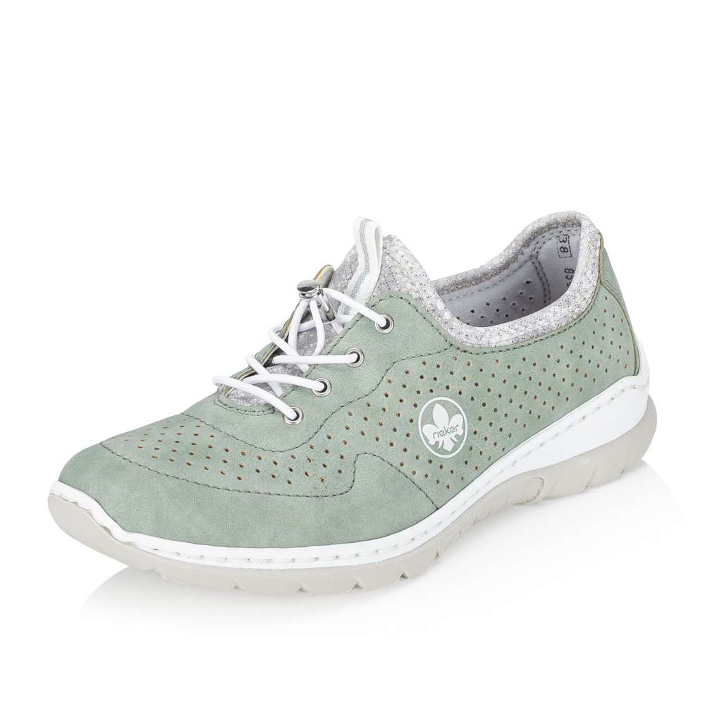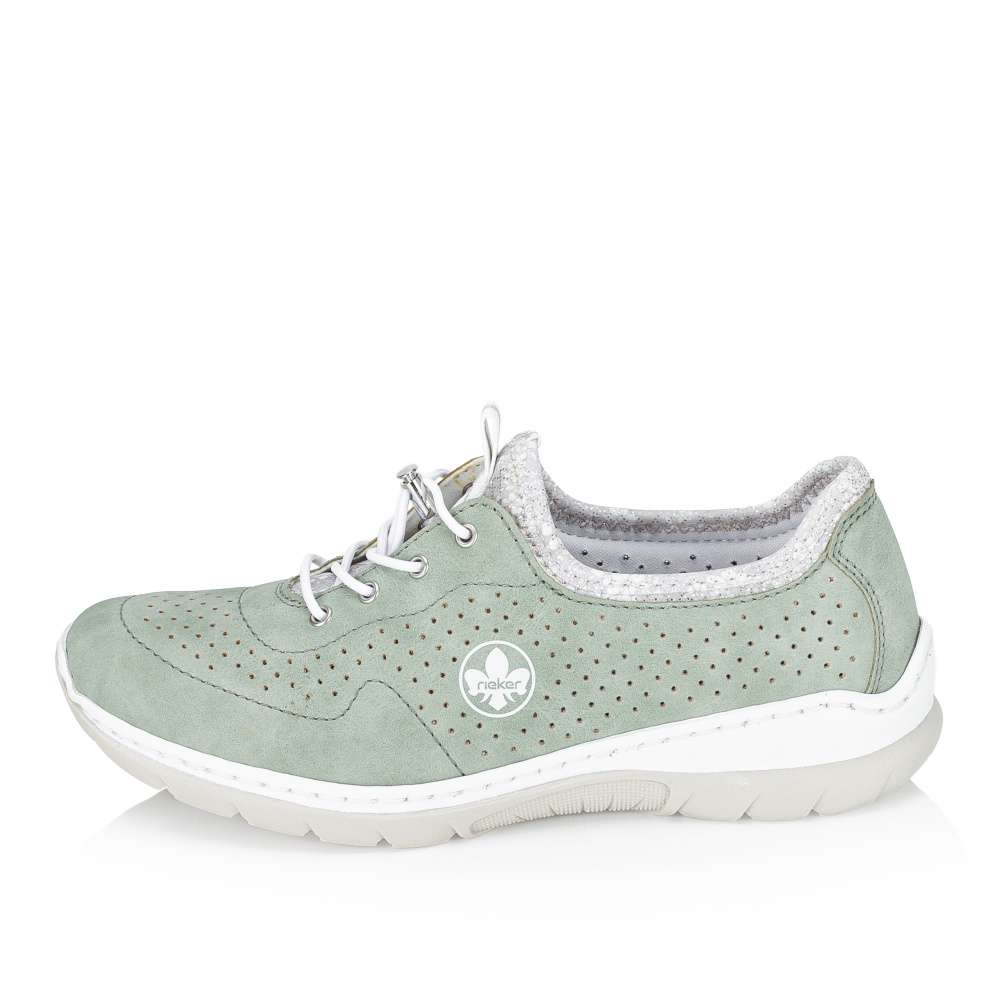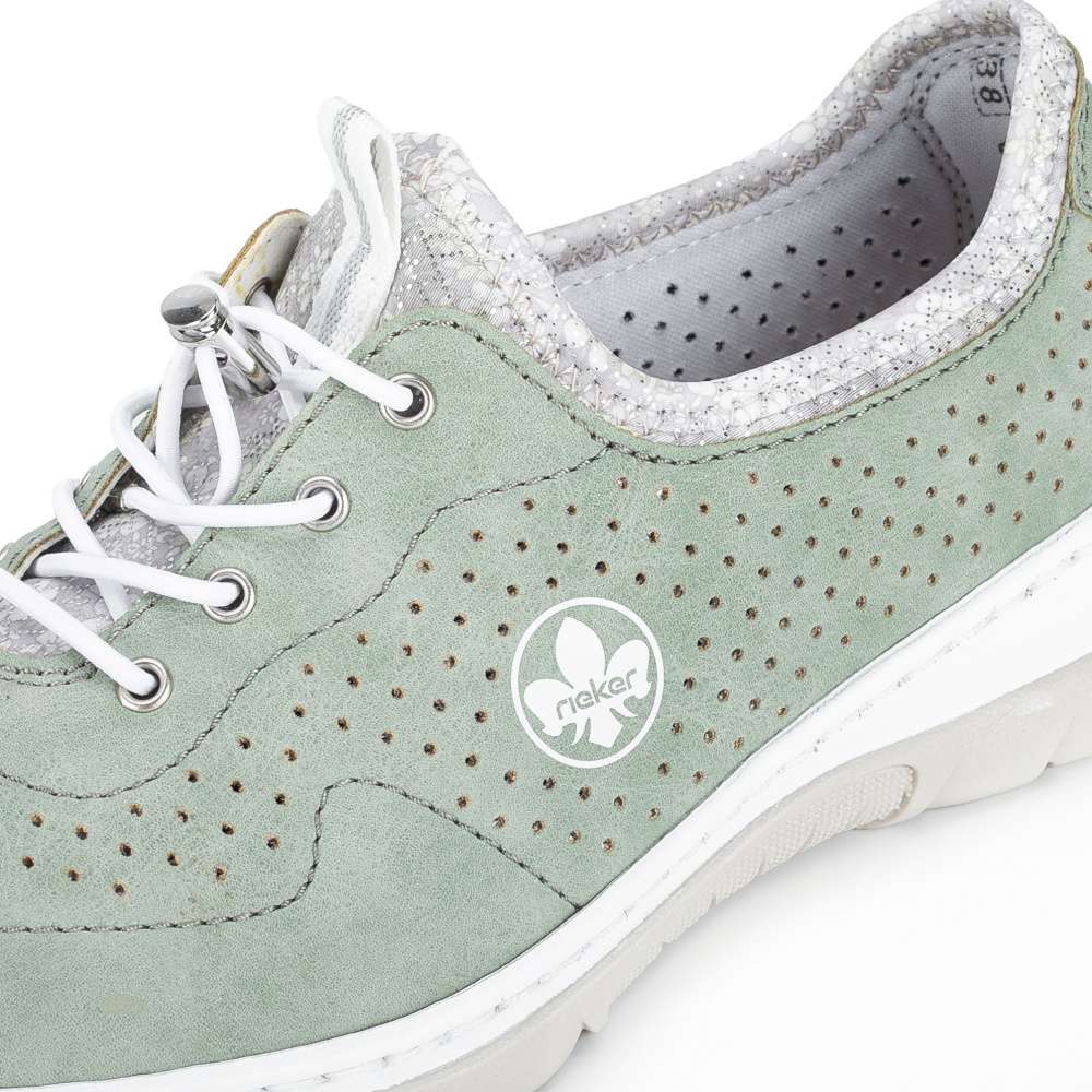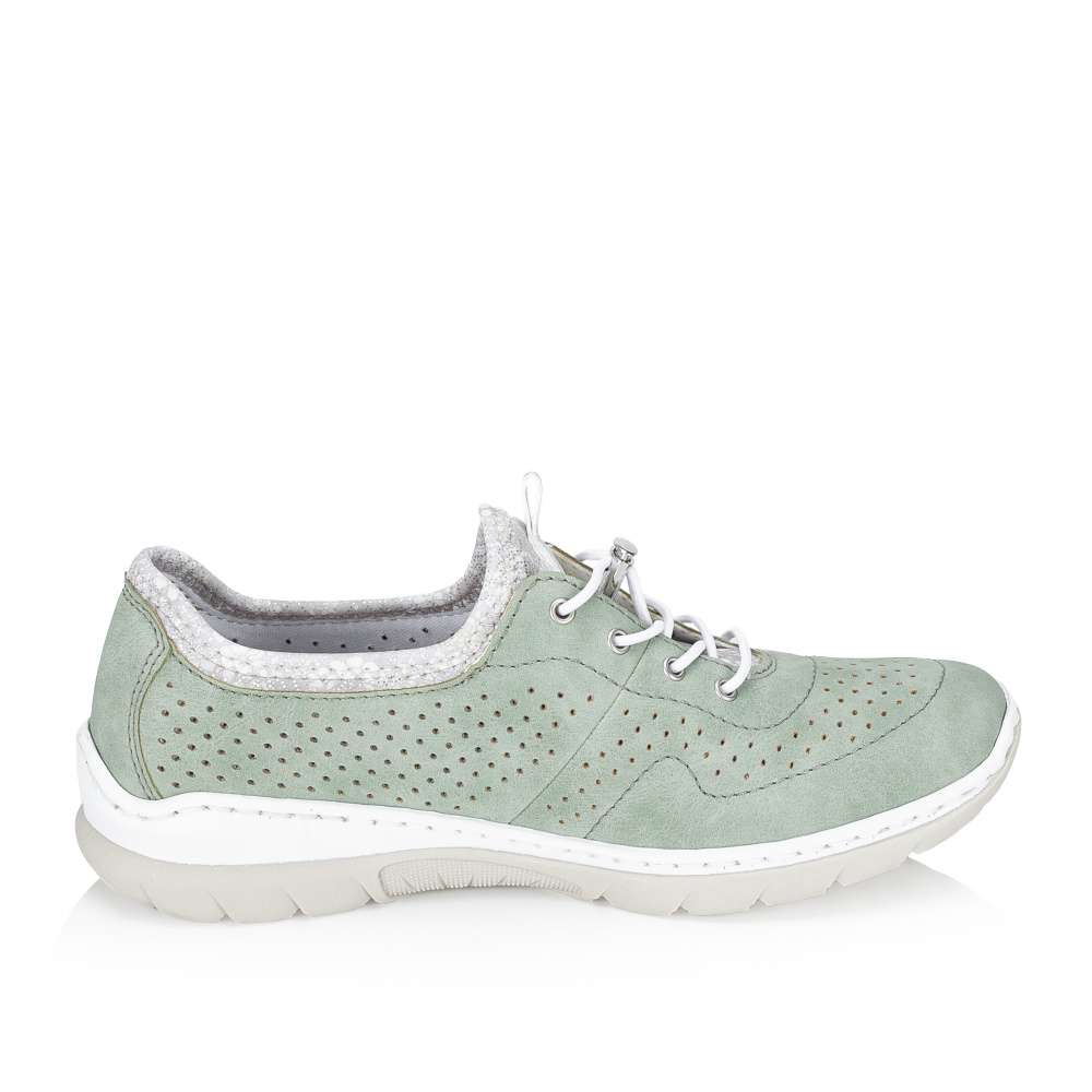 Zelené tenisky RIEKER upoutají na první pohled jemným perforovaným vzorem, který spolu s decentním logem značky vytváří svěží vzhled. Pružný lem horního okraje umožňuje rychlé a pohodlné nazutí, zatímco šněrování se stahovací gumičkou má především dekorativní charakter a dodává modelu stylový akcent. O příjemný pocit při chůzi se postará stélka z paměťové pěny, která se přirozeně přizpůsobí chodidlu, spolu s flexibilní podešví, zajišťující snadný krok a celodenní komfort. Tyto tenisky jsou ideální volbou pro každodenní nošení, kdy chcete spojit pohodlí se svěžím módním vzhledem.
