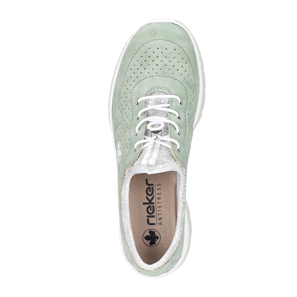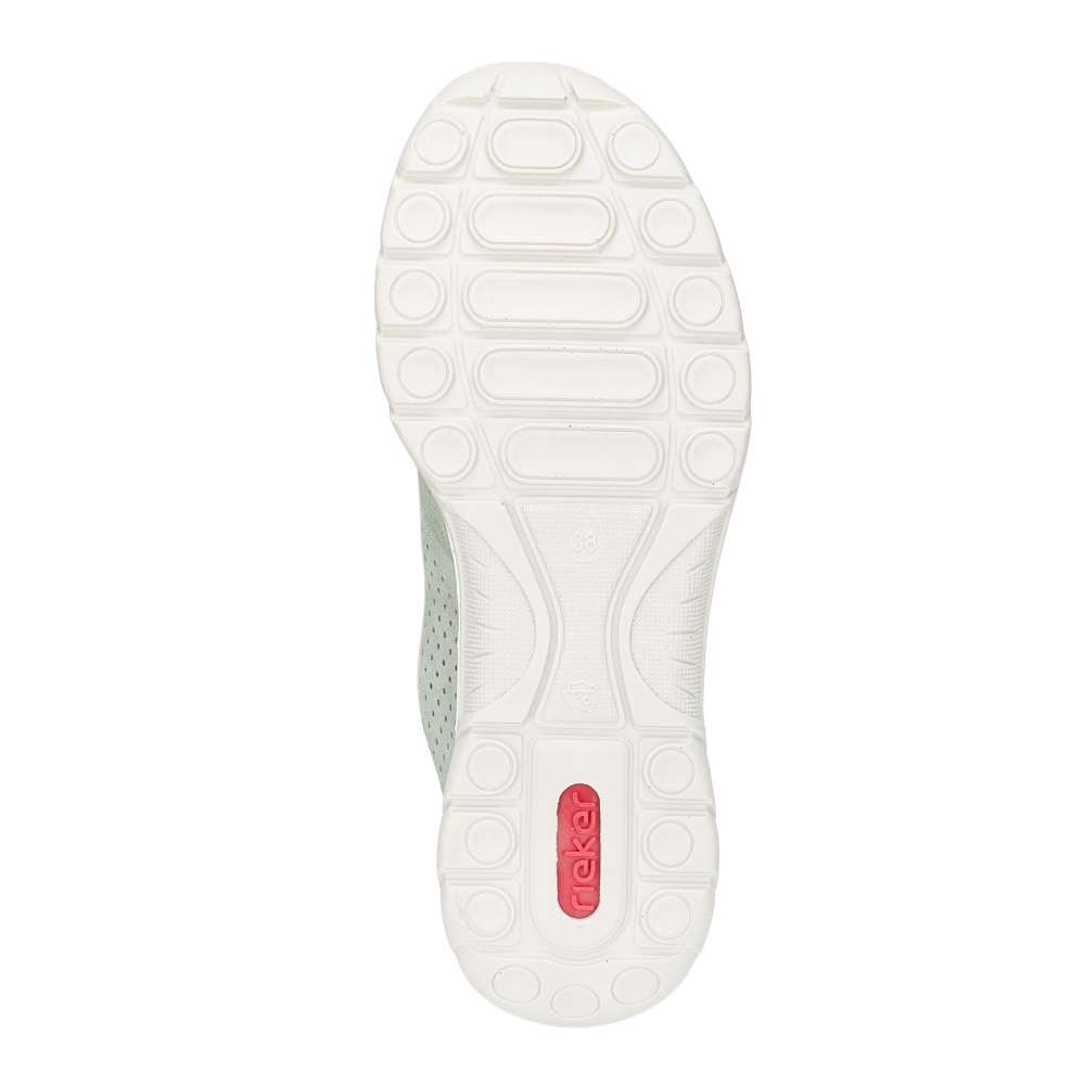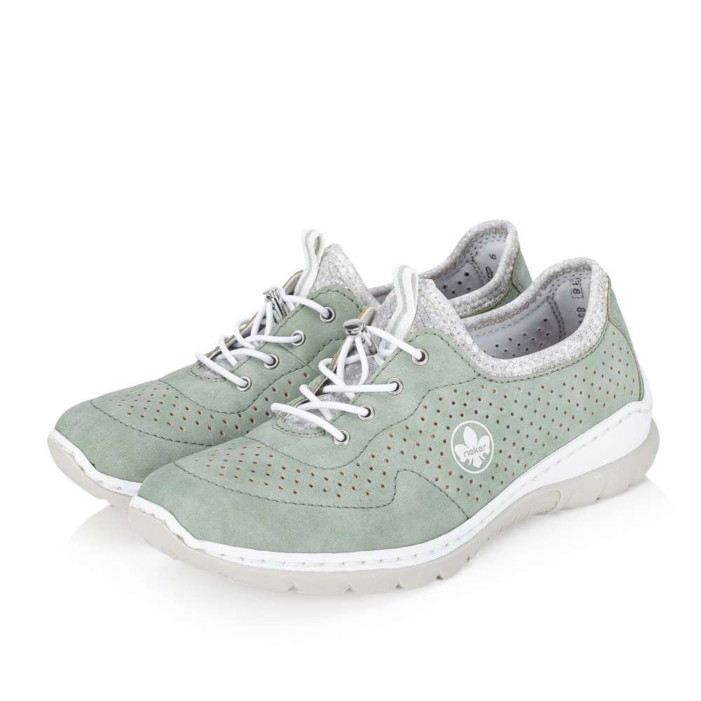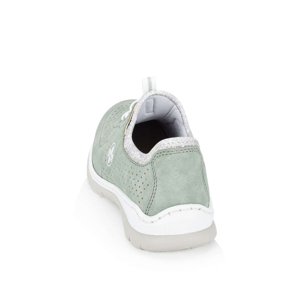 Zelené tenisky RIEKER upoutají na první pohled jemným perforovaným vzorem, který spolu s decentním logem značky vytváří svěží vzhled. Pružný lem horního okraje umožňuje rychlé a pohodlné nazutí, zatímco šněrování se stahovací gumičkou má především dekorativní charakter a dodává modelu stylový akcent. O příjemný pocit při chůzi se postará stélka z paměťové pěny, která se přirozeně přizpůsobí chodidlu, spolu s flexibilní podešví, zajišťující snadný krok a celodenní komfort. Tyto tenisky jsou ideální volbou pro každodenní nošení, kdy chcete spojit pohodlí se svěžím módním vzhledem.