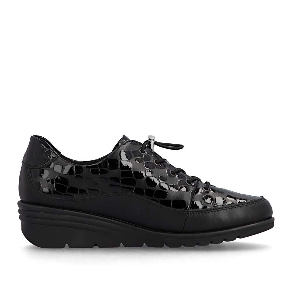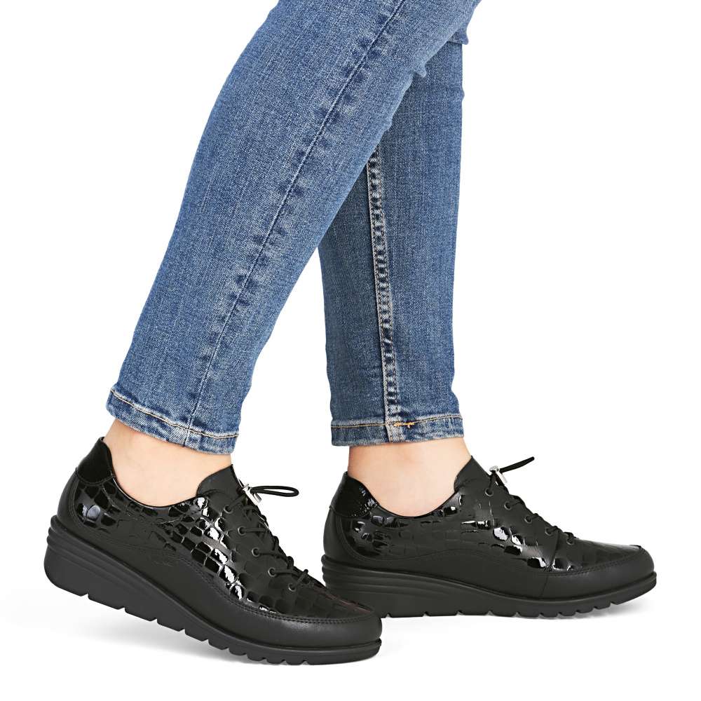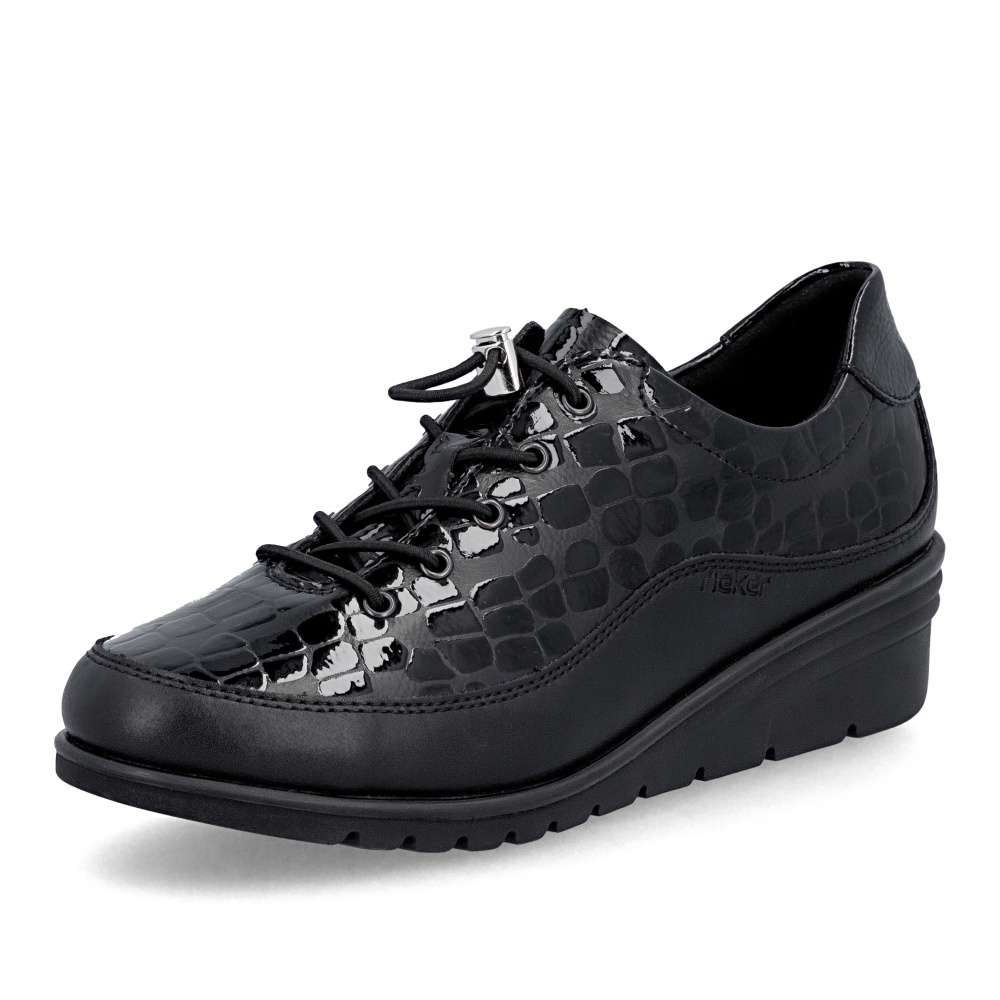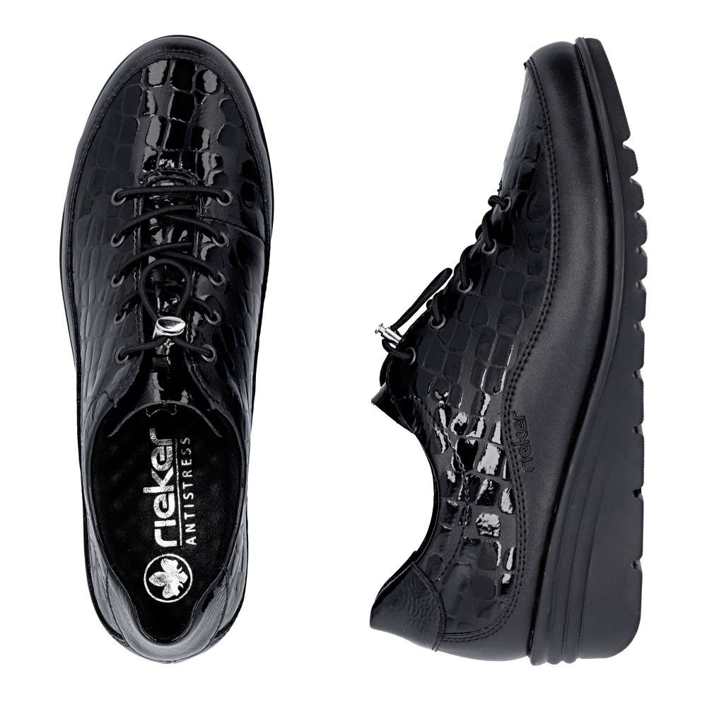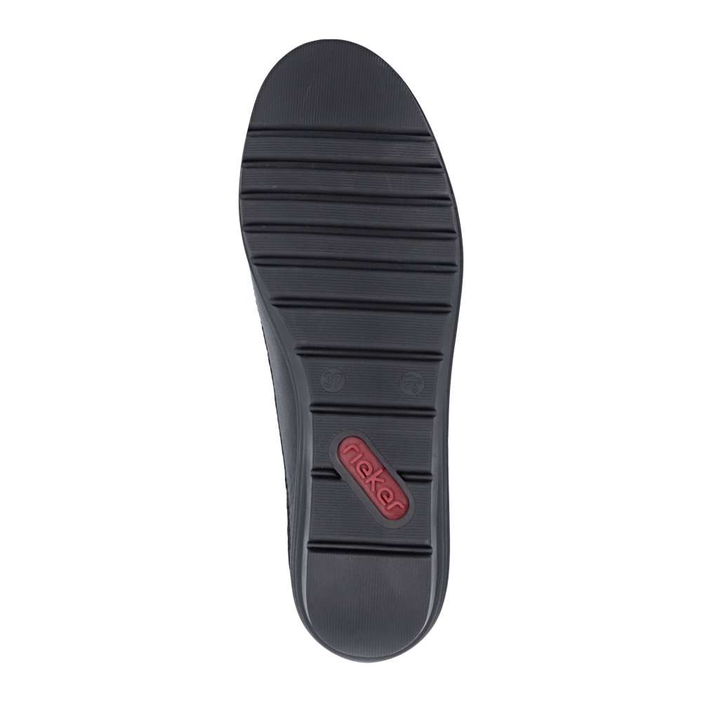 Neodolatelný vzhled v dokonalém pohodlí – přesně to přináší tento model RIEKER. Černý svršek s lesklou úpravou a atraktivním vzorem působí luxusně, díky čemuž se boty stanou výrazným doplňkem každého outfitu. Pružná gumička se stahovacím prvkem zajišťuje snadné obutí a perfektní přizpůsobení noze. Uvnitř se nachází kožená stélka, která poskytuje příjemný pocit při nošení a komfort i po celý den. Vyšší, stabilní podešev účinně tlumí nárazy při chůzi, podporuje přirozený pohyb a zvyšuje pohodlí při každém kroku. Tyto boty RIEKER jsou ideální volbou pro ženy, které chtějí spojit výrazný styl s pohodlím – ať už do práce, do města, do práce nebo slavnostnější příležitosti. Technologie: Antistress – díky čtyřem antistresovým vlastnostem – lehkosti, pružnosti, prostornosti a vynikající absorpci nárazů – vám boty RIEKER nabídnou komfortnější chůzi.