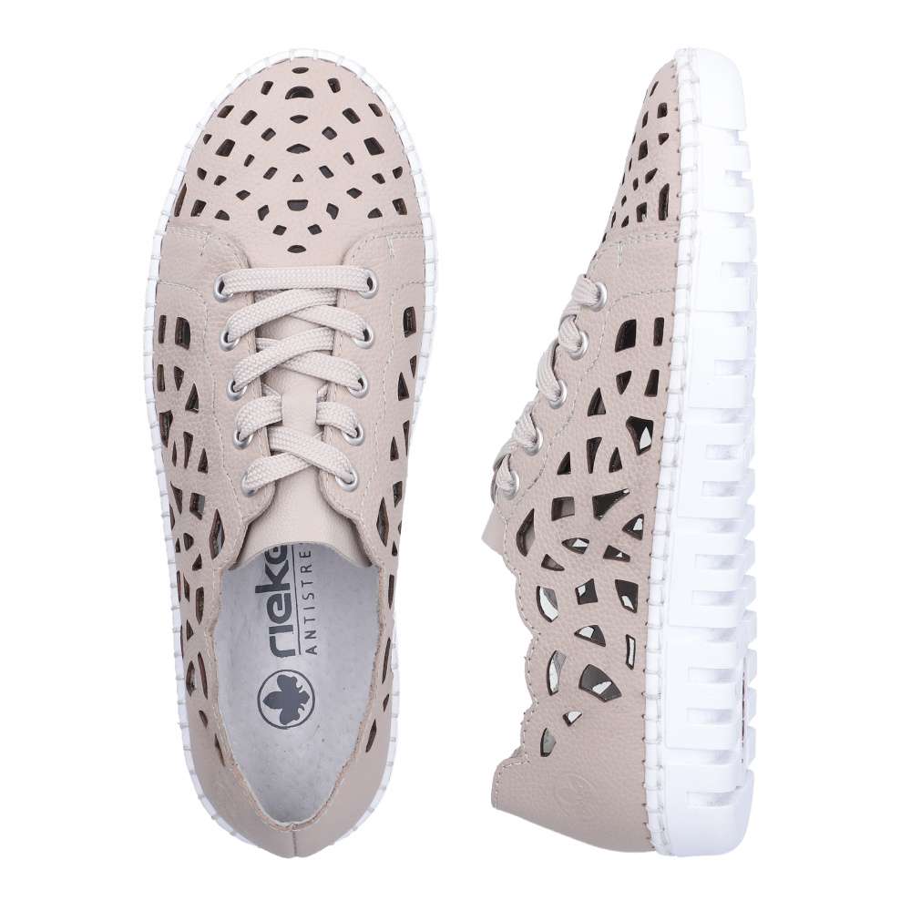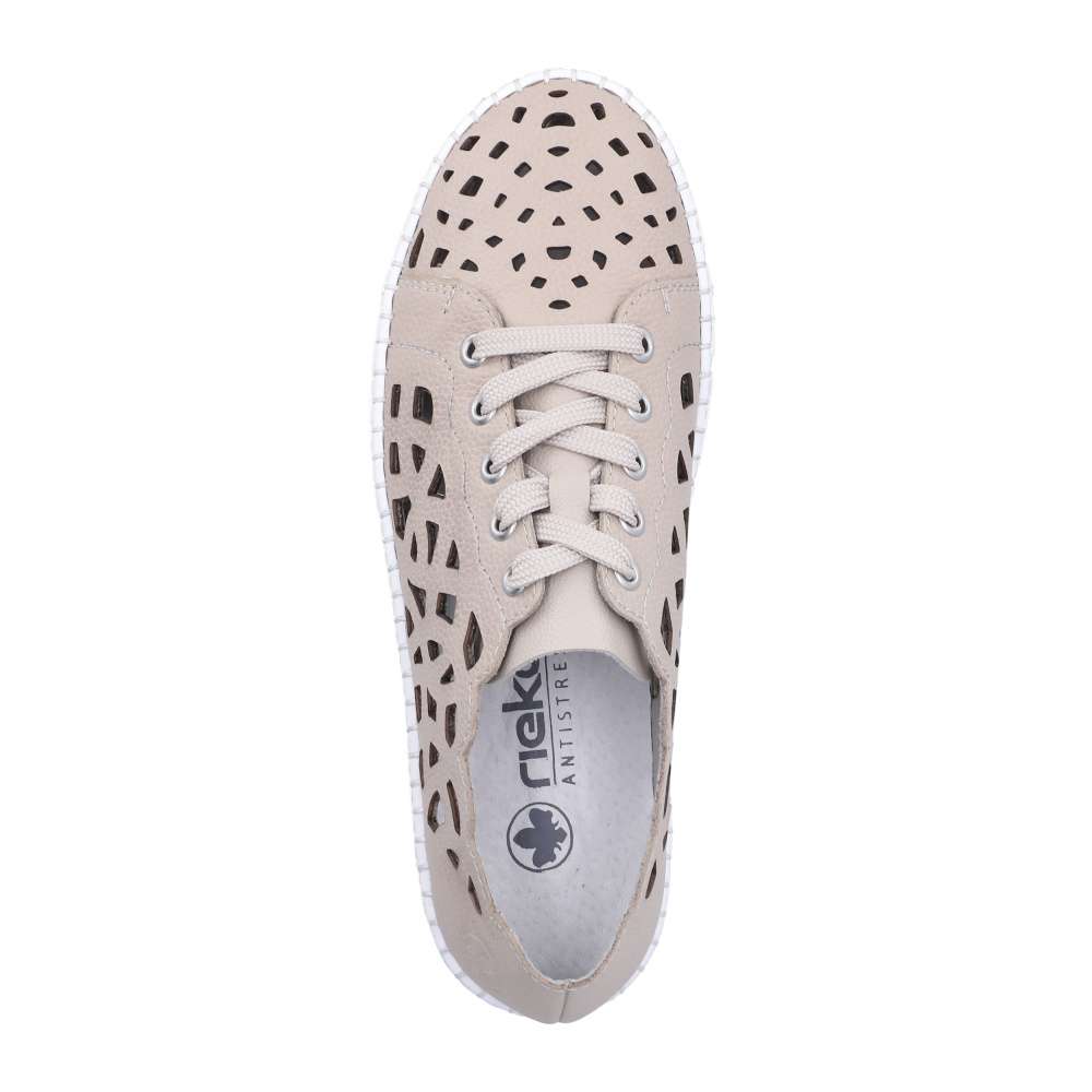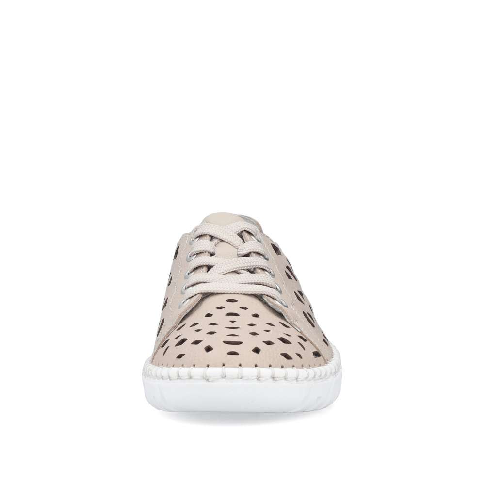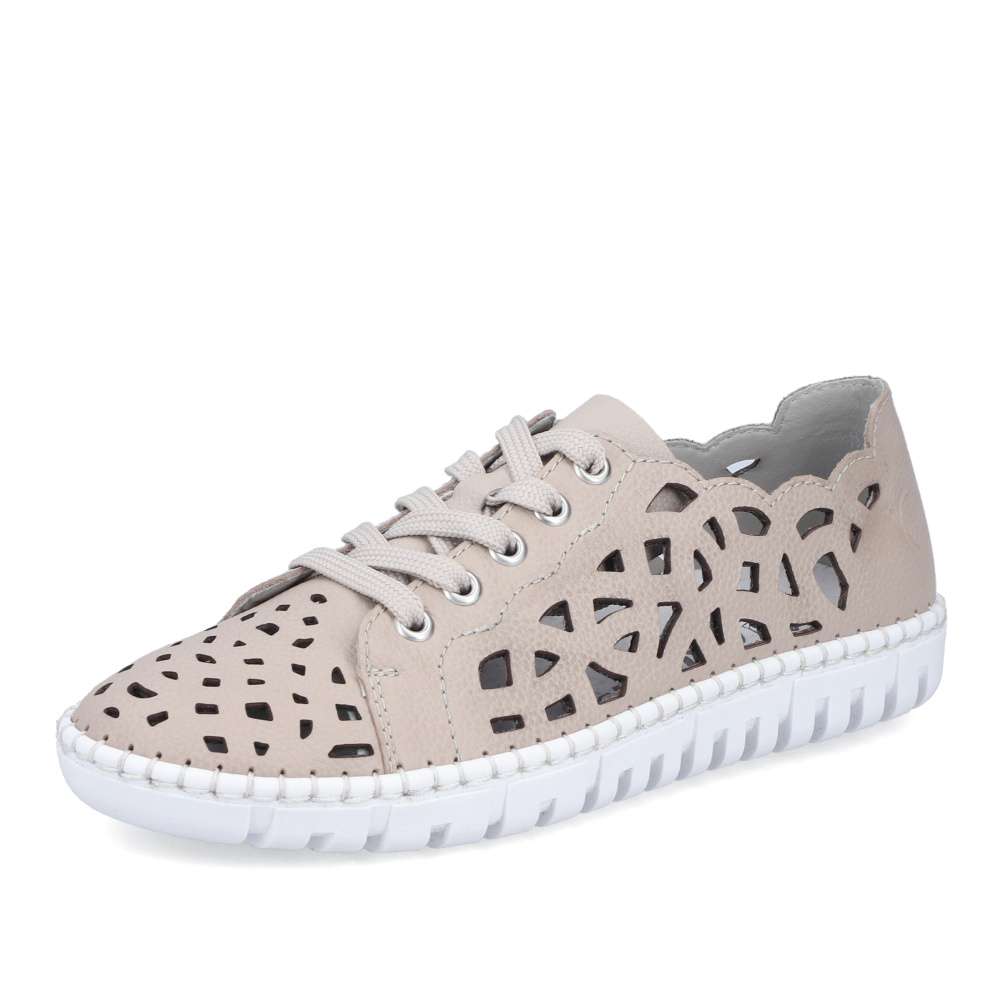 Boty RIEKER, které okamžitě upoutají pozornost svým jedinečným perforovaným vzorem koženého svršku v béžovém odstínu, spojují styl a pohodlí v dokonalém souladu. Šněrování umožňuje přesné přizpůsobení tvaru chodidla a usnadní nazutí, kdy vstoupíte na koženou stélku zajišťující příjemný a pohodlný došlap. Zatímco flexibilní podešev tlumící nárazy přináší lehkost, stabilitu a přirozený pohyb při každém kroku. Tyto boty jsou ideální pro ženy, které chtějí vyzařovat originalitu a zároveň ocení komfort při každodenních povinnostech nebo volnočasových aktivitách.