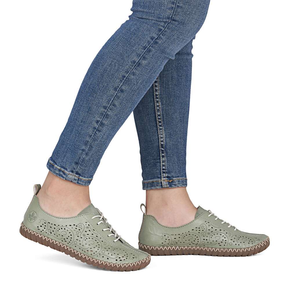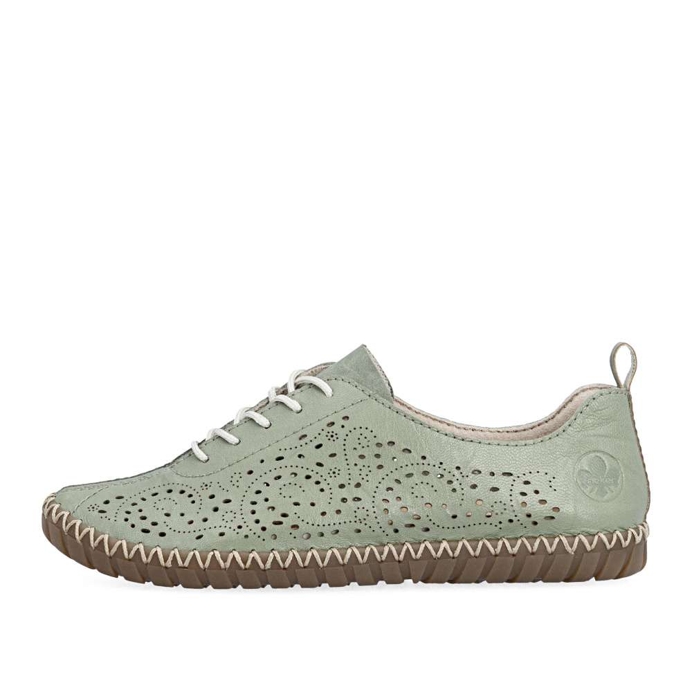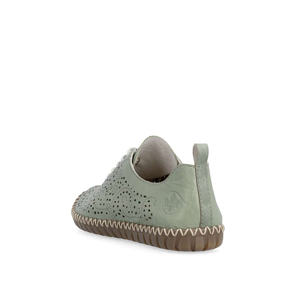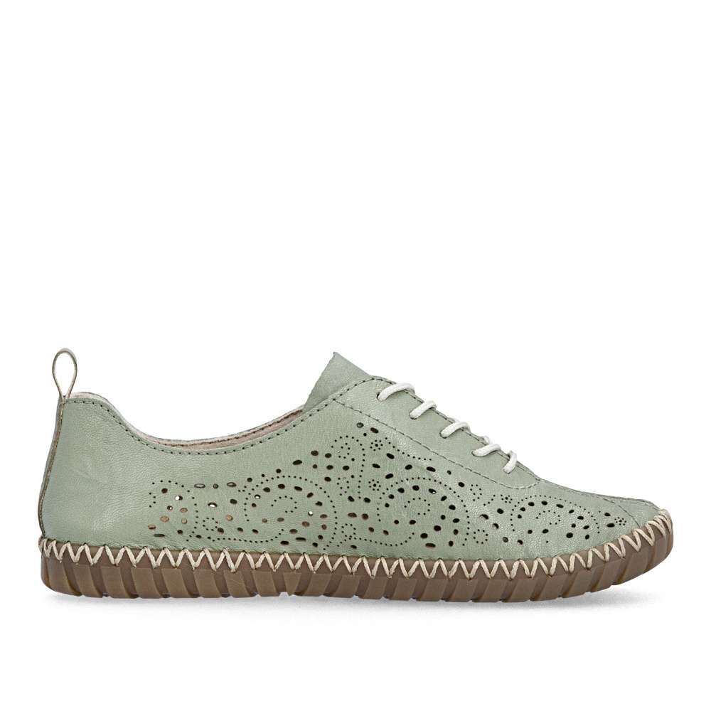 Půvabný zelený odstín bot od značky Rieker zaujme na první pohled svojí svěžestí a nadčasovým charakterem. Svršek zdobí minimalistická perforace, která dodává modelu jemný detail a zároveň podporuje lepší prodyšnost. Decentní logo značky podtrhuje kvalitu a originální design obuvi. Klasické šněrování umožňuje přizpůsobit si boty přesně podle tvaru chodidla a příjemná stélka se postará o komfort při každém kroku. Flexibilní podešev podporuje přirozený pohyb chodidla a efektivně tlumí nárazy při chůzi. Tento model je ideální volbou pro ženy, které hledají kombinaci svěžího vzhledu, pohodlí a praktičnosti pro každý den.