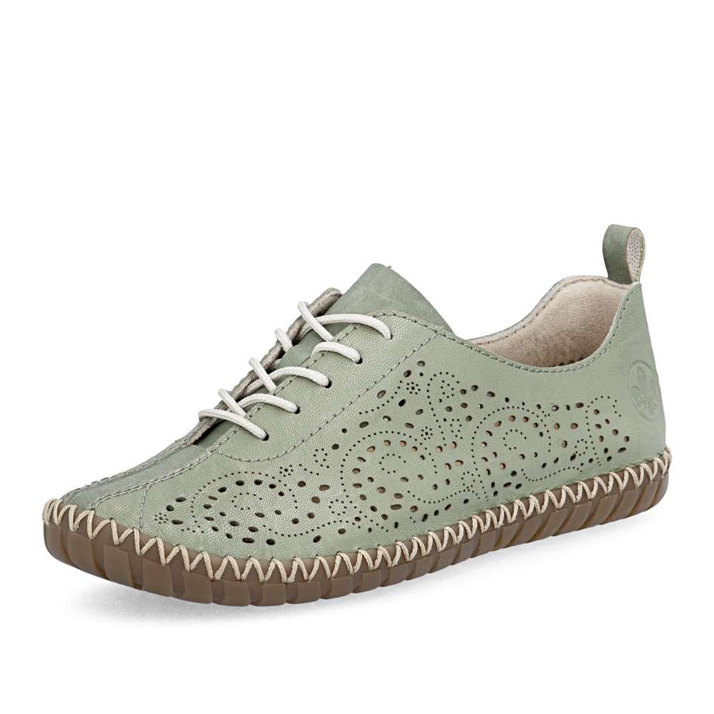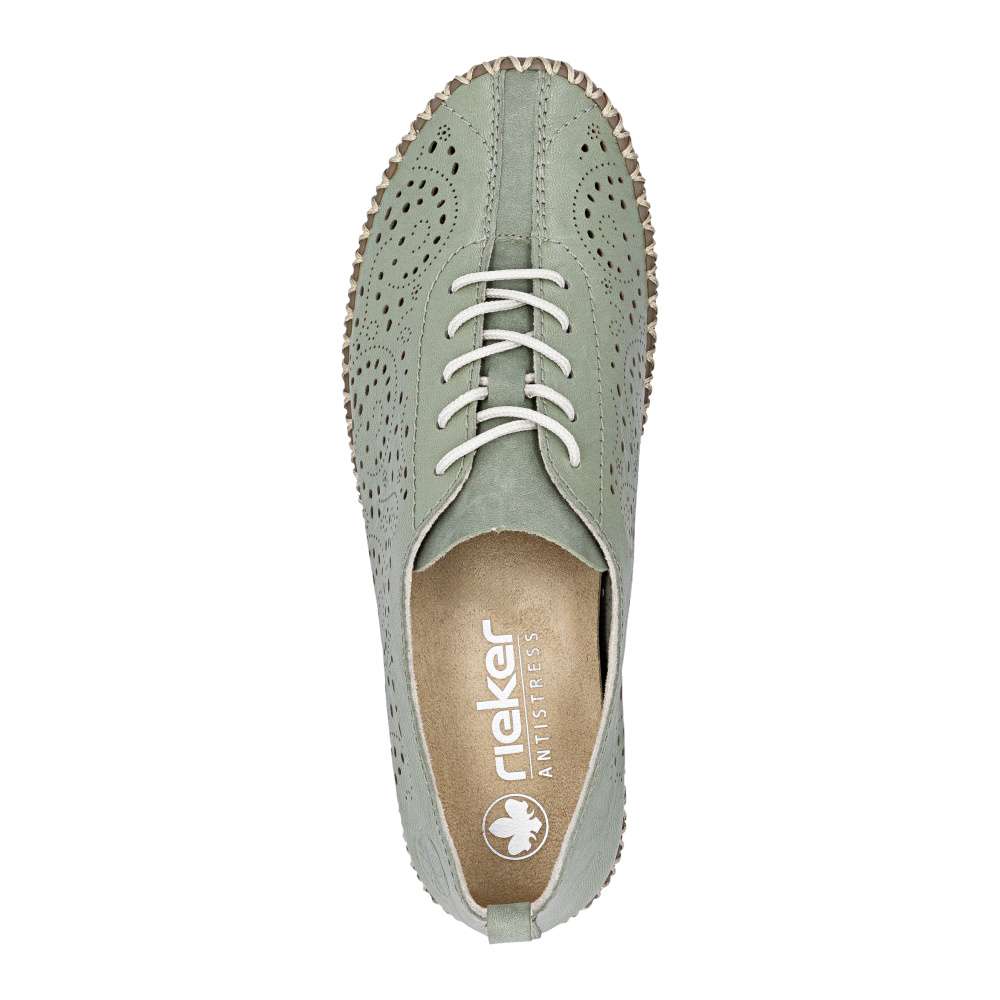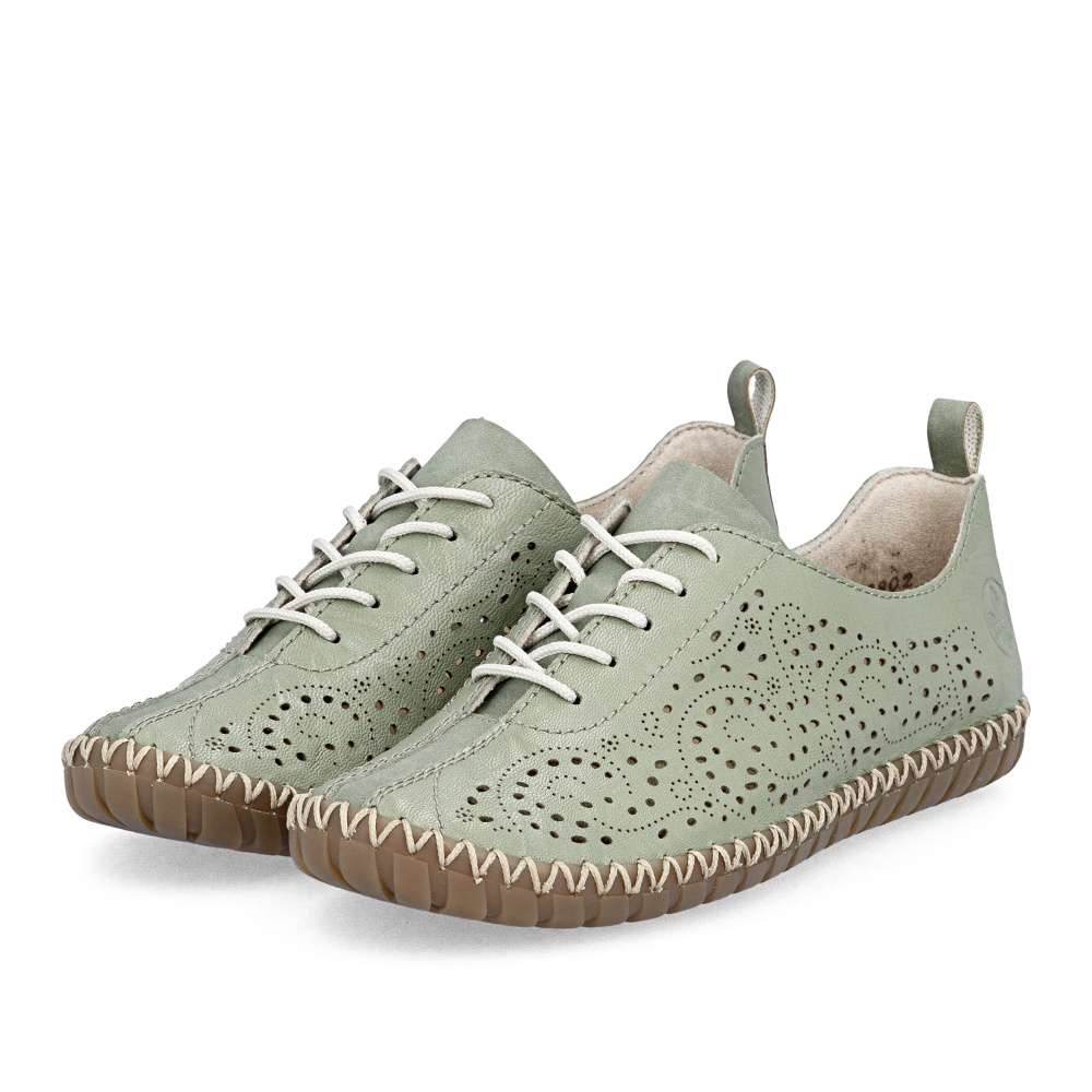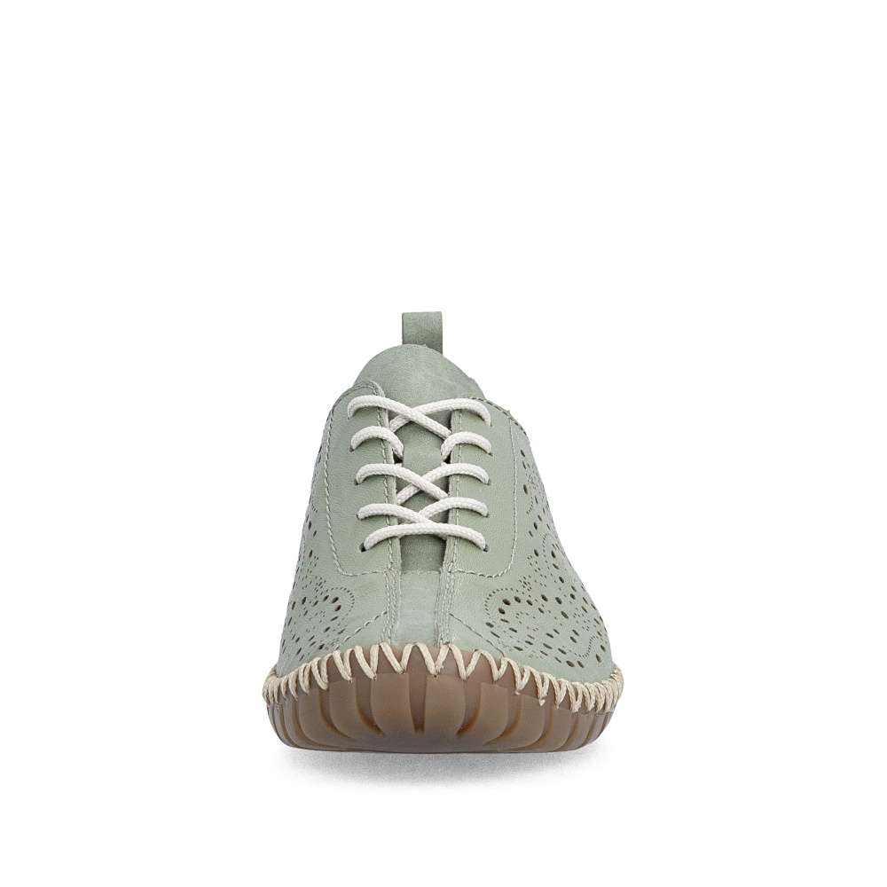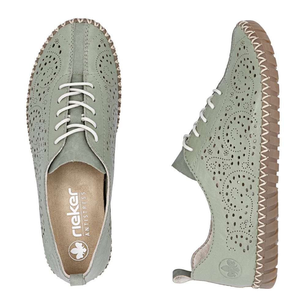 Půvabný zelený odstín bot od značky Rieker zaujme na první pohled svojí svěžestí a nadčasovým charakterem. Svršek zdobí minimalistická perforace, která dodává modelu jemný detail a zároveň podporuje lepší prodyšnost. Decentní logo značky podtrhuje kvalitu a originální design obuvi. Klasické šněrování umožňuje přizpůsobit si boty přesně podle tvaru chodidla a příjemná stélka se postará o komfort při každém kroku. Flexibilní podešev podporuje přirozený pohyb chodidla a efektivně tlumí nárazy při chůzi. Tento model je ideální volbou pro ženy, které hledají kombinaci svěžího vzhledu, pohodlí a praktičnosti pro každý den.