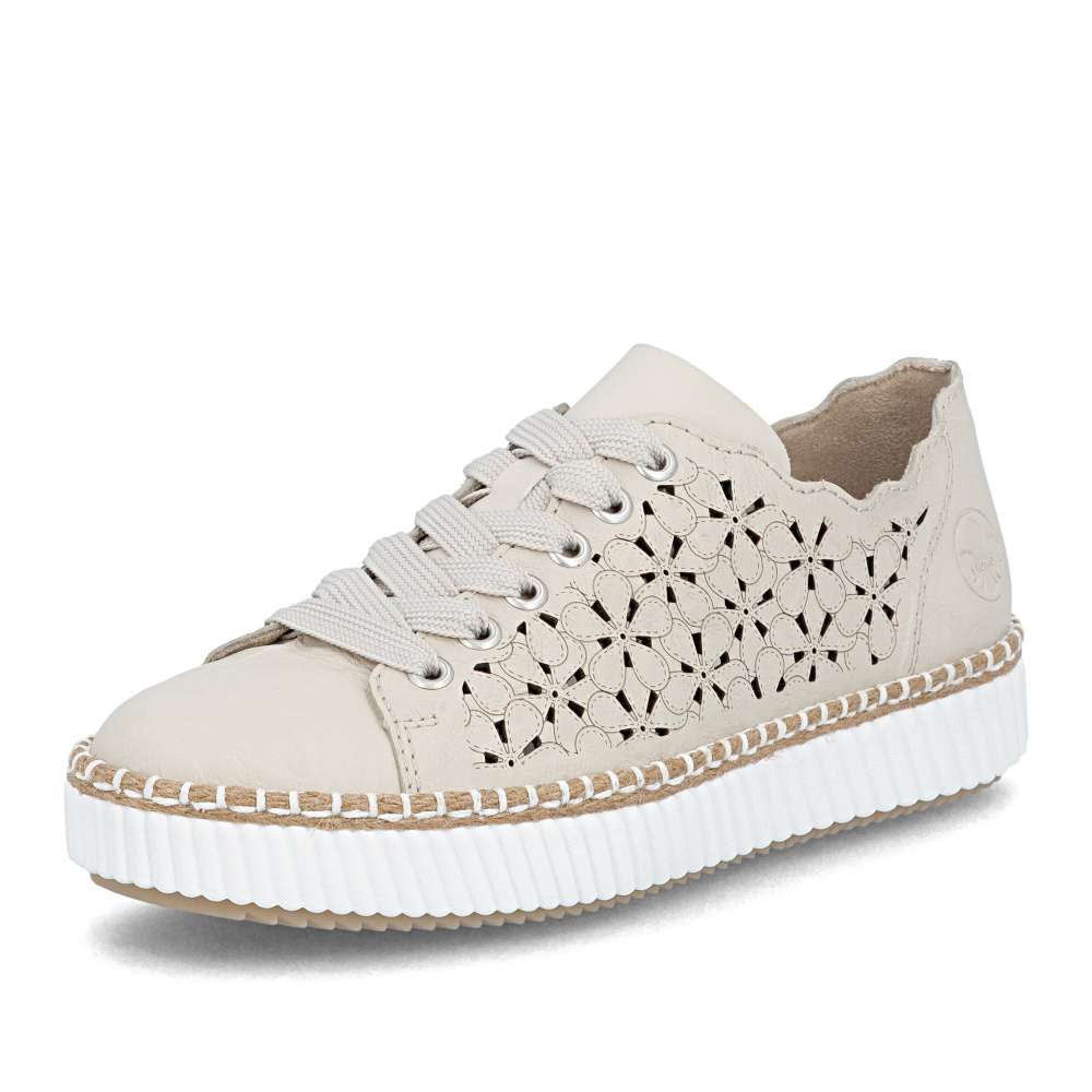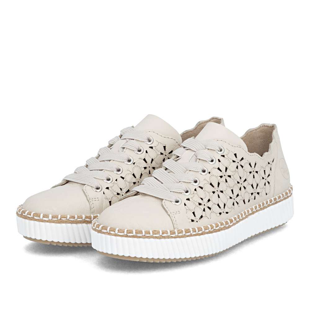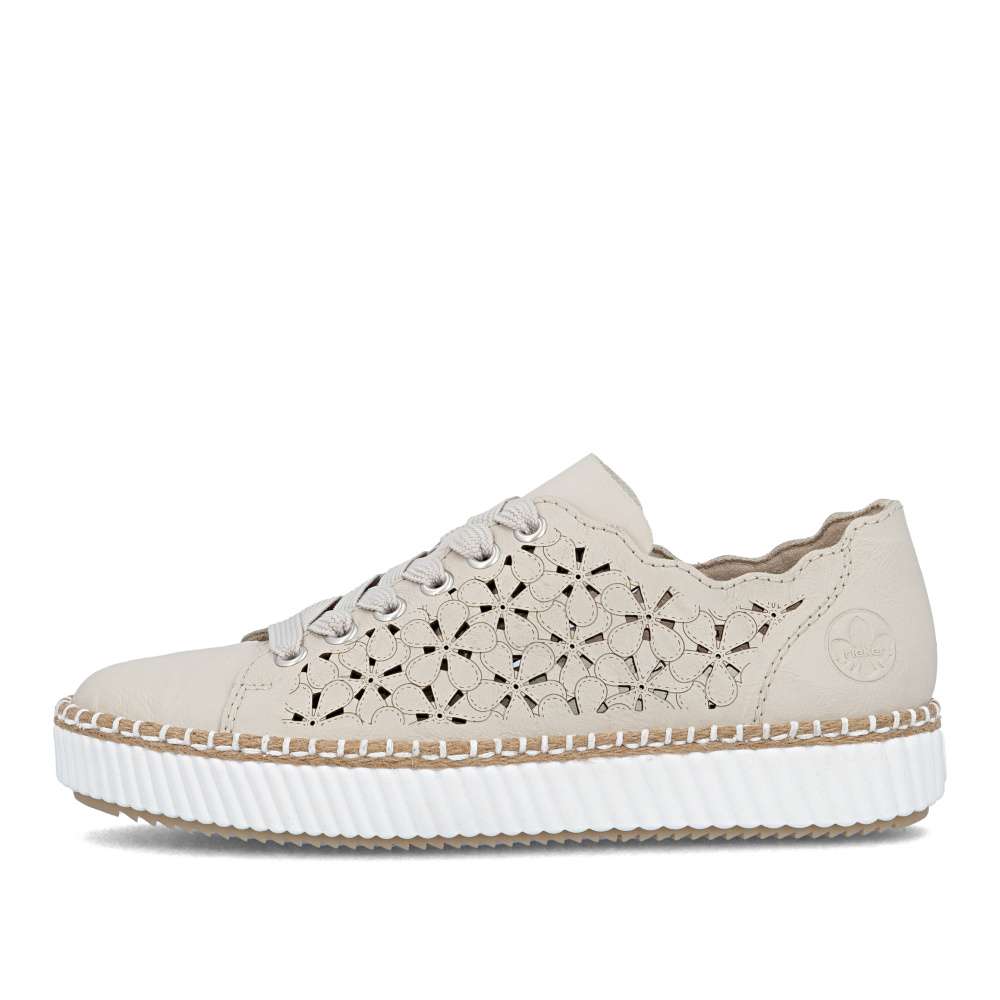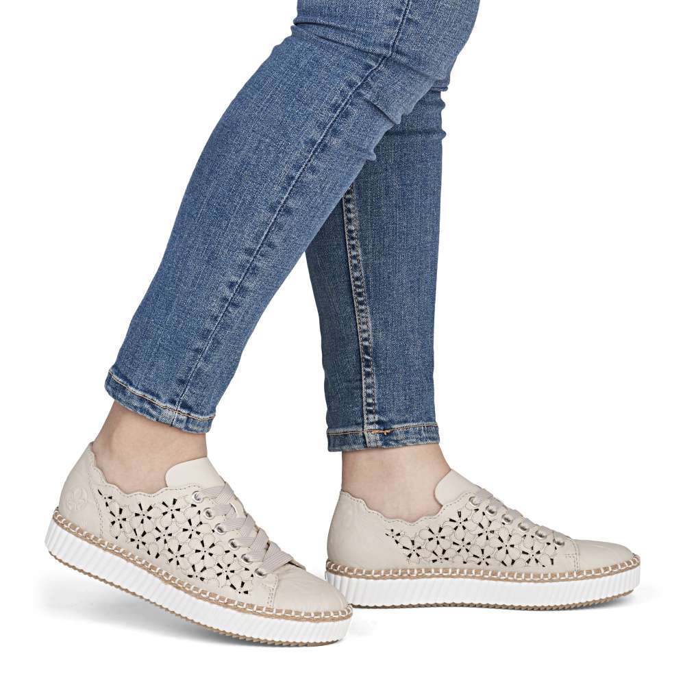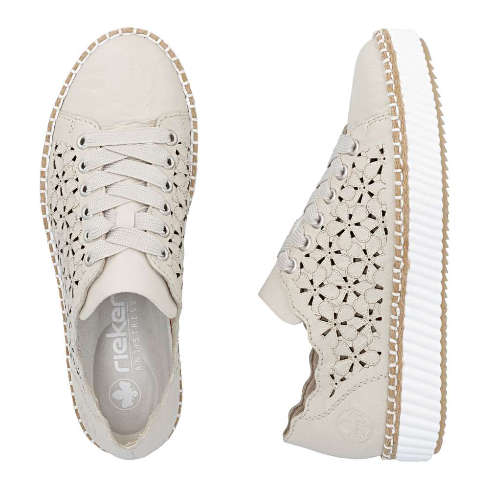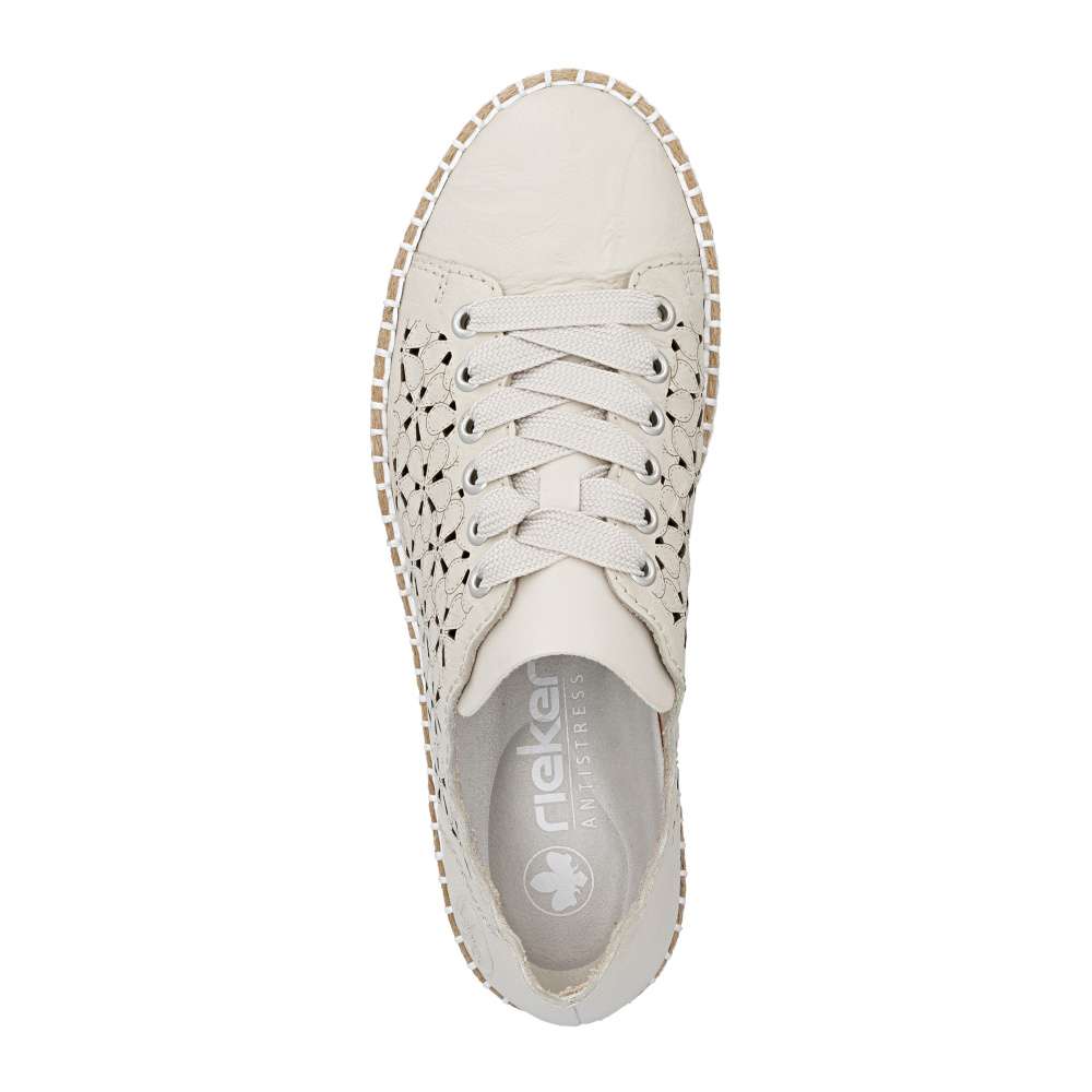 Tyto tenisky RIEKER upoutají neodolatelným vzhledem a moderním designem. Béžový kožený svršek je doplněn působivým perforovaným vzorem a decentním logem značky, které spolu vytvářejí stylový a prémiový charakter. Horní okraj je navržen v atraktivních liniích, které zvýrazňují dynamiku a mladistvou eleganci obuvi. Šněrování širokou šňůrkou v moderním stylu umožňuje přesné přizpůsobení boty tvaru chodidla a zároveň přidává výrazný módní detail. Vyjímatelná stélka je měkká, pohodlná a tvarovaná, poskytuje optimální podporu chodidlu a komfort při celodenním nošení. Podešev tenisek je nejen stylově propracovaná, ale navíc tlumí nárazy a zajišťuje stabilitu při každém kroku. Tento model tenisek je ideální volbou pro ženy, které hledají spojení módního vzhledu, pohodlí a praktičnosti, ať už pro každodenní nošení, do práce, na procházky nebo volnočasové aktivity. Technologie: Antistress – díky čtyřem antistresovým vlastnostem – lehkosti, pružnosti, prostornosti a vynikající absorpci nárazů – vám boty RIEKER nabídnou komfortnější chůzi. Rieker Soft – unikátní stélka vyrobená z prodyšného materiálu, která svým tvarem a materiálem zajistí pocit pohodlí při celodenním nošení. Tato bota je vybavena vyjímatelnou stélkou.