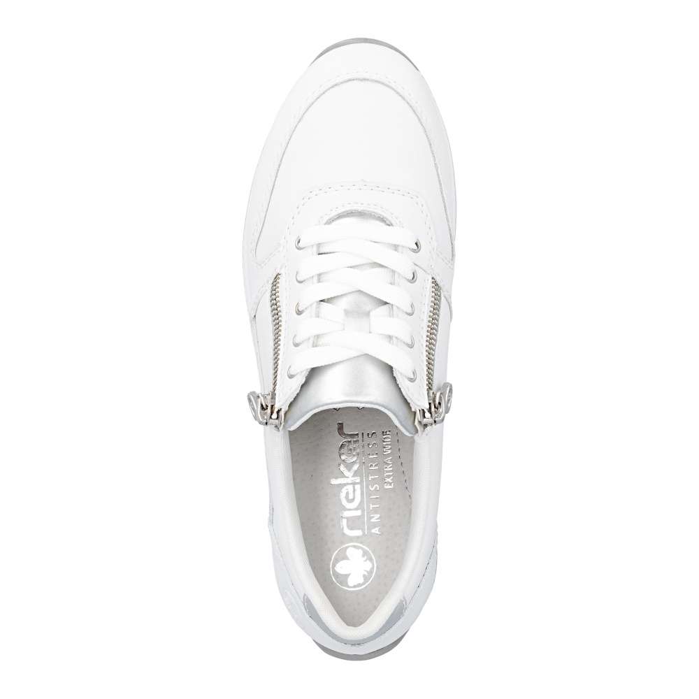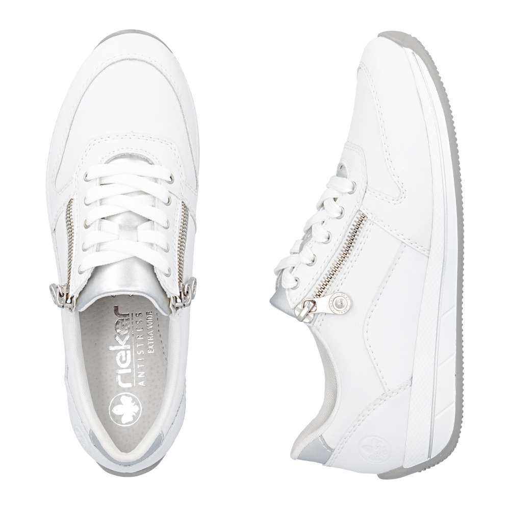Tyto tenisky RIEKER kombinují univerzální vzhled s moderním designem a funkčností, což ocení každý, kdo hledá komfortní řešení pro každodenní nošení. Bílý svršek působí sofistikovaně a je doplněn lesklou aplikací na patě a pod šněrováním, decentní logo značky dodává obuvi punc originality originální. Jemné detaily a propracované linie podtrhují kvalitu zpracování a dodávají botám nadčasový styl. Kombinace šněrování a zipu na nártu umožňuje snadné obouvání a přesné přizpůsobení boty tvaru nohy, čímž zajišťuje stabilitu a komfort při každém kroku. Vyjímatelná kožená stélka přináší pohodlí, které oceníte při celodenním nošení, a spolu s flexibilní podrážkou tlumící nárazy vytváří dokonalý komfort při nošení. Tyto tenisky jsou ideální volbou pro každodenní aktivity - ať už do práce, do města, na procházku nebo volný čas. Technologie: Tato bota je vybavena vyjímatelnou stélkou. Antistress – díky čtyřem antistresovým vlastnostem – lehkosti, pružnosti, prostornosti a vynikající absorpci nárazů – vám boty RIEKER nabídnou komfortnější chůzi.
