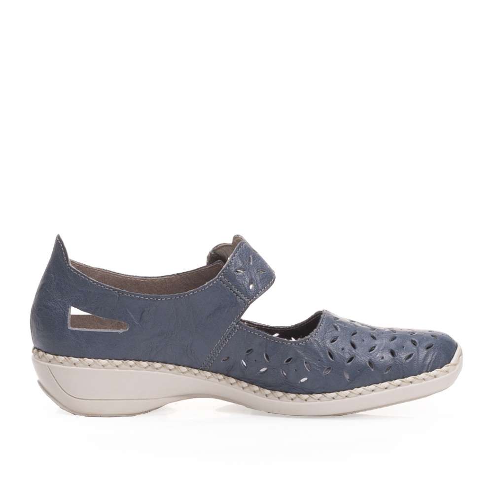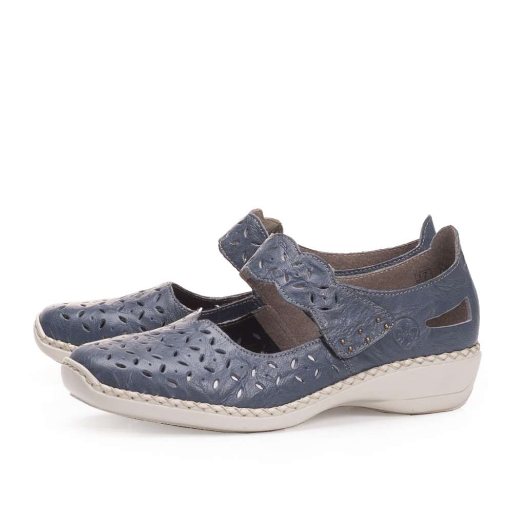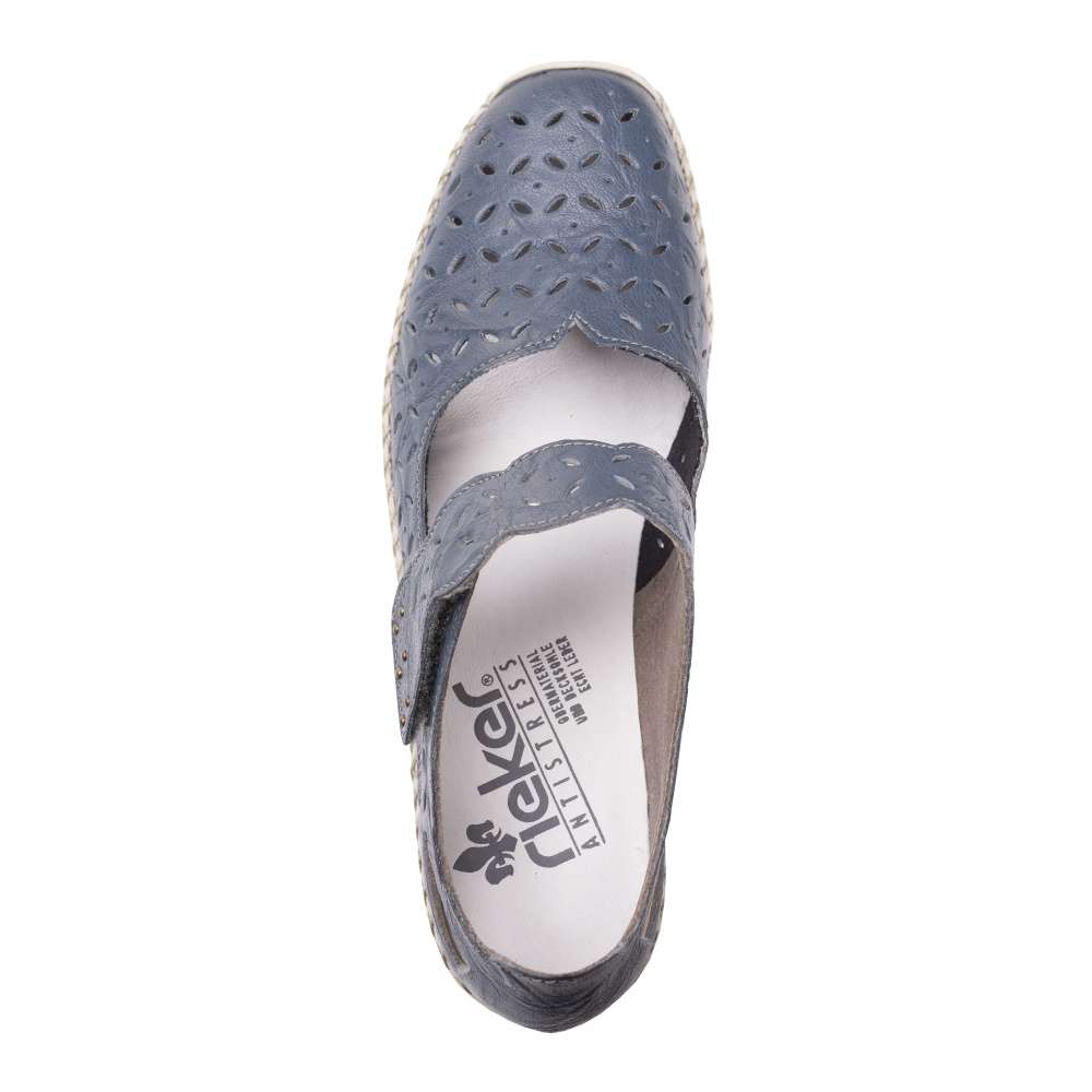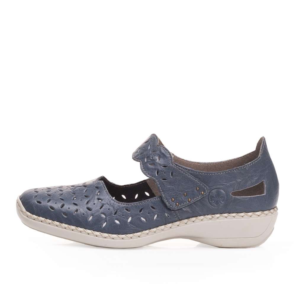 Tmavě modrý kožený svršek v kombinaci s perforací a výřezy v patě. Obuv si přizpůsobíte dle svých požadavků díky pásku přes nárt, který je vybaven suchým zipem a ozdoben logem RIEKER.