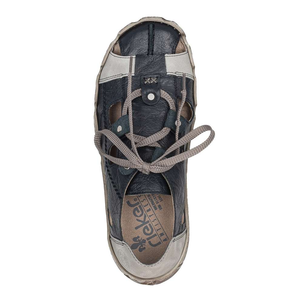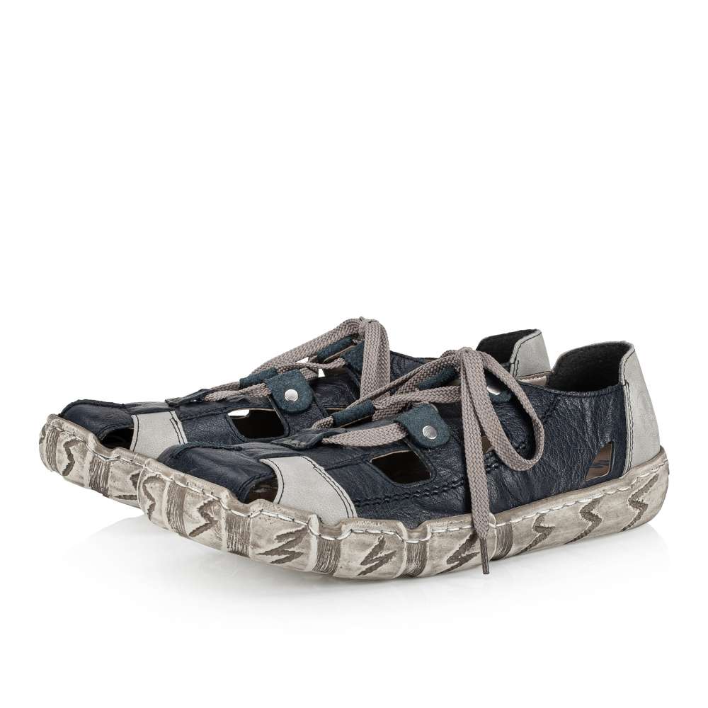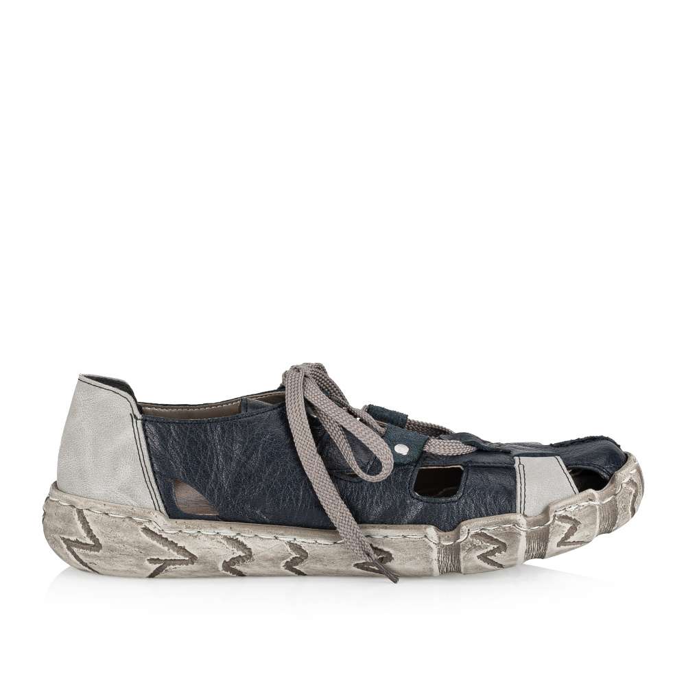 Tento velmi pohodlný model značky RIEKER oceníte na Vašich pochůzkách. Svršek z pravé kůže je zdobný šedými částmi, prošíváním a zajímavým šněrováním, kterým si obuv přizpůsobíte dle Vašich požadavků. Kožená stélka je pro Vaše pohodlí měkká a podešev svým provedením dolaďuje celkový vzhled obuvi k dokonalosti. Tyto polobotky budou skvěle vypadat s kalhotami a jarní bundičkou. Technologie: Antistress – podešev je díky této technologii lehká, flexibilní, absorbuje nárazy při došlapu a snadno se přizpůsobí každé noze.