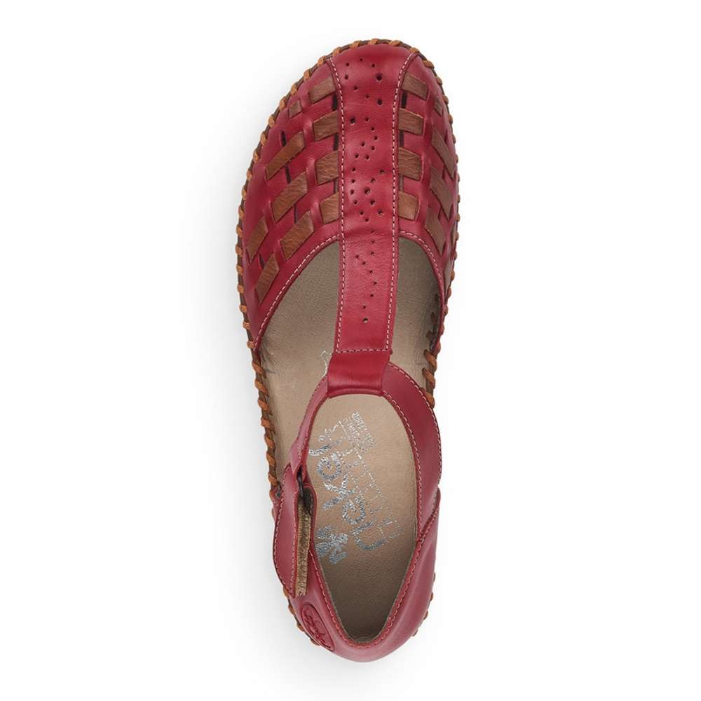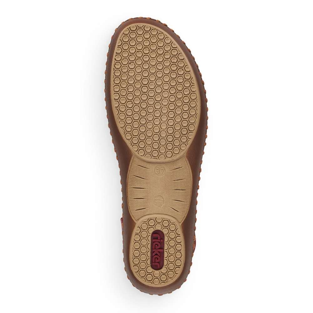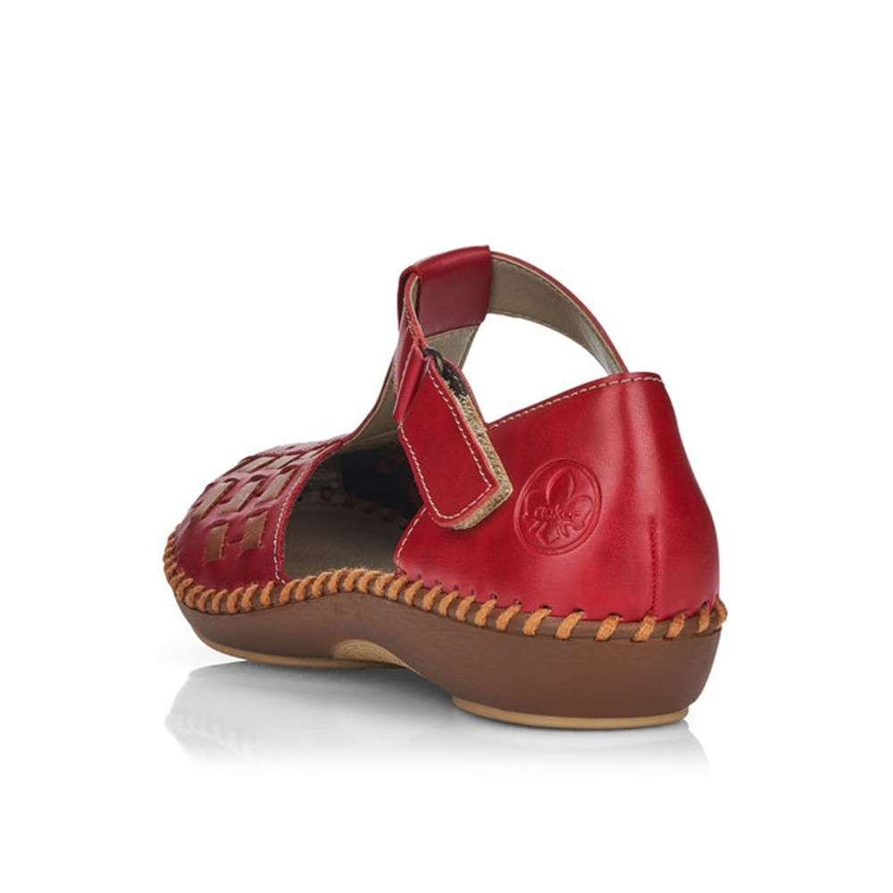 Svršek syté červené barvy je ozdoben na špičce proplétanými hnědými pásky, nártovým perforovaným páskem, kontrastním prošíváním a vytlačeným logem značky. Snadné nazouvání a přizpůsobení dle Vašich požadavků zajistí pásek přes nárt se zapínáním na suchý zip.