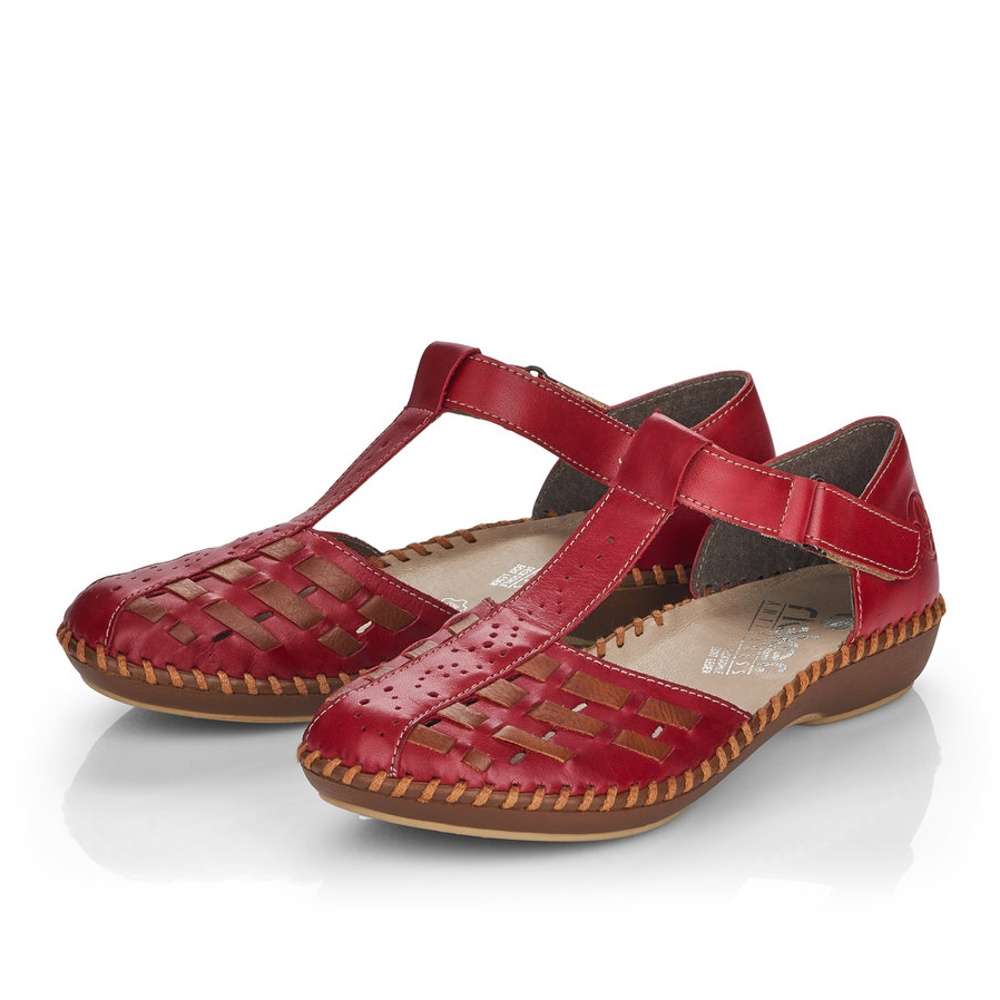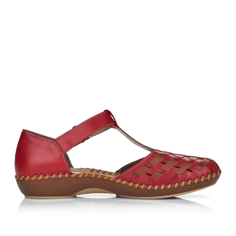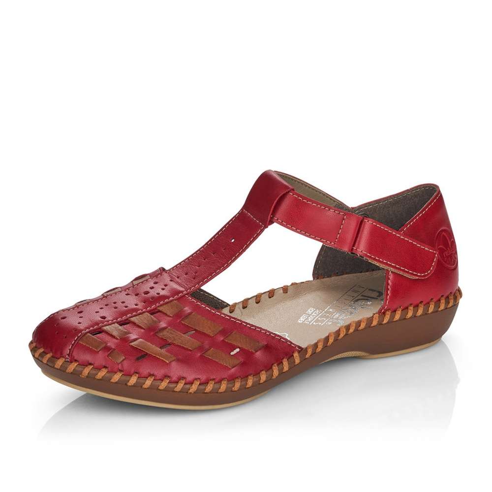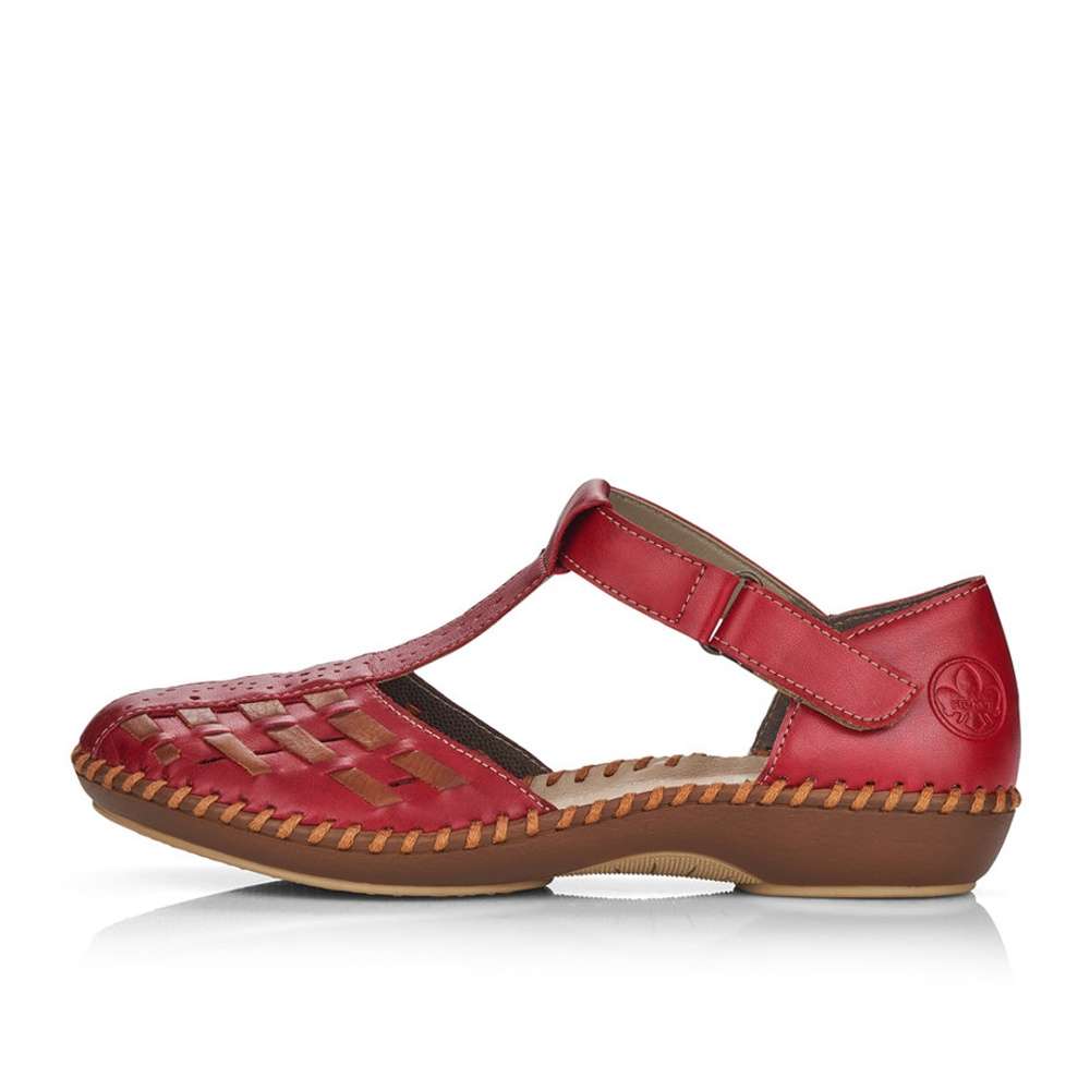 Svršek syté červené barvy je ozdoben na špičce proplétanými hnědými pásky, nártovým perforovaným páskem, kontrastním prošíváním a vytlačeným logem značky. Snadné nazouvání a přizpůsobení dle Vašich požadavků zajistí pásek přes nárt se zapínáním na suchý zip.