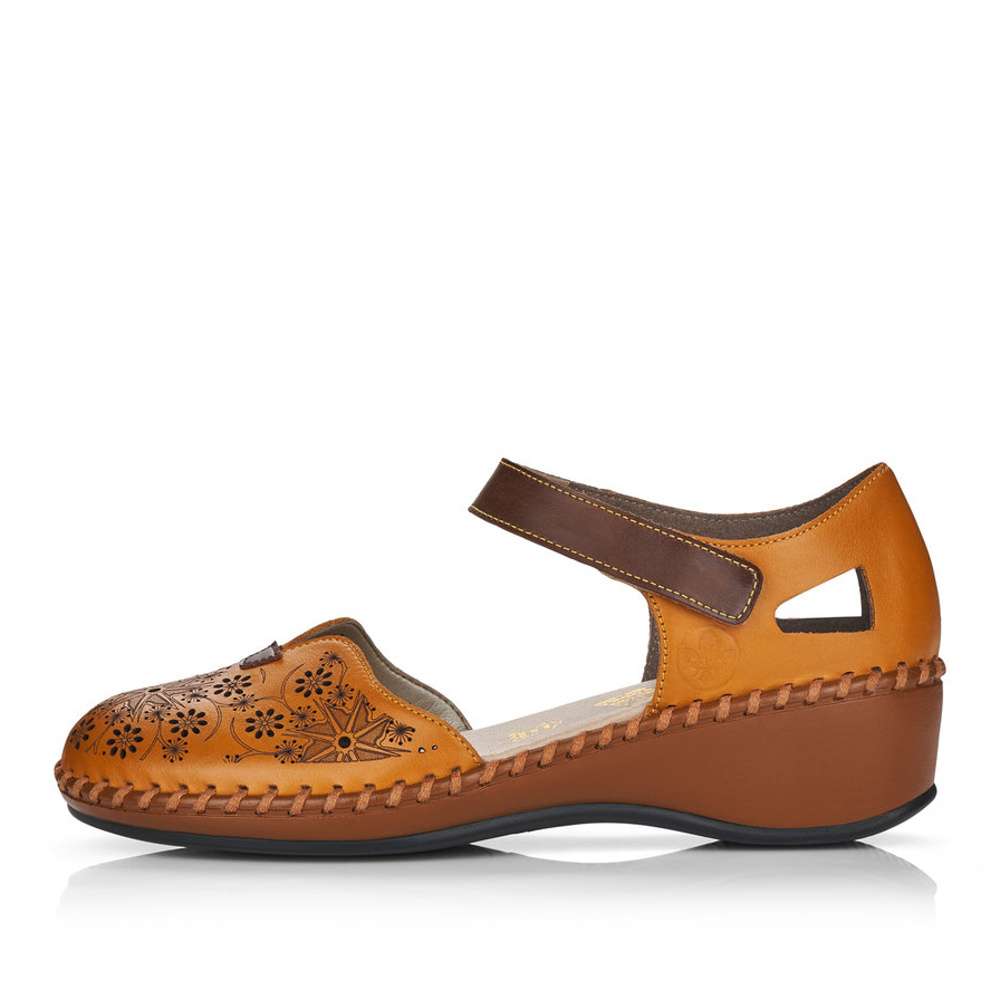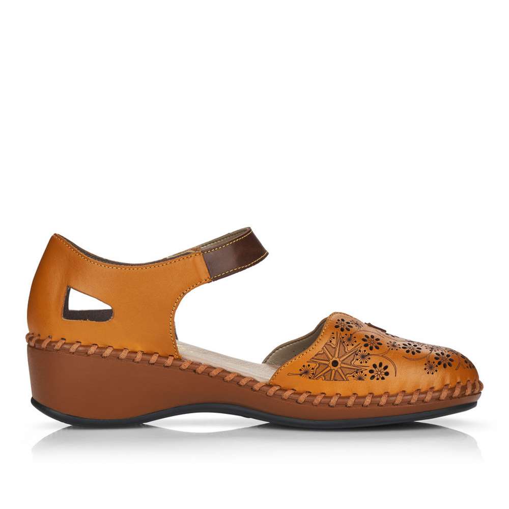 Dámské sandály se zdobnou povrchovou perforací, značky RIEKER. Svršek Tyto dámské sandálky mají svršek z přírodní usně ve žluté barvě a díky klínku a lemované podešvi vytváří dokonalou obuv. V části nártu jsou ozdobeny designovou perforací a zajímavým menším výkrojem. Pásek kolem kotníku je na suchý zip, který je velice praktický a usnadní Vám obouvání. Stélka v Stélka je vyrobena z unikátní paměťové pěny, která se maximálně přizpůsobí tvaru Vašeho chodidla. Podešev Podešev je vysoká cca 4,6 cm a díky technologii Antistress je lehká, flexibilní a absorbuje nárazy při došlapu. Záleží už jen na Vás, zda se v nich vydáte do práce nebo na procházku městem. Technologie: Antistress Paměťová stélka: ANO