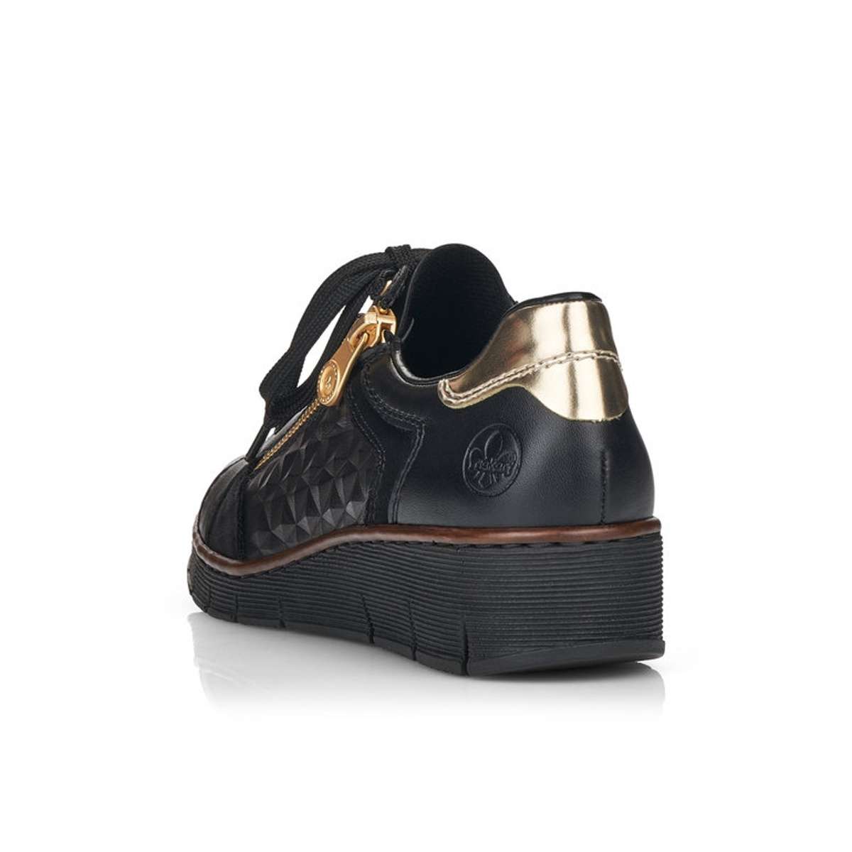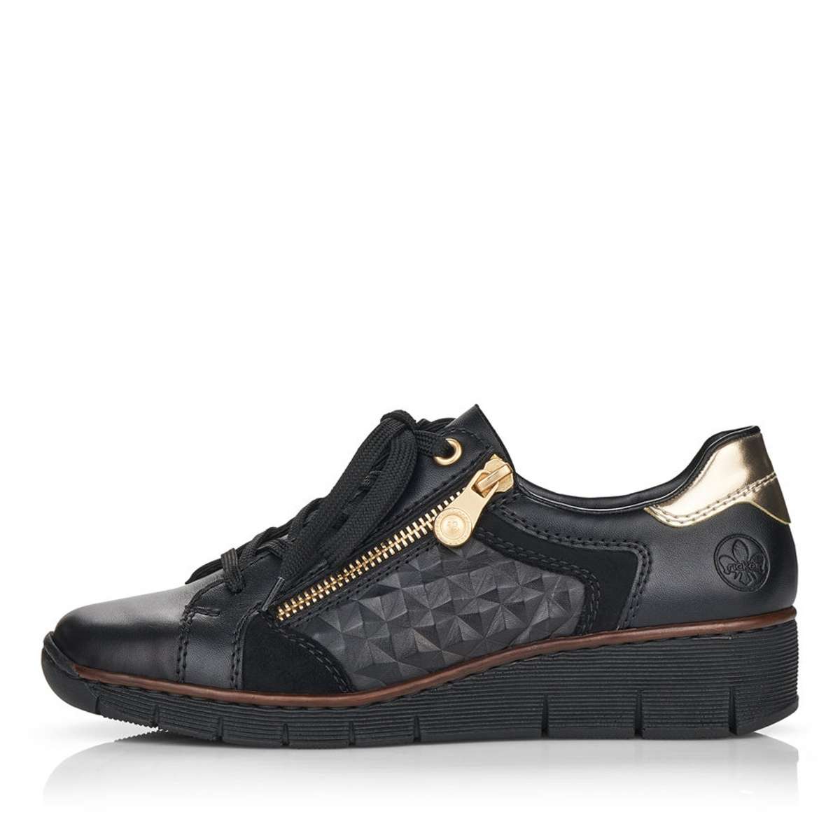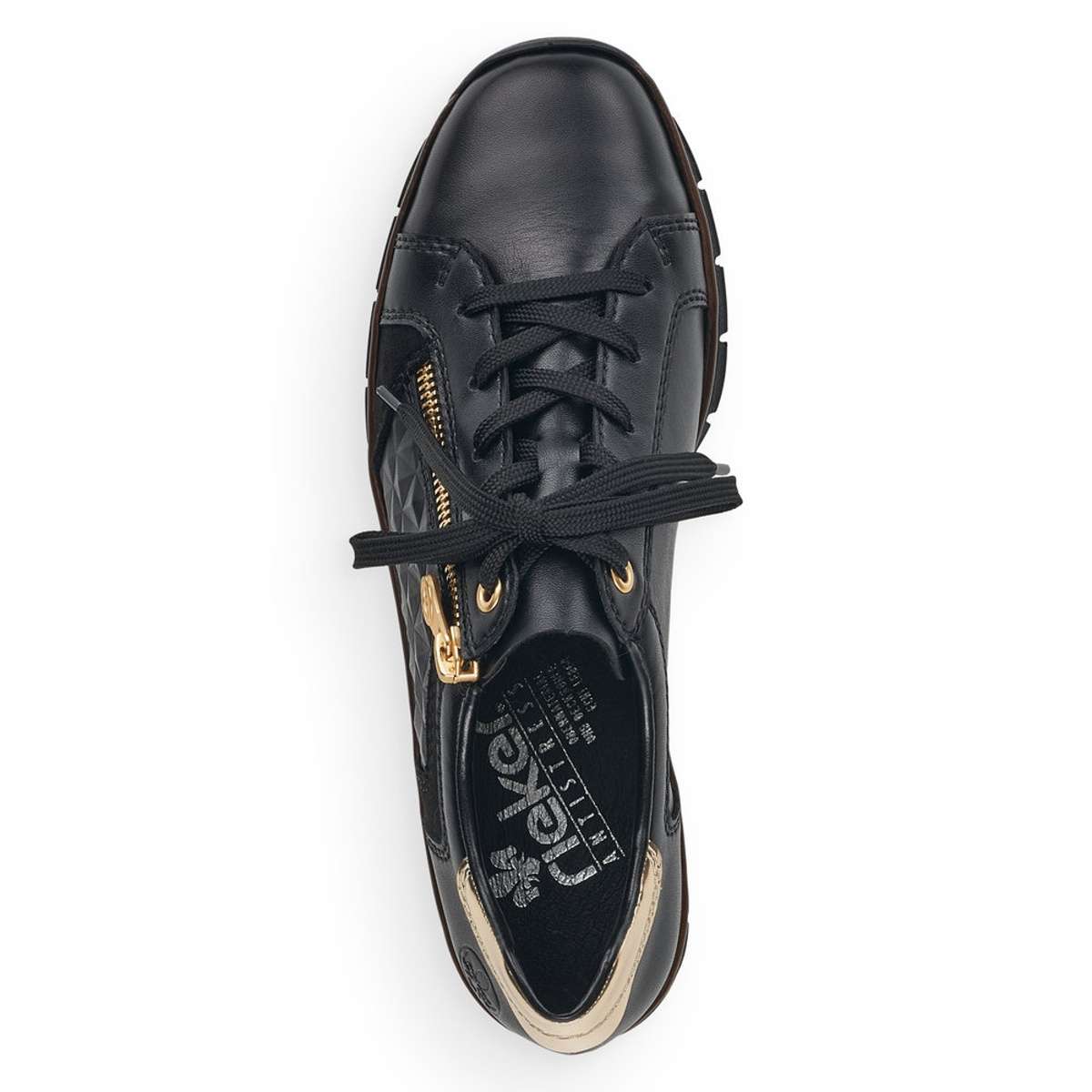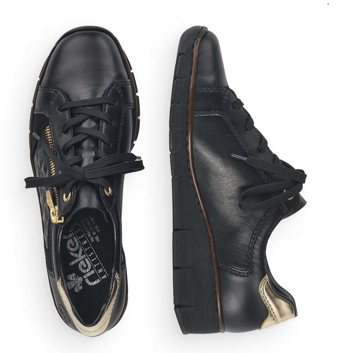 Tyto dámské kožené boty značky Rieker, zapadnou do Vašeho šatníku jak ulité. Svršek je tmavé barvy, zdoben zlatým zipem a jemným prošíváním. Zadní strana boty je oživena zlatým vzorem, pod nímž se vyjímá logo značky Rieker. Šněrování zajišťuje lepší manipulaci a vy si můžete botu upravit tak, aby to Vaší noze bylo co nejpohodlnější. Šmrnc dodává atypický vzor na vnější straně boty. Měkká stélka Vám přináší pohodlné chození. Boty můžete klidně zkombinovat s kalhoty či sukní a budete zářit na každém kroku. Technologie: Antistress – podešev je díky této technologii lehká, flexibilní, absorbuje nárazy při došlapu a snadno se přizpůsobí každé noze.
