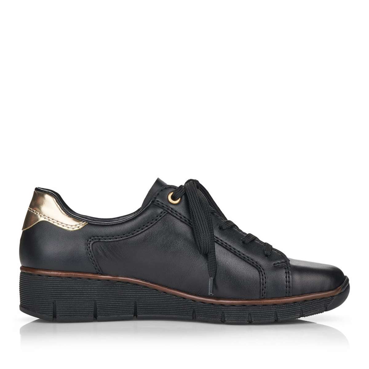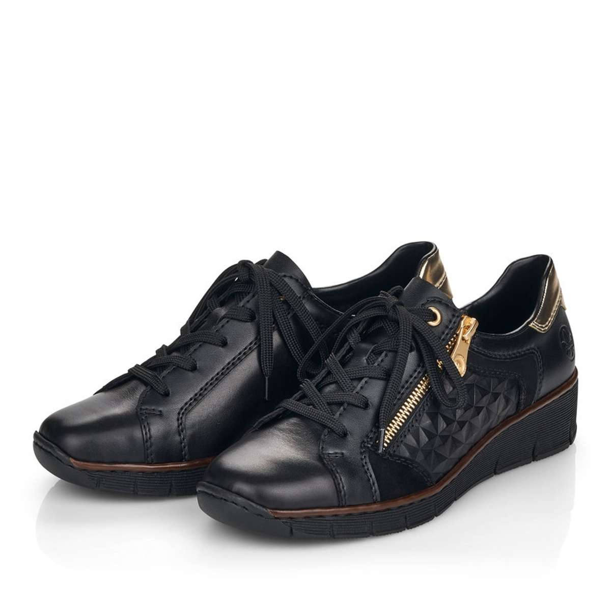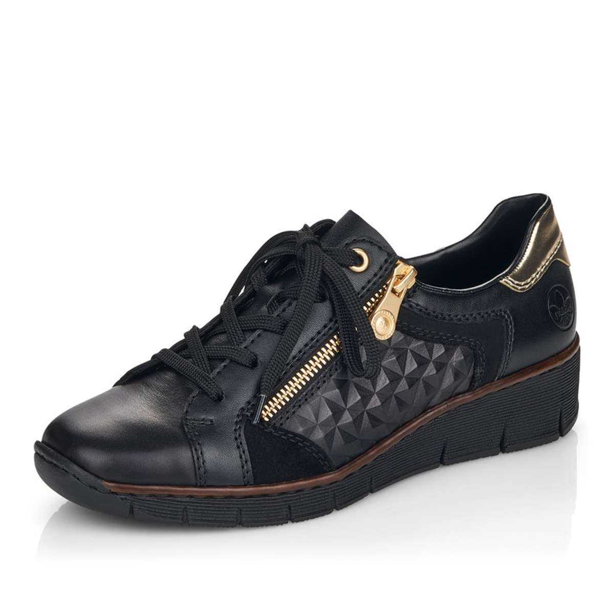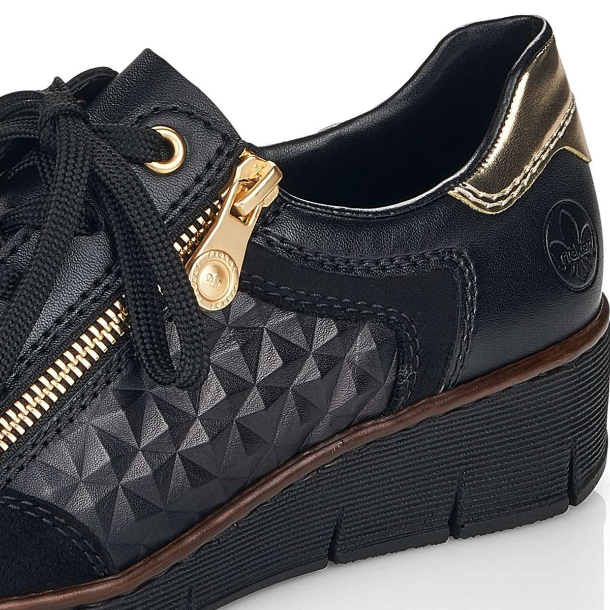 Tyto dámské kožené boty značky Rieker, zapadnou do Vašeho šatníku jak ulité. Svršek je tmavé barvy, zdoben zlatým zipem a jemným prošíváním. Zadní strana boty je oživena zlatým vzorem, pod nímž se vyjímá logo značky Rieker. Šněrování zajišťuje lepší manipulaci a vy si můžete botu upravit tak, aby to Vaší noze bylo co nejpohodlnější. Šmrnc dodává atypický vzor na vnější straně boty. Měkká stélka Vám přináší pohodlné chození. Boty můžete klidně zkombinovat s kalhoty či sukní a budete zářit na každém kroku. Technologie: Antistress – podešev je díky této technologii lehká, flexibilní, absorbuje nárazy při došlapu a snadno se přizpůsobí každé noze.