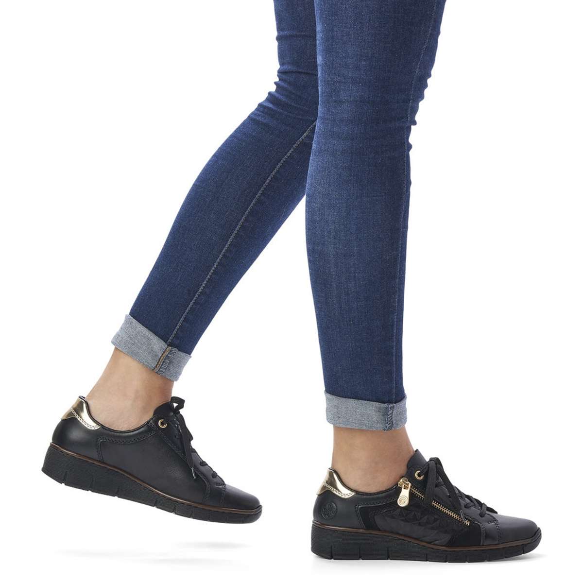 Detailní informace Tyto dámské kožené boty značky Rieker, zapadnou do Vašeho šatníku jak ulité. Svršek je tmavé barvy, zdoben zlatým zipem a jemným prošíváním. Zadní strana boty je oživena zlatým vzorem, pod nímž se vyjímá logo značky Rieker. Šněrování zajišťuje lepší manipulaci a vy si můžete botu upravit tak, aby to Vaší noze bylo co nejpohodlnější. Šmrnc dodává atypický vzor na vnější straně boty. Měkká stélka Vám přináší pohodlné chození. Boty můžete klidně zkombinovat s kalhoty či sukní a budete zářit na každém kroku.