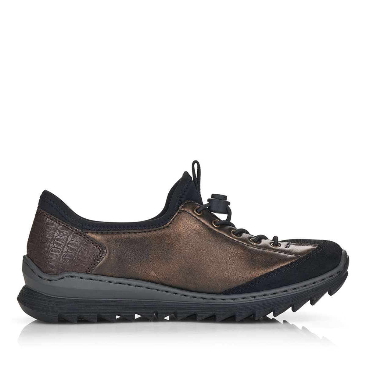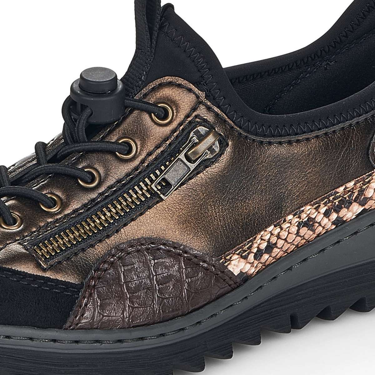Svršek této boty je v kombinaci materiálů bronzové, hnědé a černé. Jako další doplňkem je zde zip a pružné šněrování pro přizpůsobení se Vaší noze.