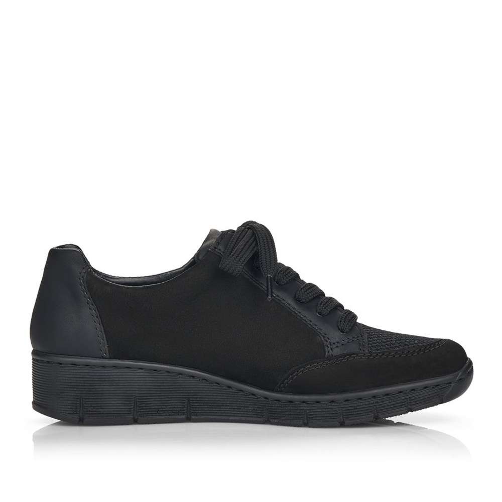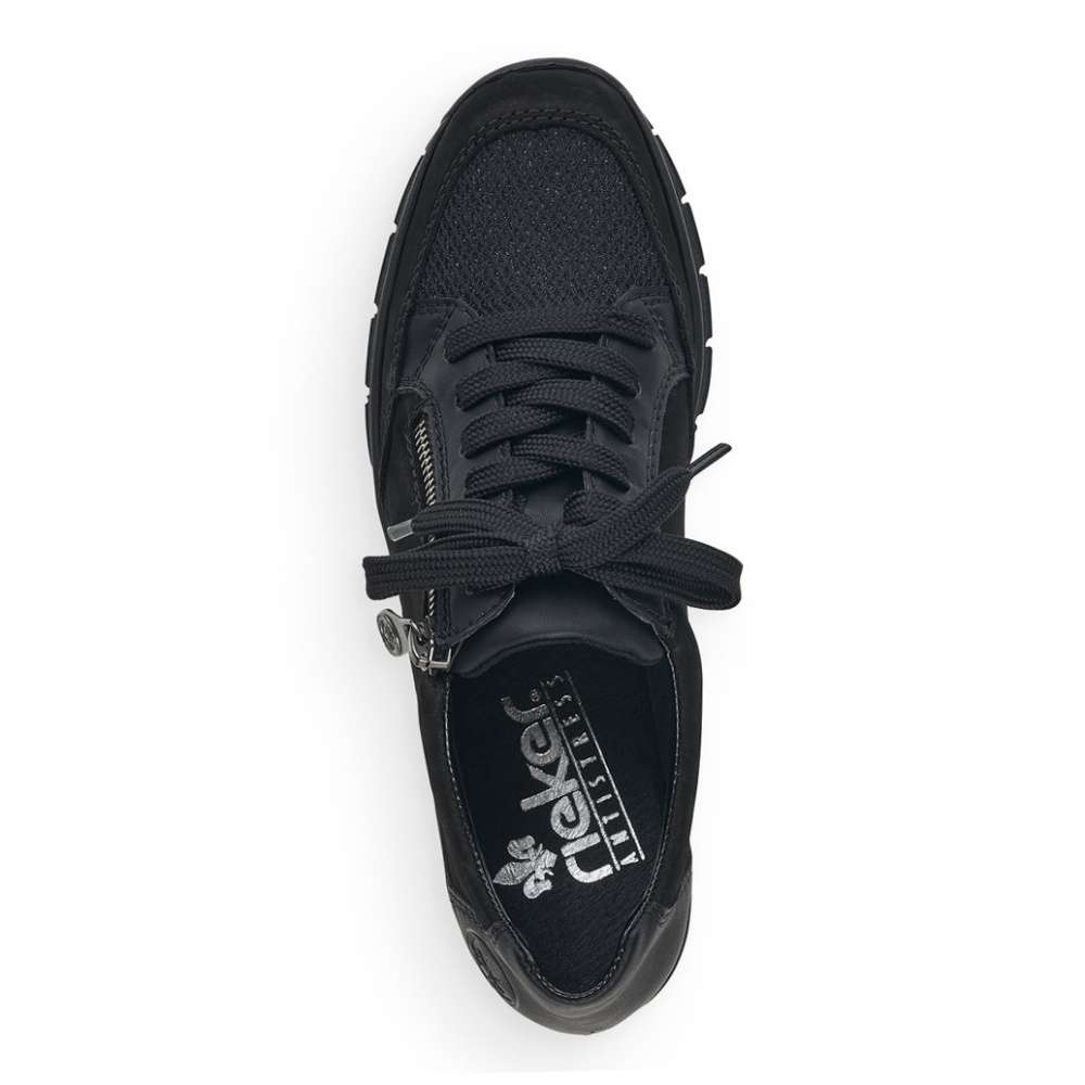 Těmto trendy teniskám od značky Rieker zkrátka nejde odolat. Kožený svršek v černé barvě je zdoben logem značky v oblasti paty. Šněrování na tkaničky je obohaceno i o zip, takže obavy že Vám botka nepadne nejsou na místě. Lehce vyvýšená podešev v oblasti paty dodává tenisce na eleganci. Měkká stélka slibuje pohodlí na každém kroku. Ať už vyrazíte za prací či zábavou, budete vypadat famózně. Technologie: Antistress – podešev je díky této technologii lehká, flexibilní, absorbuje nárazy při došlapu a snadno se přizpůsobí každé noze.