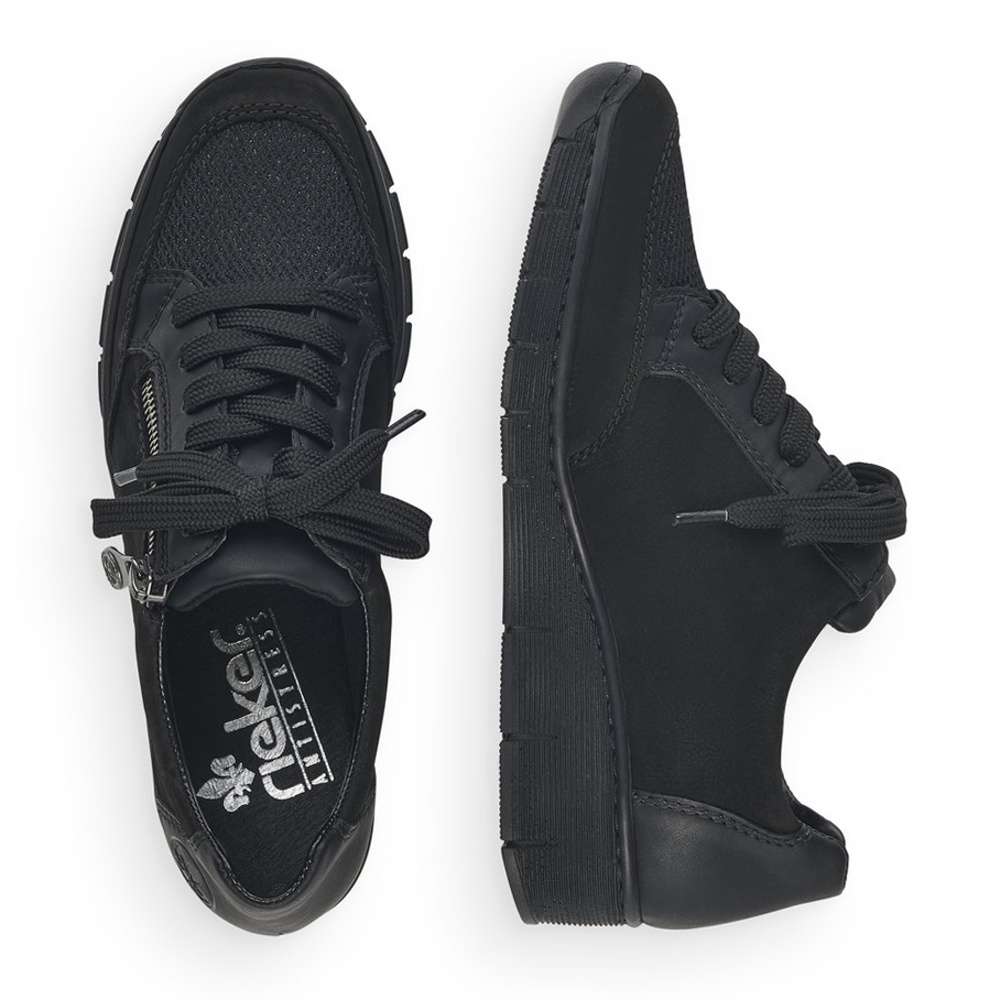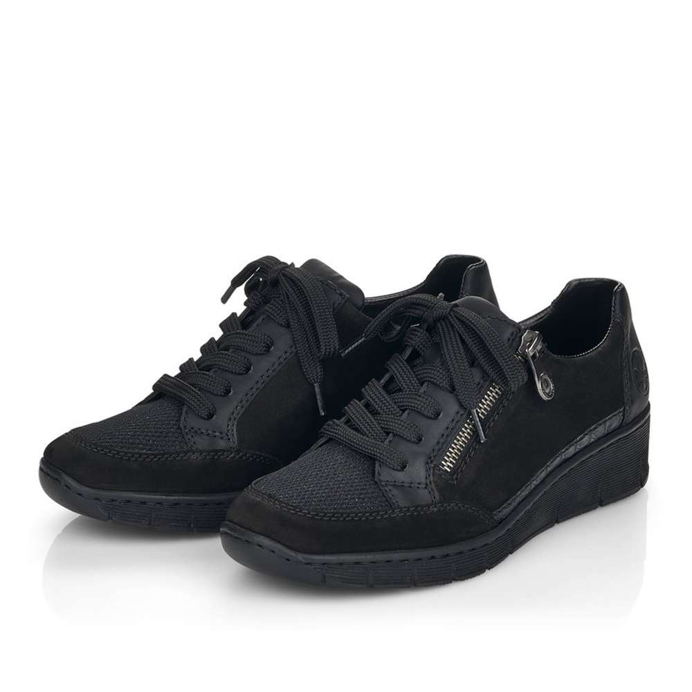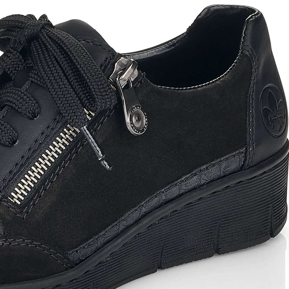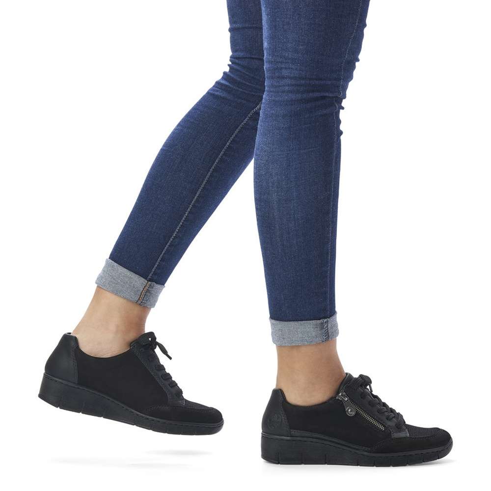 Detailní informace Těmto trendy teniskám od značky Rieker zkrátka nejde odolat. Kožený svršek v černé barvě je zdoben logem značky v oblasti paty. Šněrování na tkaničky je obohaceno i o zip, takže obavy že Vám botka nepadne nejsou na místě. Lehce vyvýšená podešev v oblasti paty dodává tenisce na eleganci. Měkká stélka slibuje pohodlí na každém kroku. Ať už vyrazíte za prací či zábavou, budete vypadat famózně.