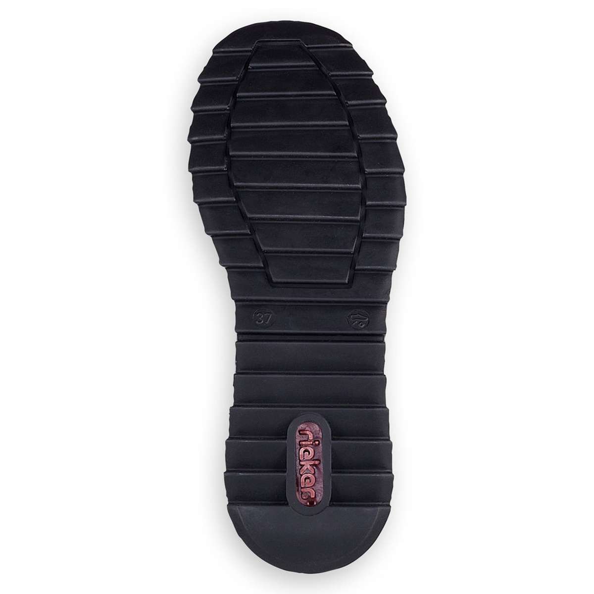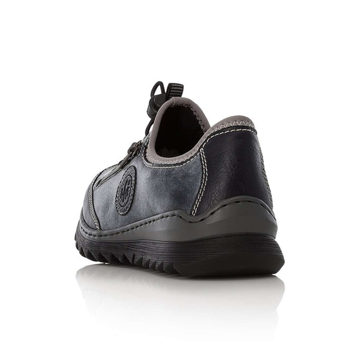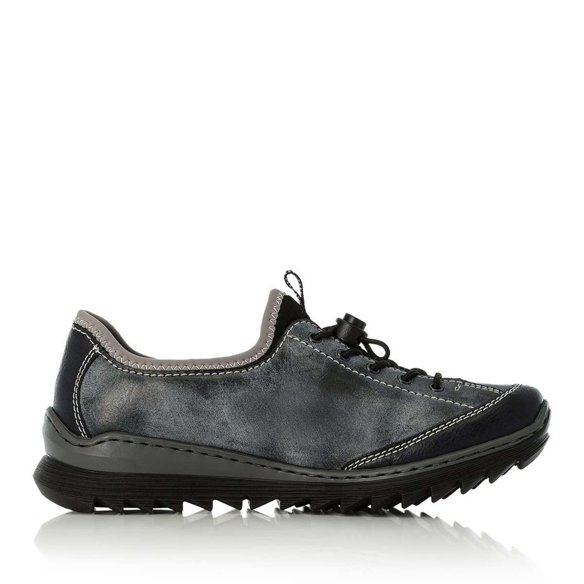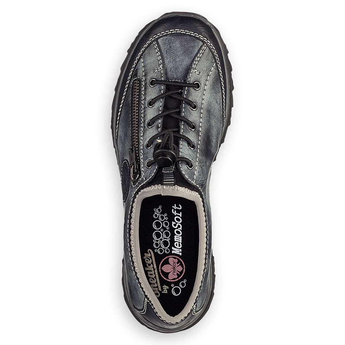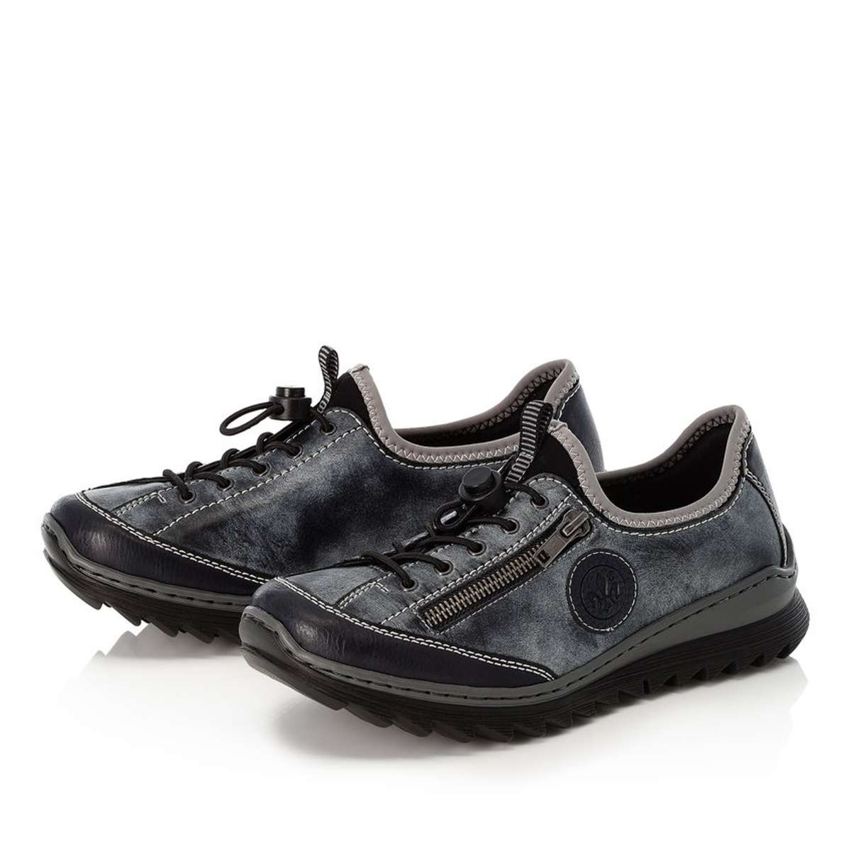 Ozdobena je dekorativním zipem, logem značky RIEKER a prošitým lemováním u horního okraje. Pro snadné obutí slouží šněrování pomocí pružných gumiček, které lze decentně utáhnout.