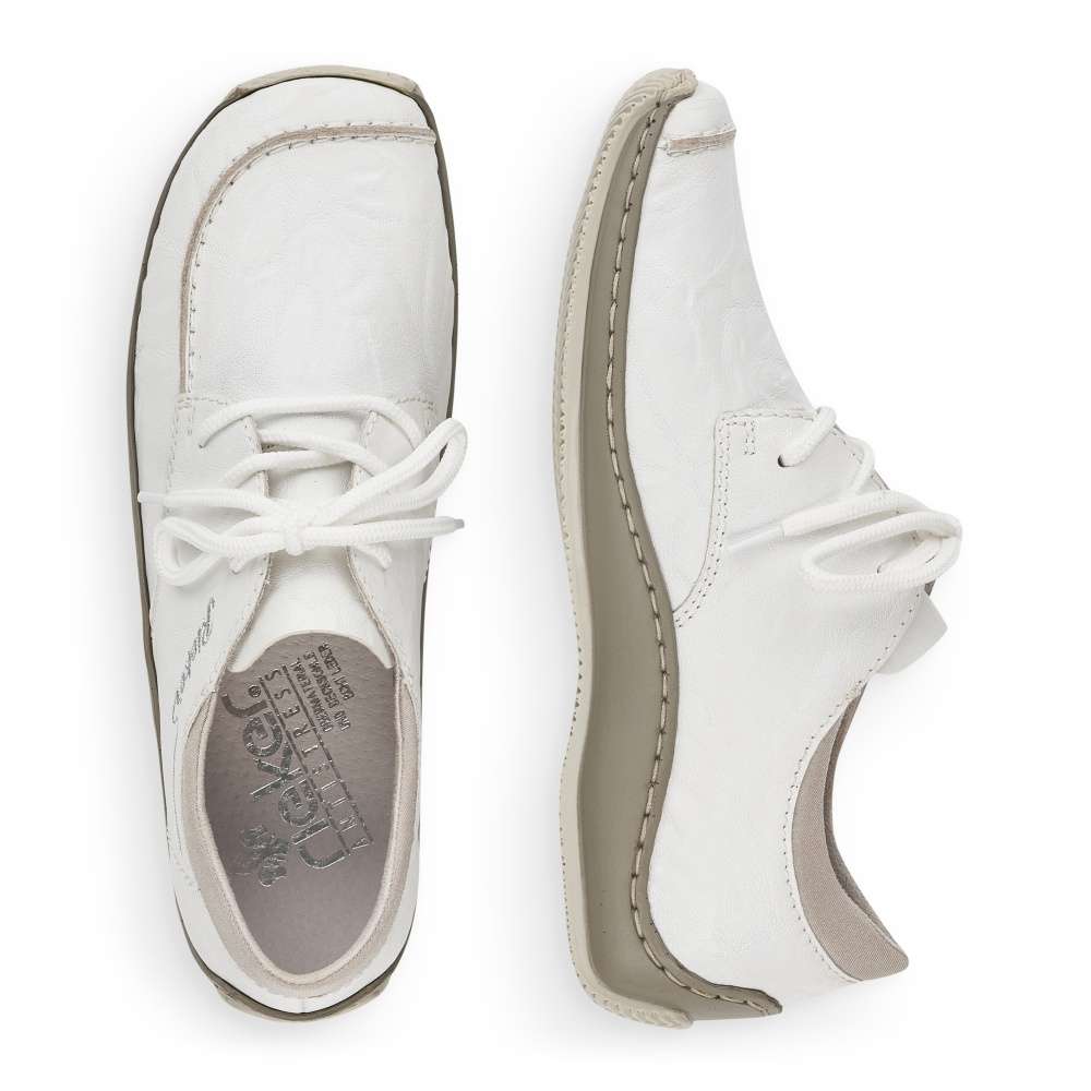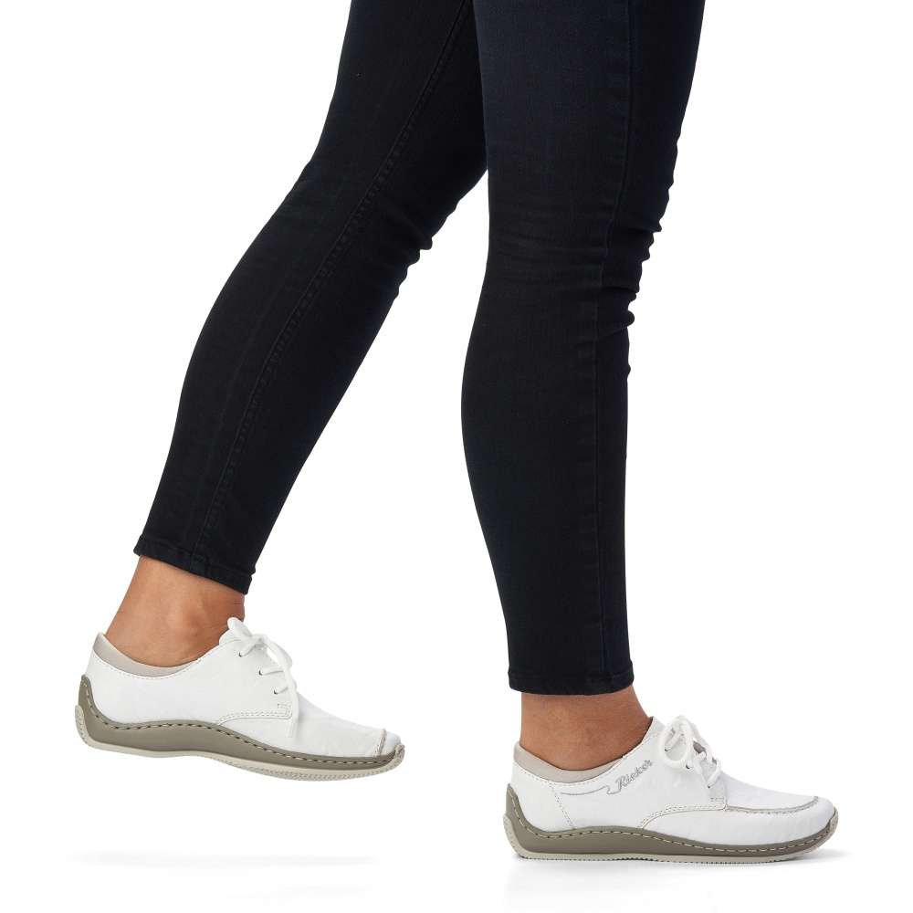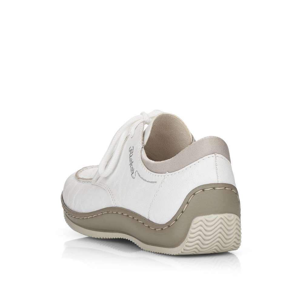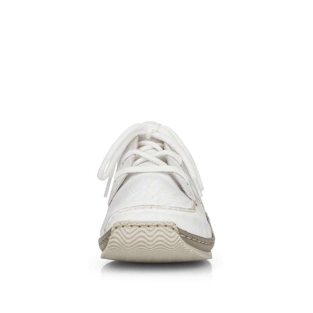 Touto koženou teniskou od značky Rieker jednoduše nemůžete udělat krok vedle. Zdánlivě jednoduchý svršek této bílé boty je obohacený o jemné prošívání stejné barvy a stříbrně vyšité logo značky na vnější straně. Bota nabízí uzavírání na tkaničky pro dokonalé přizpůsobení Vaší noze. Botu můžete kombinovat skoro s každým outfitem a vyrazit třeba do města.