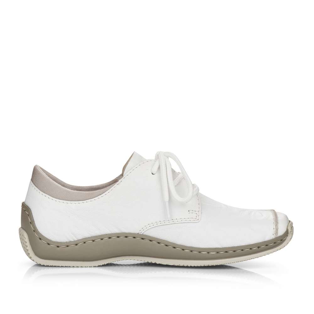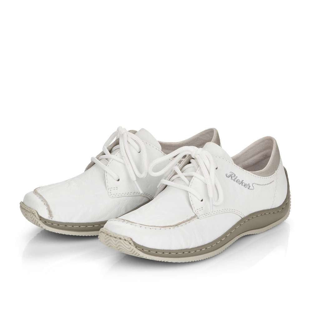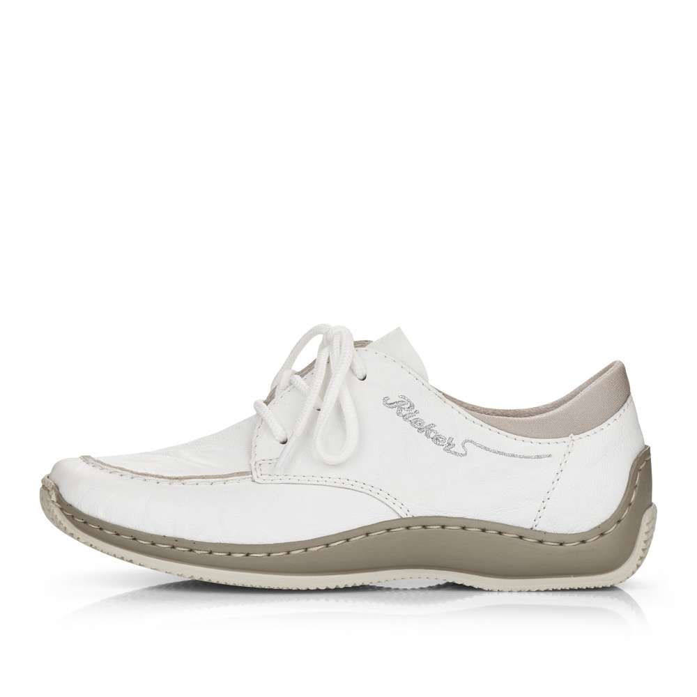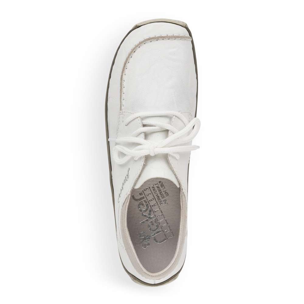 Touto koženou teniskou od značky Rieker jednoduše nemůžete udělat krok vedle. Zdánlivě jednoduchý svršek této bílé boty je obohacený o jemné prošívání stejné barvy a stříbrně vyšité logo značky na vnější straně. Bota nabízí uzavírání na tkaničky pro dokonalé přizpůsobení Vaší noze. Botu můžete kombinovat skoro s každým outfitem a vyrazit třeba do města.