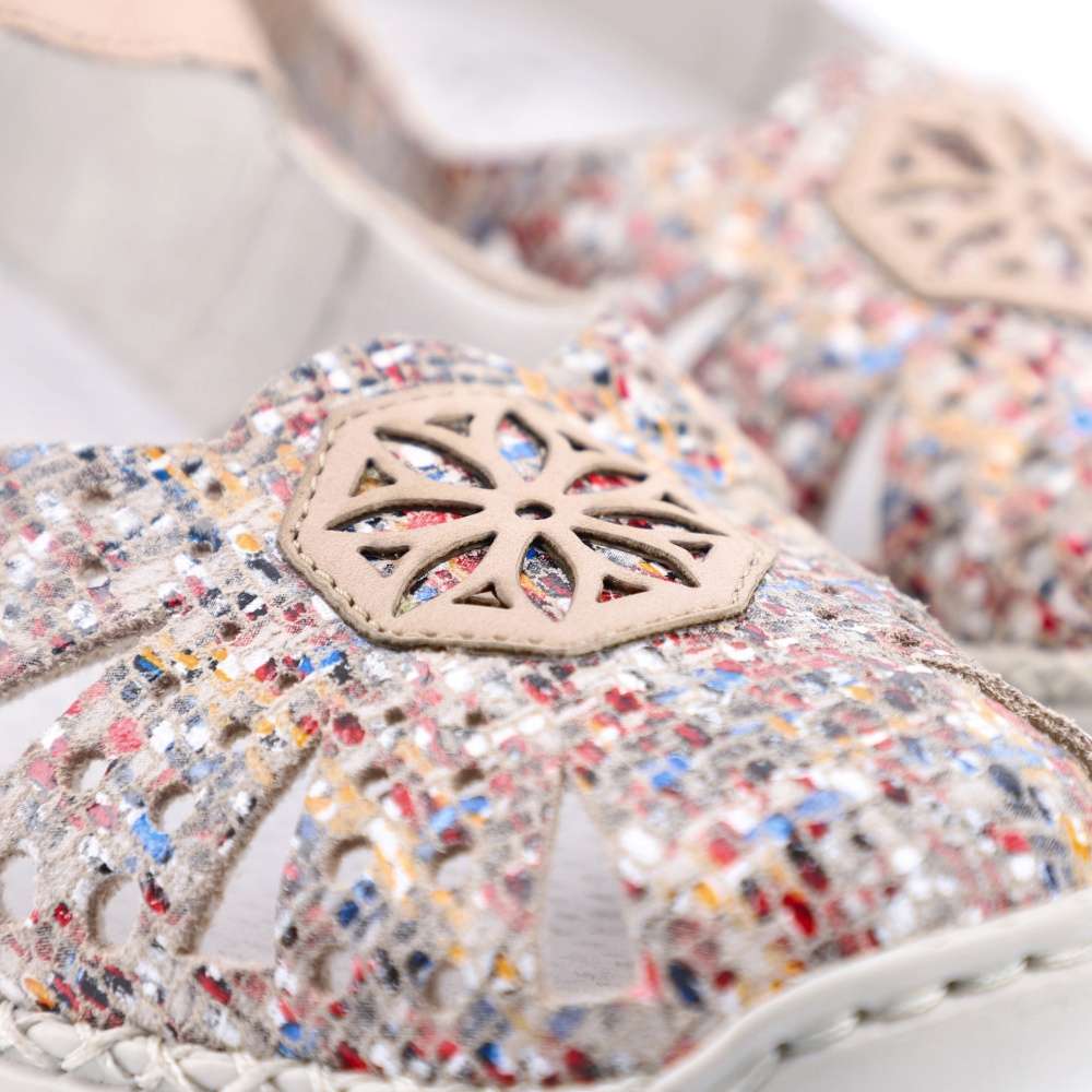 Dámský sandál značky RIEKER Vás zaujme svým originálním vzhledem. Svršek zdobený designovou perforací v přední části zajistí prodyšnost obuvi. Pomocí pásku na suchý zip v oblasti nártu si obuv přizpůsobíte na míru Vaší noze. Měkká stélka a podešev vybavená technologií Antistress na nízkém podpatku zajistí pohodlí při chůzi. Tento model unosíte během letních dnů na procházky po městě i do kina či práce. Technologie: Antistress – podešev je díky této technologii lehká, flexibilní, absorbuje nárazy při došlapu asnadno se přizpůsobí každé noze.