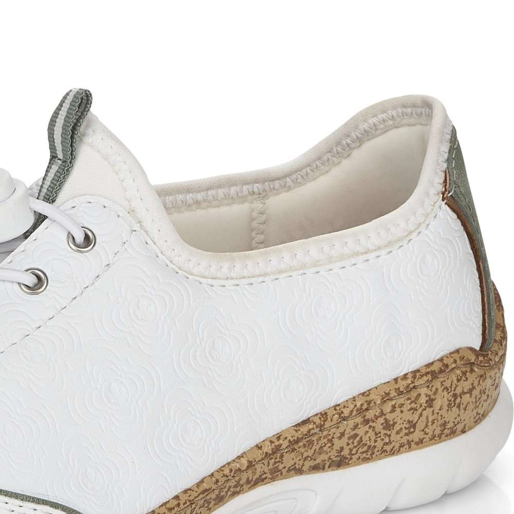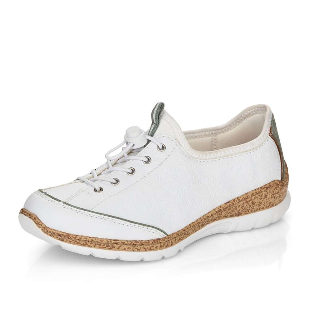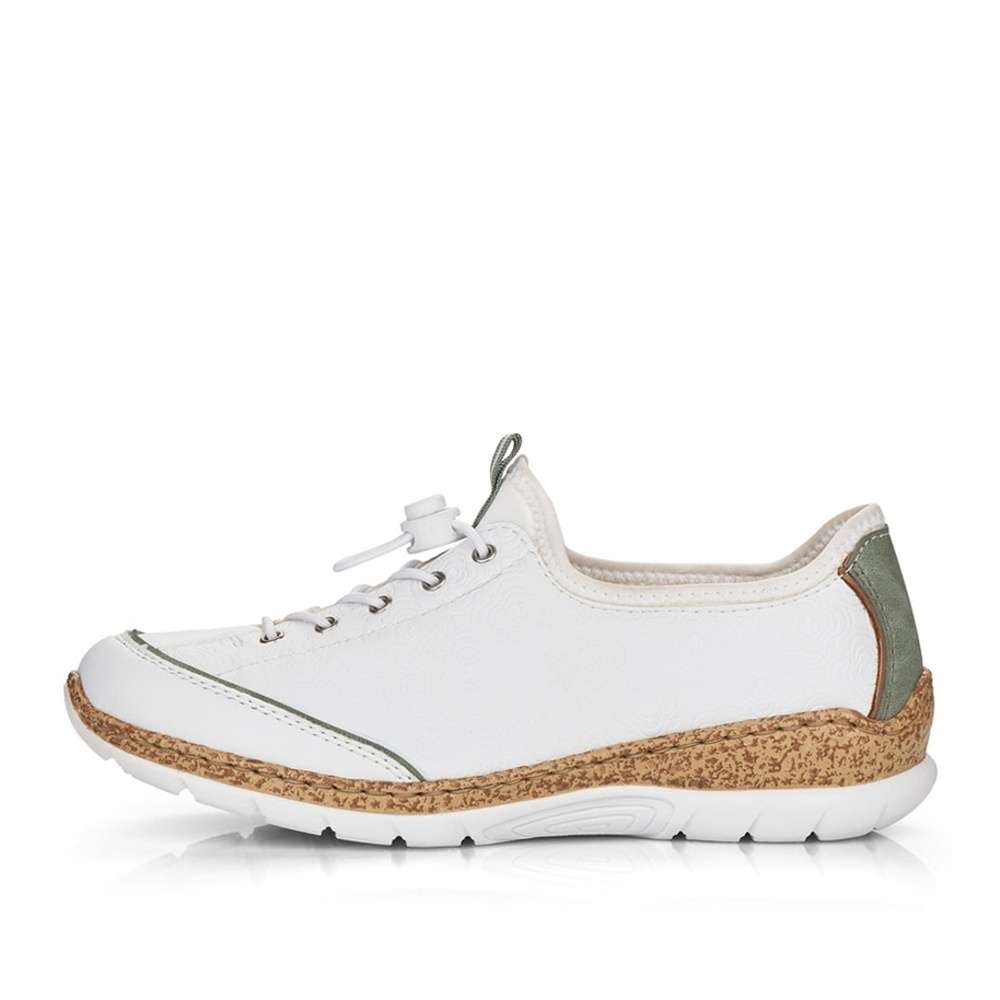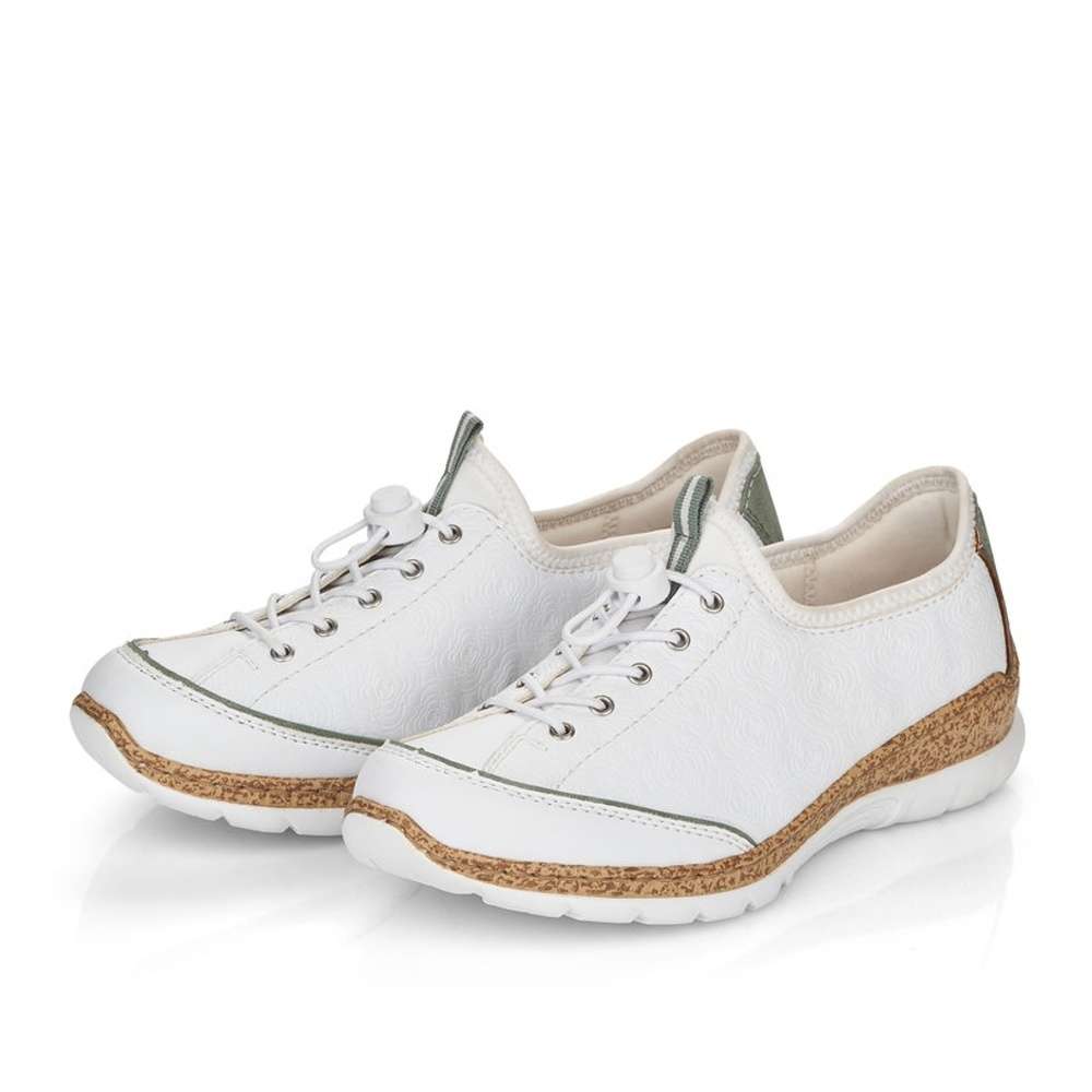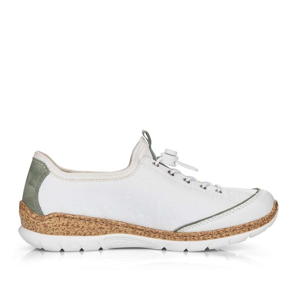 Detailní informace Jednoduchý vzhled těchto bílých polobotek značky RIEKER z nich dělá obuv hodící se snad ke všem outfitům. Jemně vzorovaný svršek je doplněn zelenými prvky na špičce a patě obuvi. Snadné nazouvání zajistí pružné lemování horního okraje, poutko a šněrování pružnou gumičkou, které lze snadno utáhnout či povolit. Unikátní textilní stélka z paměťové pěny změkčí došlap a přizpůsobí se tvaru Vašeho chodidla. Podešev v horní části s imitací korku je vyrobená s technologií Antistress díky níž je lehká a flexibilní. Tento model bude skvělým parťákem jak na cestě do práce, tak na pochůzkách městem.