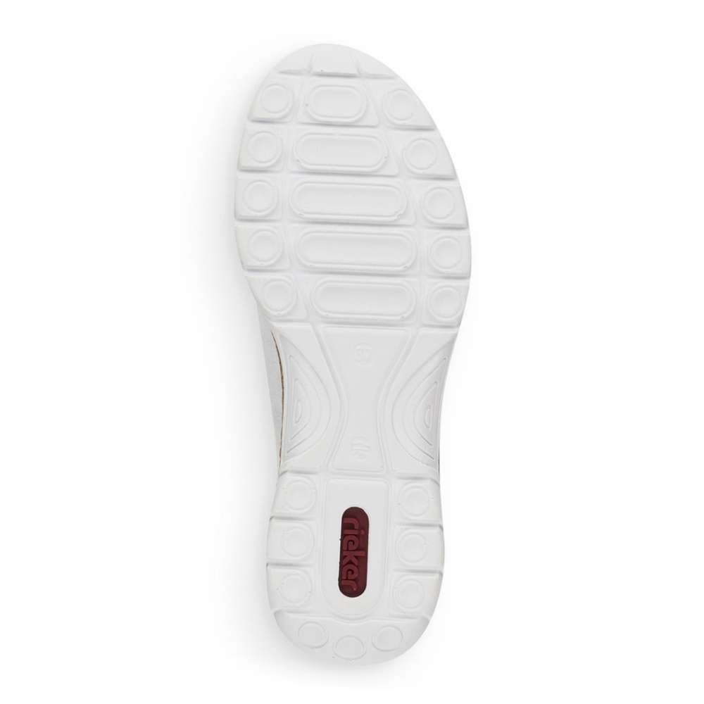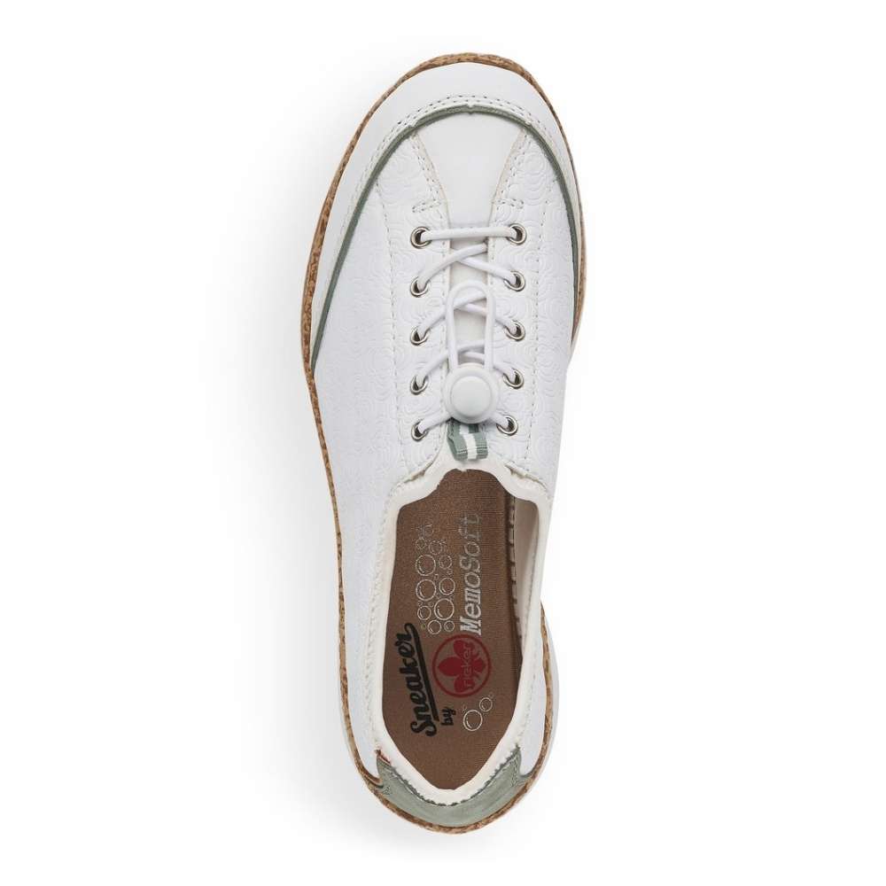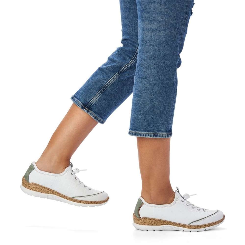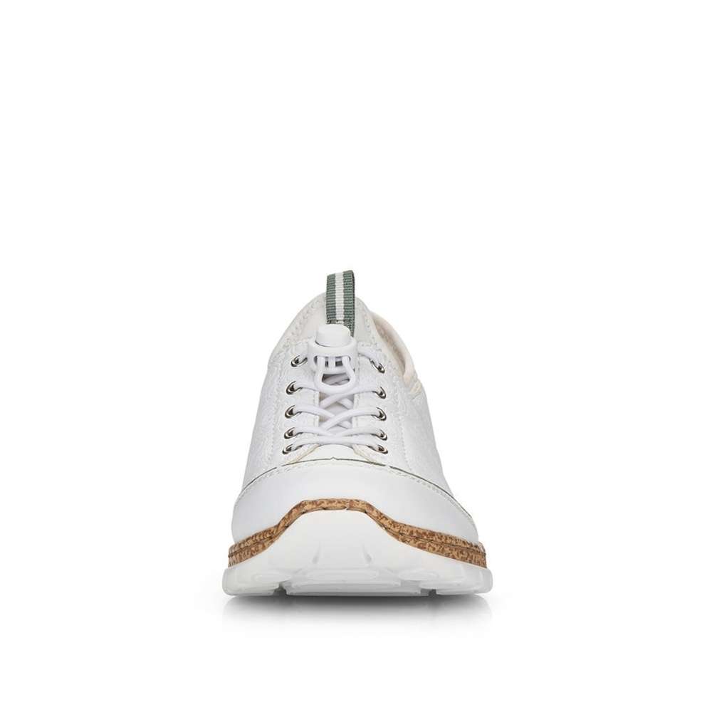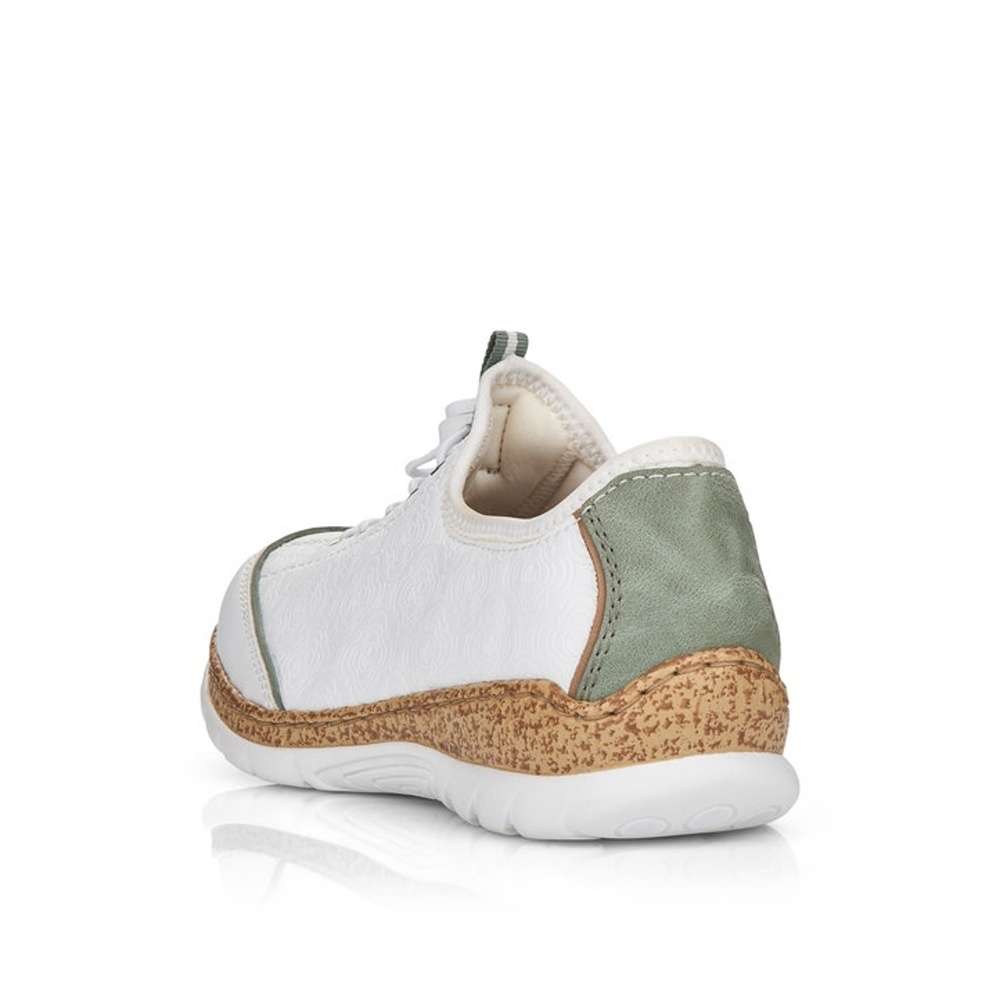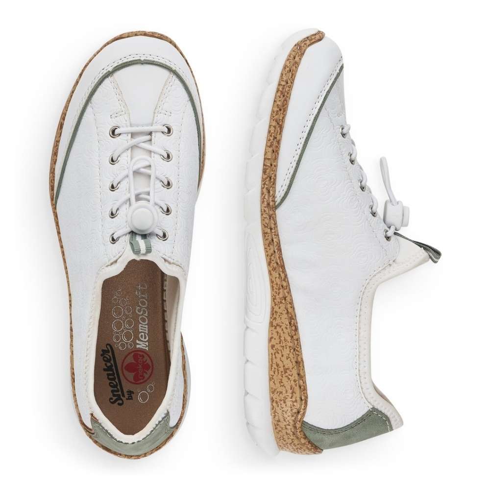 Detailní informace Jednoduchý vzhled těchto bílých polobotek značky RIEKER z nich dělá obuv hodící se snad ke všem outfitům. Jemně vzorovaný svršek je doplněn zelenými prvky na špičce a patě obuvi. Snadné nazouvání zajistí pružné lemování horního okraje, poutko a šněrování pružnou gumičkou, které lze snadno utáhnout či povolit. Unikátní textilní stélka z paměťové pěny změkčí došlap a přizpůsobí se tvaru Vašeho chodidla. Podešev v horní části s imitací korku je vyrobená s technologií Antistress díky níž je lehká a flexibilní. Tento model bude skvělým parťákem jak na cestě do práce, tak na pochůzkách městem.