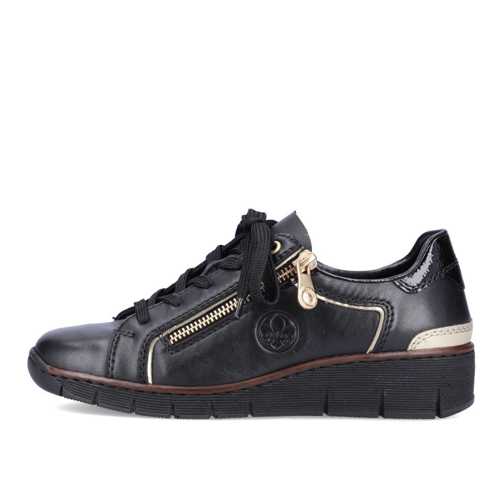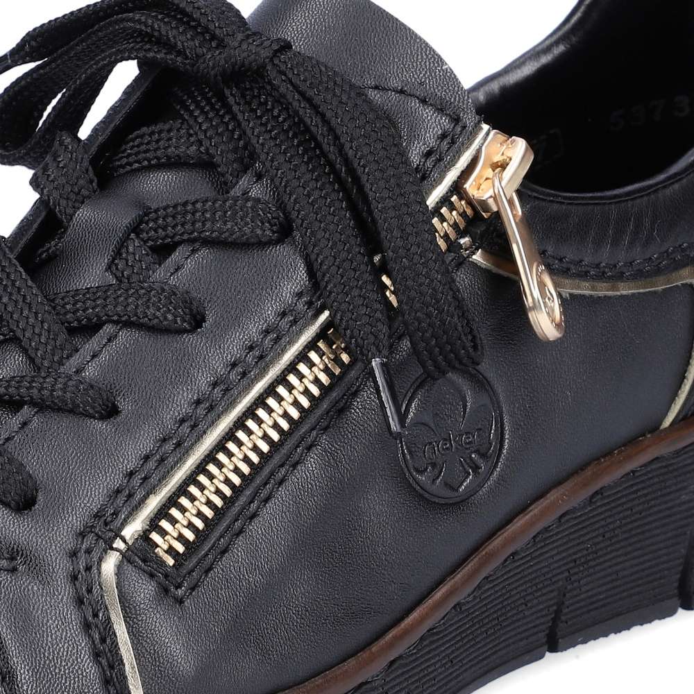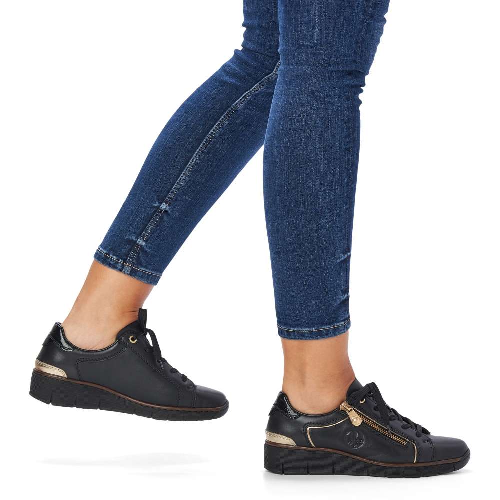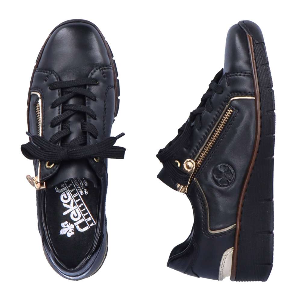Detailní informace Těmto trendy teniskám od značky Rieker zkrátka nejde odolat. Kožený svršek v černé barvě je zdoben logem značky na vnější straně. Šněrování na tkaničky je obohaceno i o zip, který krásně koresponduje se zlatými prvky. Lehce vyvýšená podešev v oblasti paty dodává tenisce na eleganci. Měkká stélka slibuje pohodlí na každém kroku. Ať už vyrazíte za prací či zábavou, budete vypadat famózně.