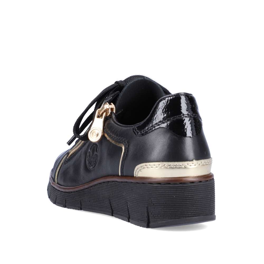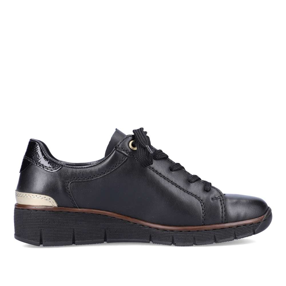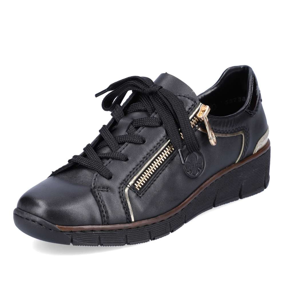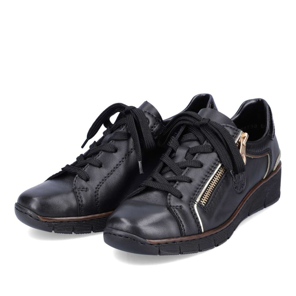 Detailní informace Těmto trendy teniskám od značky Rieker zkrátka nejde odolat. Kožený svršek v černé barvě je zdoben logem značky na vnější straně. Šněrování na tkaničky je obohaceno i o zip, který krásně koresponduje se zlatými prvky. Lehce vyvýšená podešev v oblasti paty dodává tenisce na eleganci. Měkká stélka slibuje pohodlí na každém kroku. Ať už vyrazíte za prací či zábavou, budete vypadat famózně.