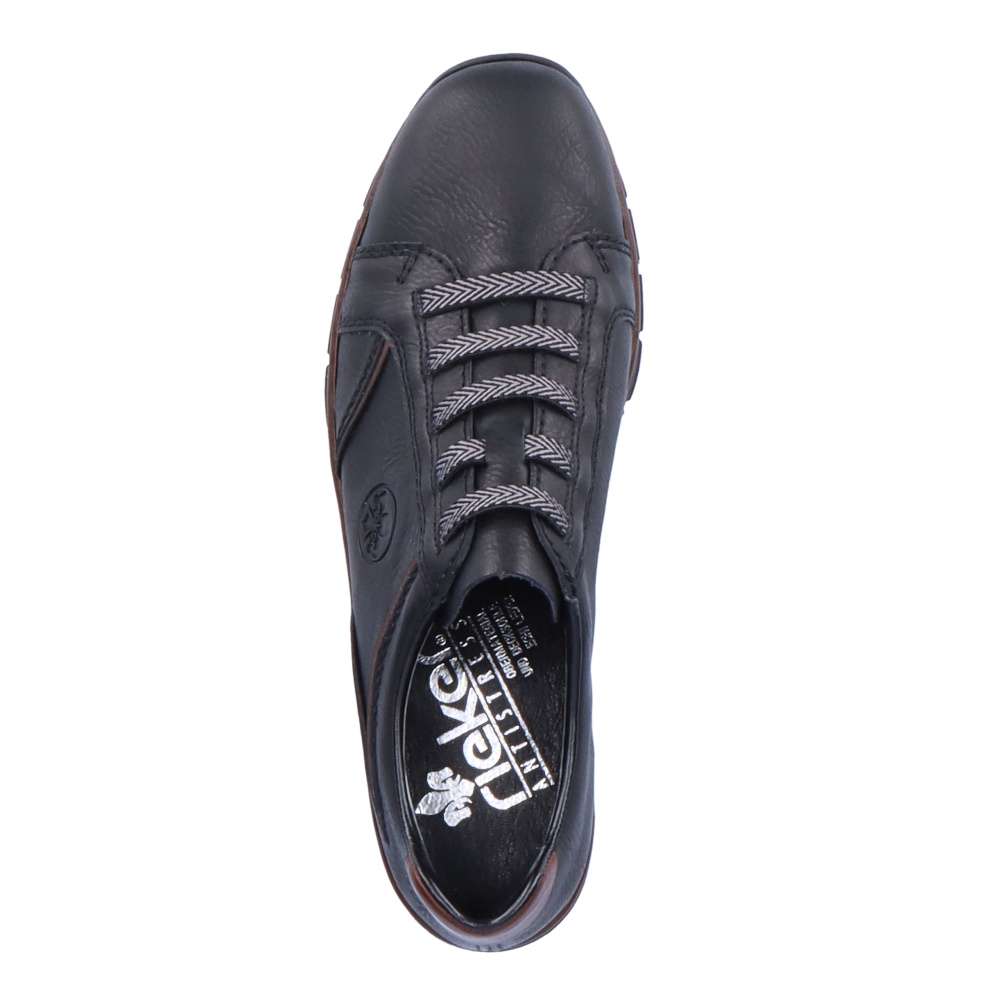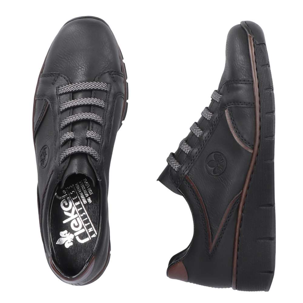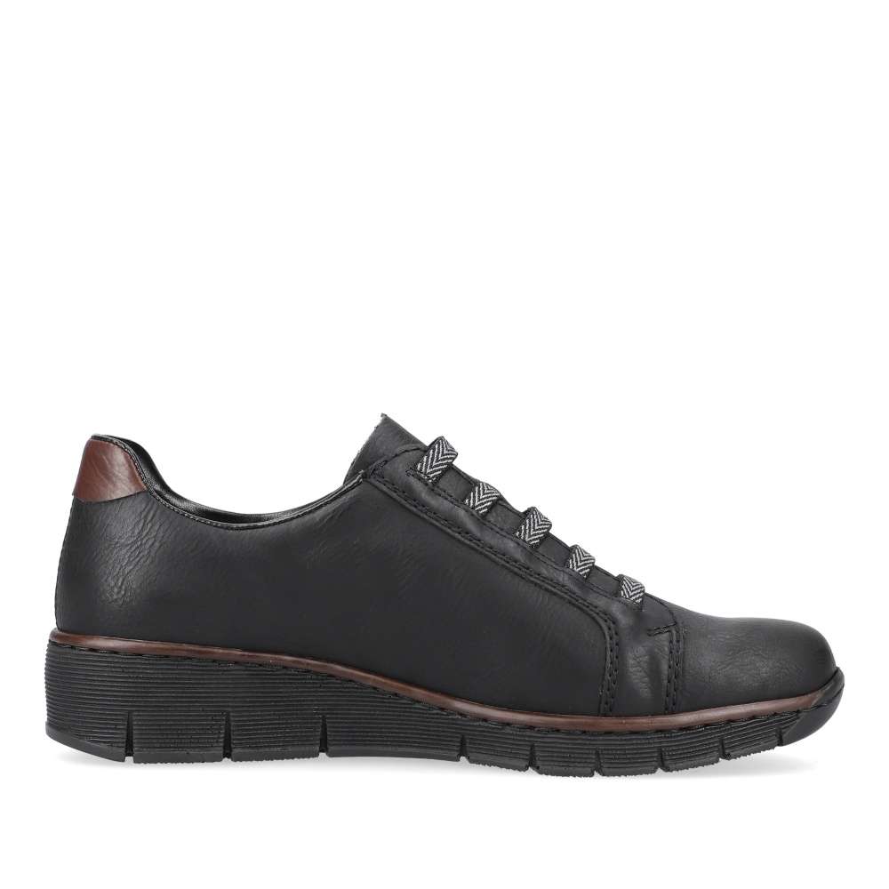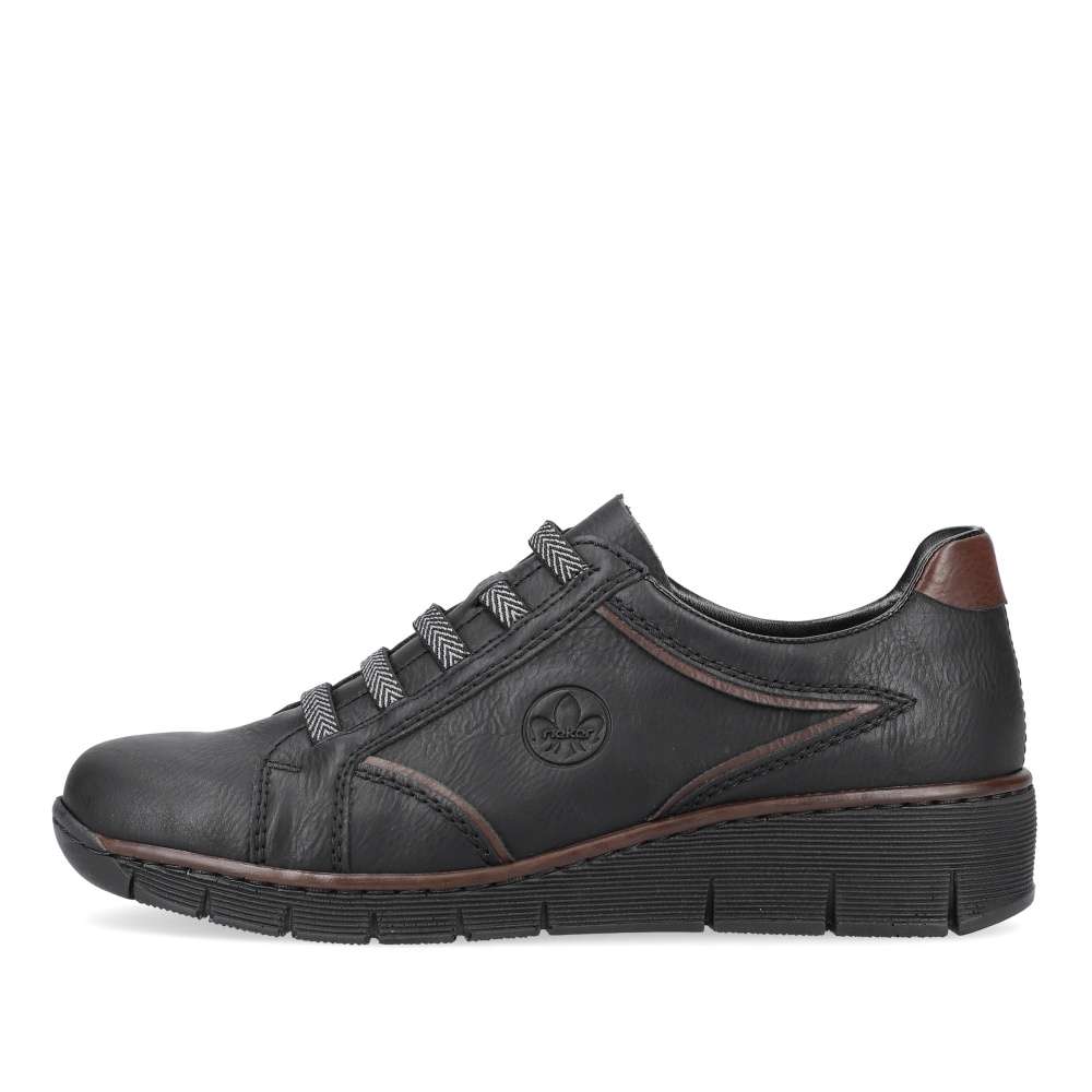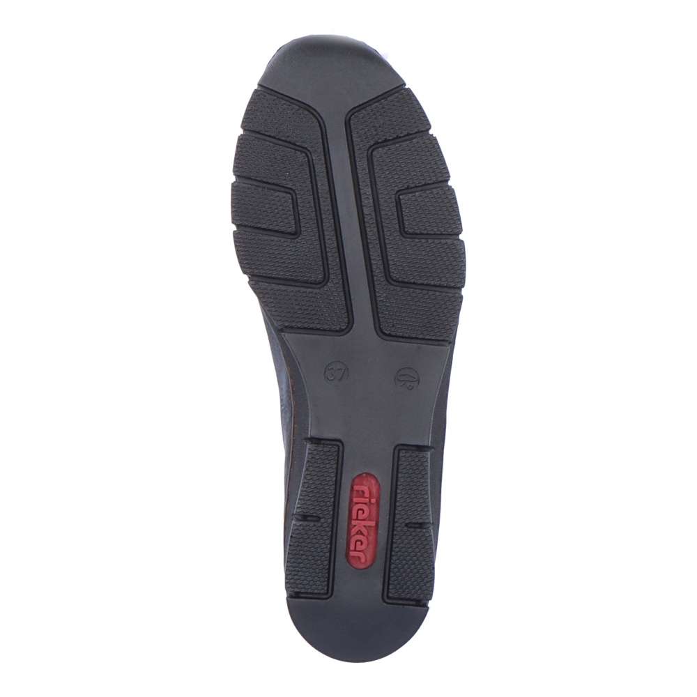 Těmto trendy teniskám od značky Rieker zkrátka nejde odolat. Svršek z kombinovaných materiálů v černé barvě je zdoben logem značky na vnější straně a několika hnědými prvky. Teniska je bez uzavírání, stačí nazout a můžete vyrazit. Lehce vyvýšená podešev v oblasti paty dodává tenisce na eleganci. Měkká stélka slibuje pohodlí na každém kroku. Ať už vyrazíte za prací či zábavou, budete vypadat perfektně.