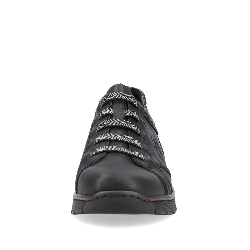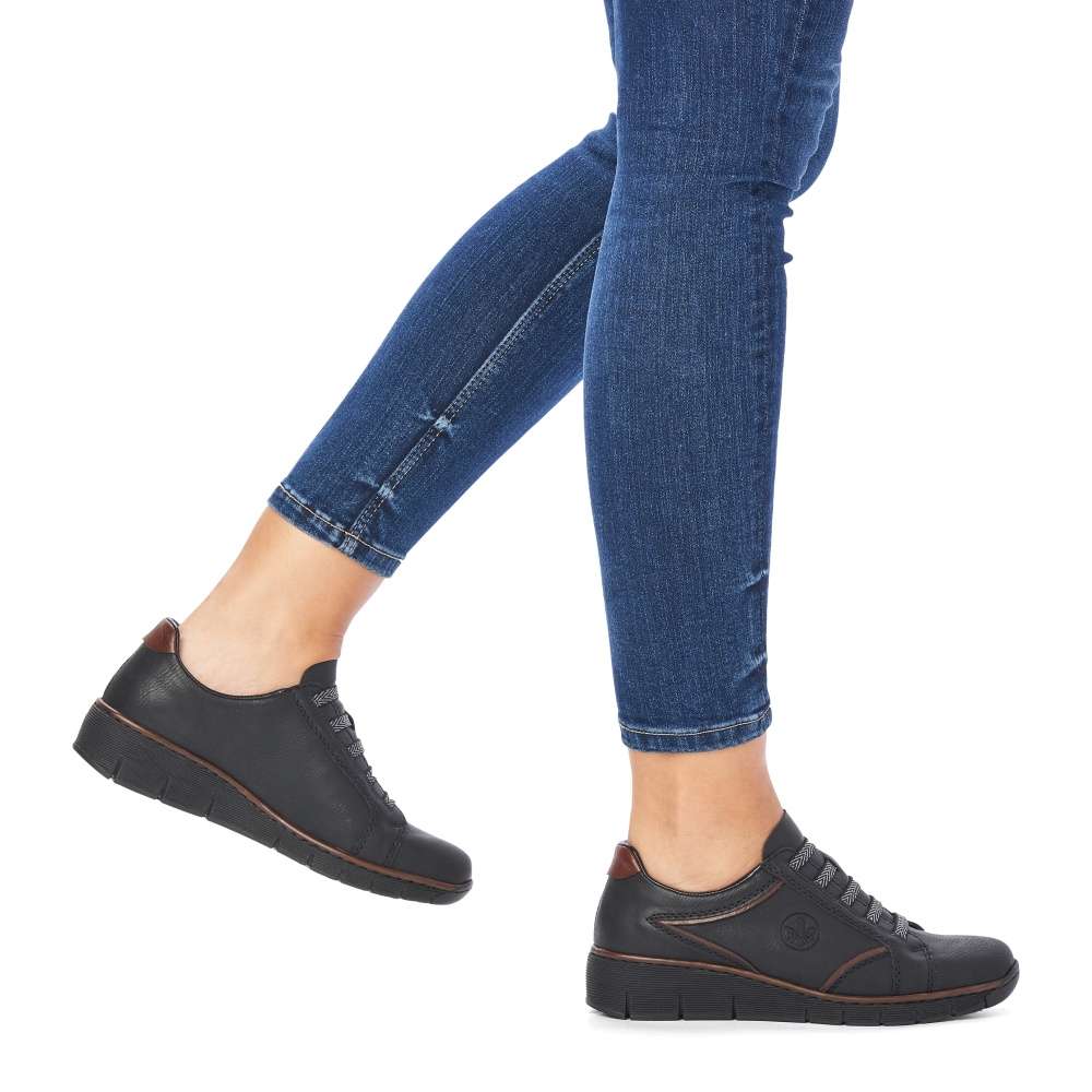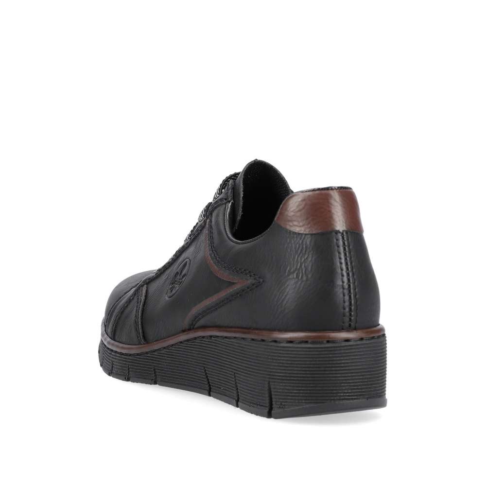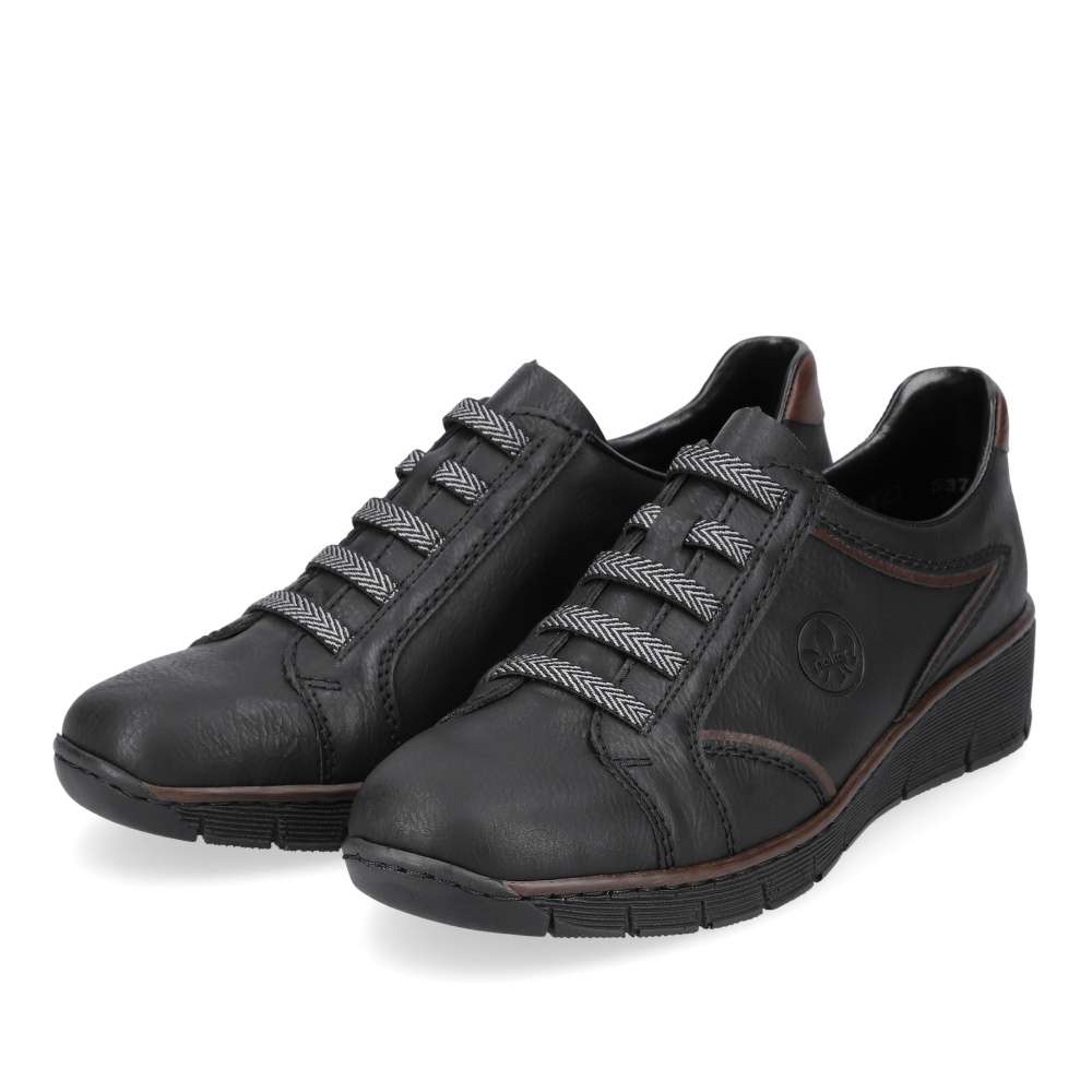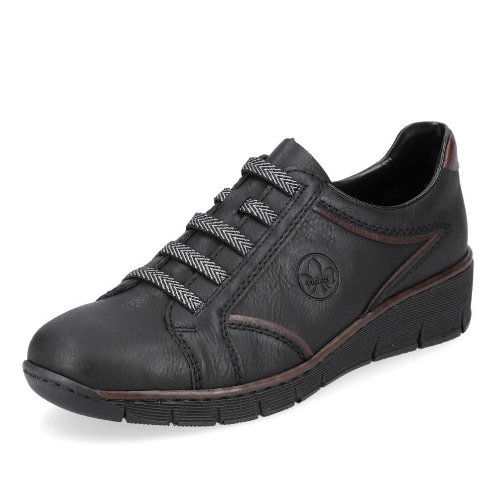 Těmto trendy teniskám od značky Rieker zkrátka nejde odolat. Svršek z kombinovaných materiálů v černé barvě je zdoben logem značky na vnější straně a několika hnědými prvky. Teniska je bez uzavírání, stačí nazout a můžete vyrazit. Lehce vyvýšená podešev v oblasti paty dodává tenisce na eleganci. Měkká stélka slibuje pohodlí na každém kroku. Ať už vyrazíte za prací či zábavou, budete vypadat perfektně.