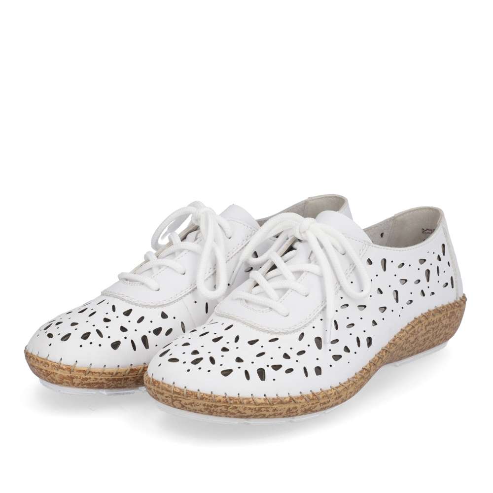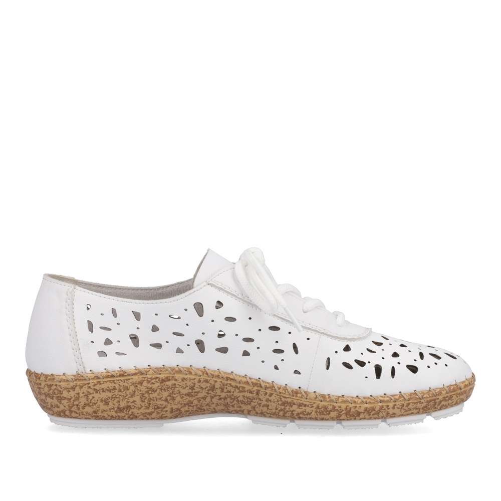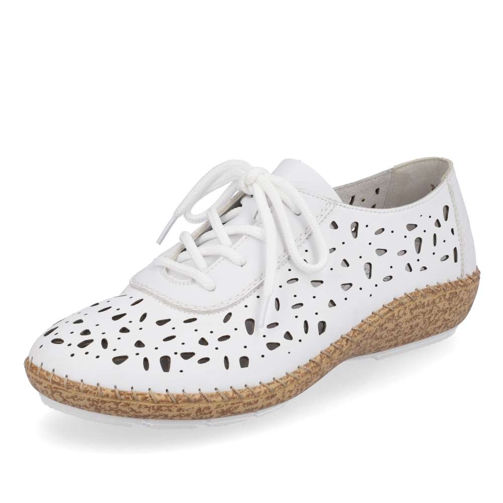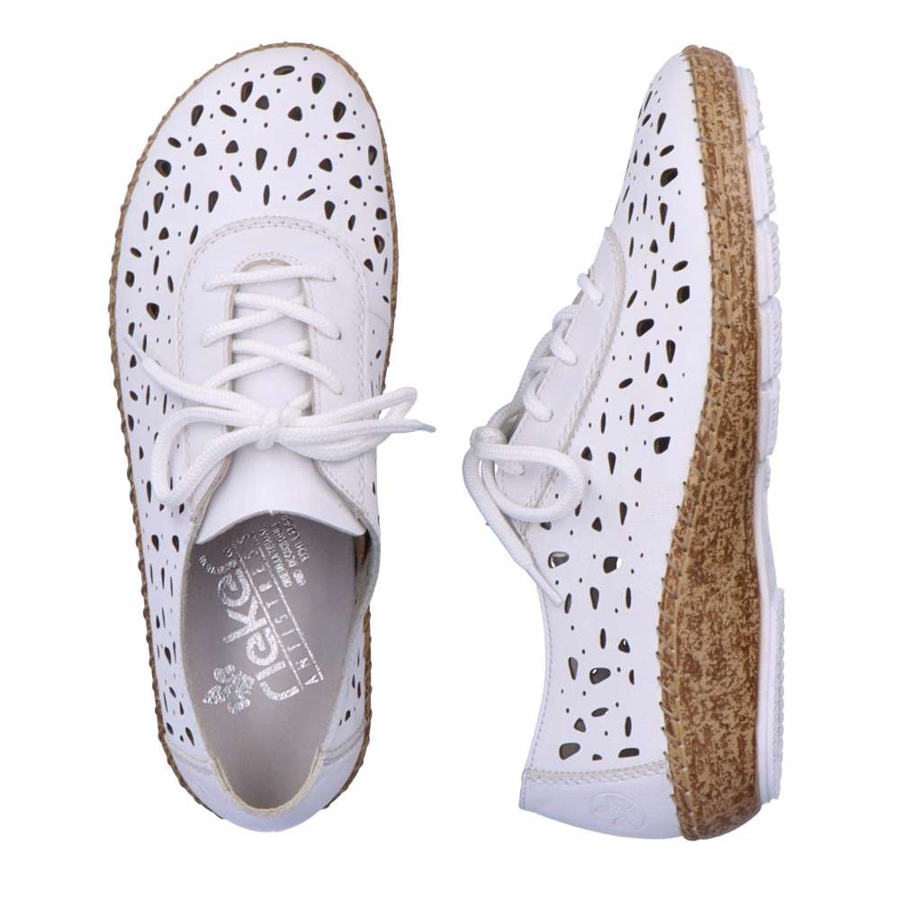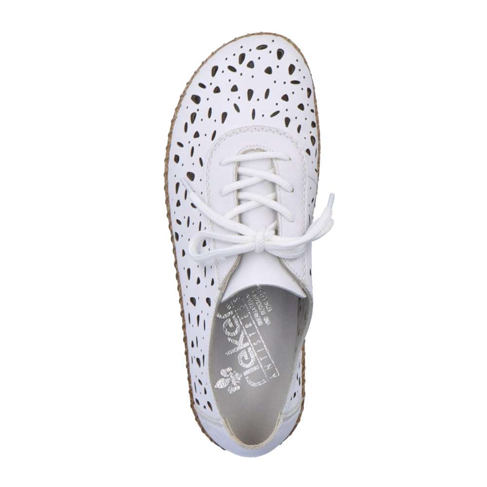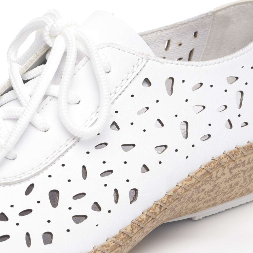 Designové boty RIEKER okouzlí vzhledem i pohodlím, kterého jsou zárukou. Svršek je ozdoben vzorem a perforací pro odvětrávání během letních dnů. Pro snadné obutí a přizpůsobení se noze zde je šněrování. Každým krokem oceníte flexibilní podešev, už jen si vybrat kam v nich vykročíte – práce či zábava? Technologie: Antistress – podešev je díky této technologii lehká, flexibilní, absorbuje nárazy při došlapu a snadno se přizpůsobí každé noze.